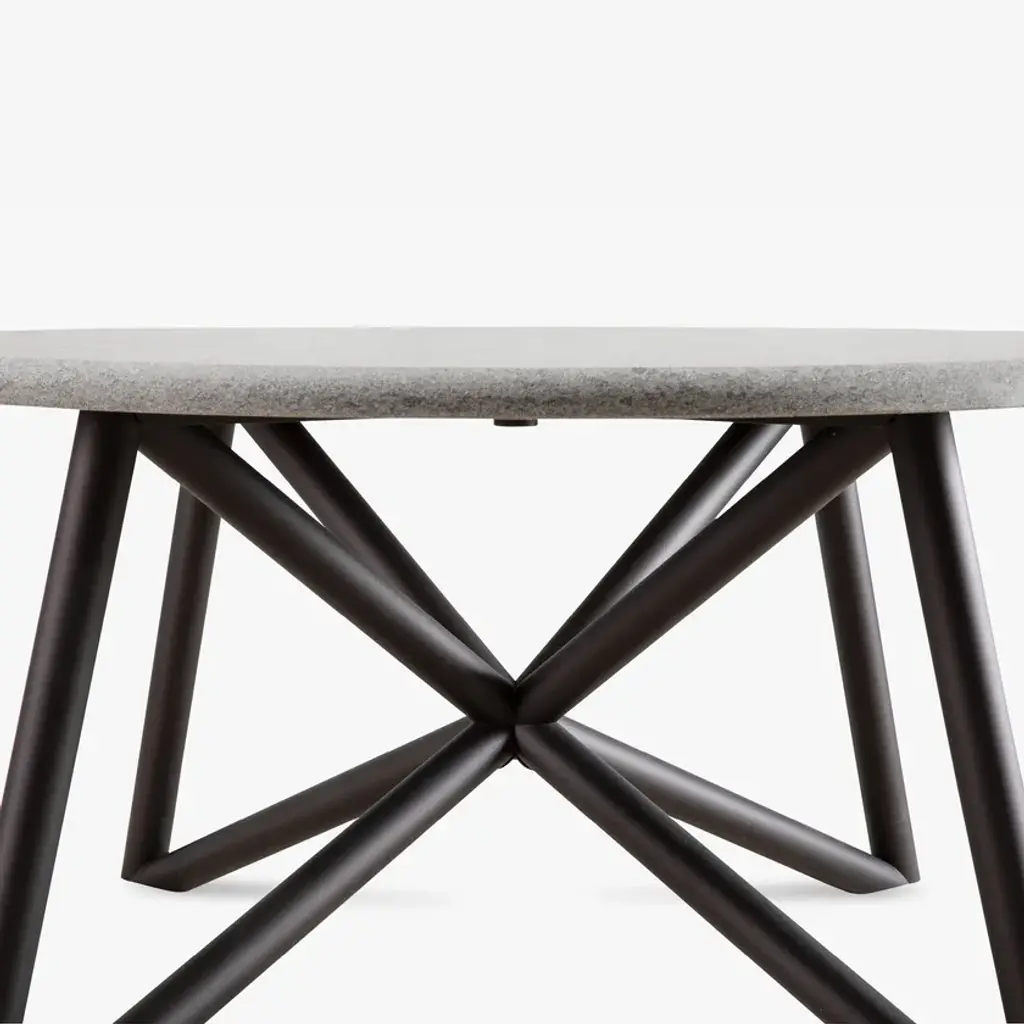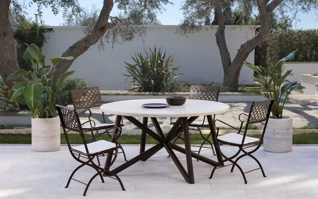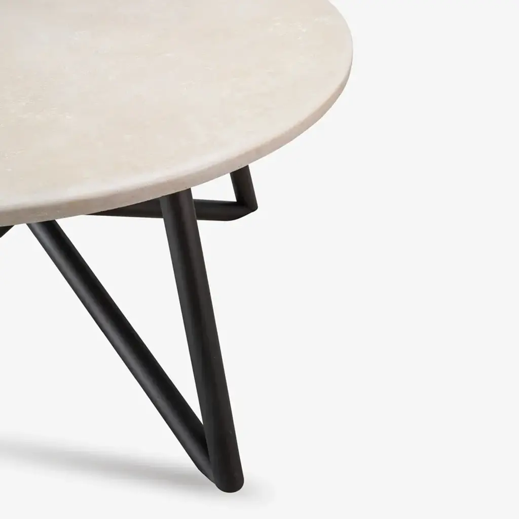 Uni is a round table without a central tray which combines harmoniously its forms to evoke a sense of perfect balance and harmony. The top is available in peperino, travertine, or marble, while the base is manufactured in white iron in the marble version or painted in a warm brown hue for versions with either peperino or travertine tops. Simplicity and refinement come together in a unique piece, perfect for any setting.Main table top: circular topTable base: Intertwined galvanized steel tubes, dark brown color, powder-coated with thermosetting powders for outdoor use. Stone: Travertine, limestone with stuccoed and smoothed surface. Treated with stain and rain-resistant products. Details: the edge has a rounded finish.Cutting and welding with state-of-the-art numerically controlled work tools.