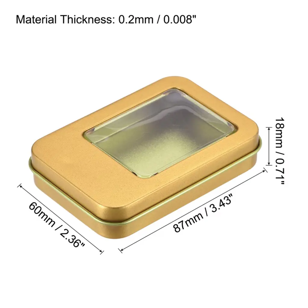 This rectangular tin box is made of sturdy tinplate, ensuring durability and resistance to rust. The clear window lid allows for easy visibility of contents without opening the box. Its compact size makes it ideal for travel, camping, and organising small items. The refined design features round edges for safety and ease of use. Suitable for home, office, or workshop storage, these boxes can hold various small items and are perfect for DIY crafts.
