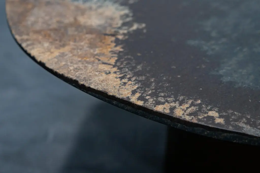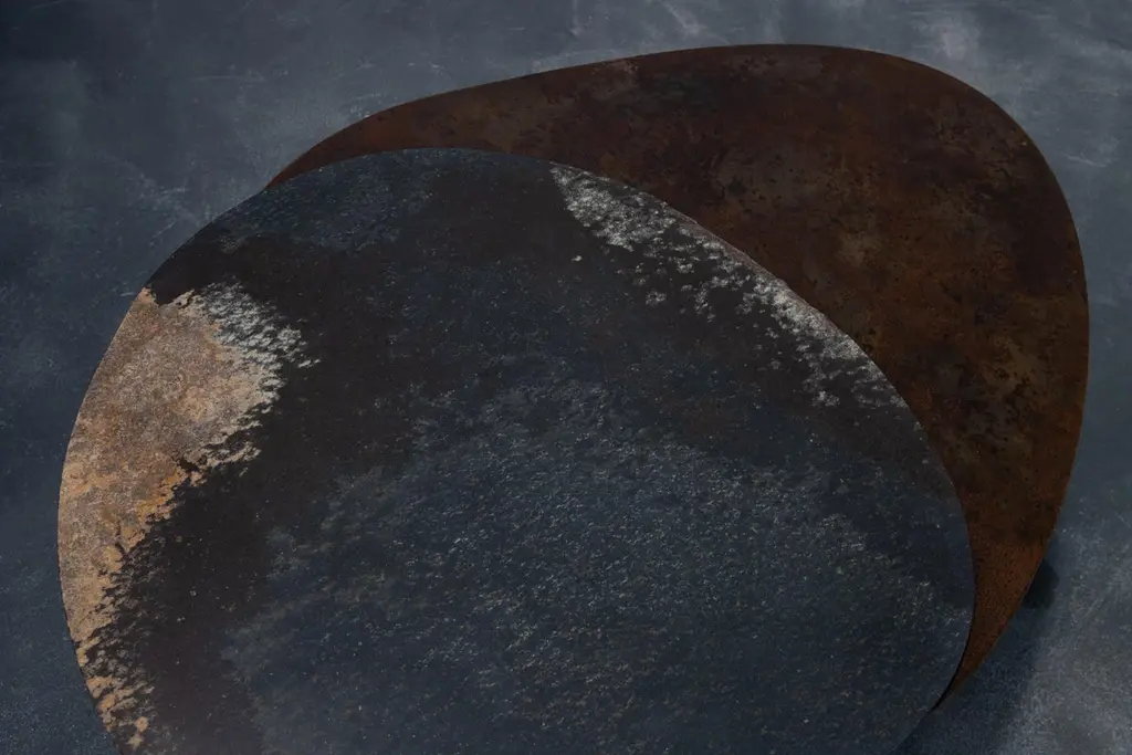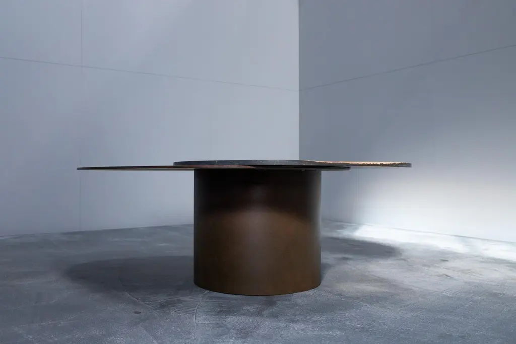 Unique Kon Pac low table - Daté Kan stone sculptural design by OkurayamaDesign by Takasuke YamadaMaterial: Daté Kan Stone and oxidized metalSculpted in the Okurayama's Studio in Miyagi's Prefecture, JapanEach creation is unique and signed.Made to order dimensions can be created.Dimensions: 102 x 86 x 36 cmSuitable to use outdoors. The Daté Kan Stone is a rare stone that exist only in a few mountains in Japan.The defining characteristic of Date´ Kan Stone is that its surface and interior are completely different in appearance. Just when you think the surface is ocher in color, rust-colored sections and reddish-brown streaks like those found on Bizen pottery will appear. No two pieces have the same appearance. The stone’s interior, however, is a uniformly dark-gray color with rusty hues that slowly become more prominent as the years go by. That contrast can be utilized to produce a stone that looks like none other in the world; gorgeous ocher and reddish-brown sections are left partially visible while cut edges are polished to a glossy sheen. This unique process of shaping the stone’s appearance leverages the experience and aesthetic sense that Okurayama Studio has developed through our interaction with a multitude of creators.Date´ Kan Stone is a kind of basalt / igneous rock known as two-pyroxene basaltic andesite that was created around 20 million years ago. It has a dense grain and high specific gravity due to its significant iron content, which makes it resistant to water and gives it a brilliant luster when polished.Visitors to the Okurayama quarry can observe raw Date´ Kan ore in a variety of forms such as the columnar joints that protrude from the Earth’s surface and the weathered round boulders that are mined from it. Columnar joints are created when cooling magma hardens and contracts, generating fissures on the cooled surface which then spread internally in the vertical direction. The rusty color characteristic of Okurayama’s stone is believed to be the result of air and moisture penetrating these fissures and oxidizing the iron content of the columnar joints on the two occasions when the area sunk to the ocean floor due to shifts in the Earth’s crust.Cutting the Date´ Kan ore in sections parallel to the joints gives it sculpted shapes that provide a wealth of inspiration even in their unprocessed forms. The wholly unique form and appearance of Date´ Kan Stone continues to fascinate architects, artists, and designers both within Japan and abroad.At Okurayama Studio, the highly skilled staff handles the entire process of quarrying, processing, and shaping our Date´ Kan Stone, which is internationally renowned for its unique appearance.