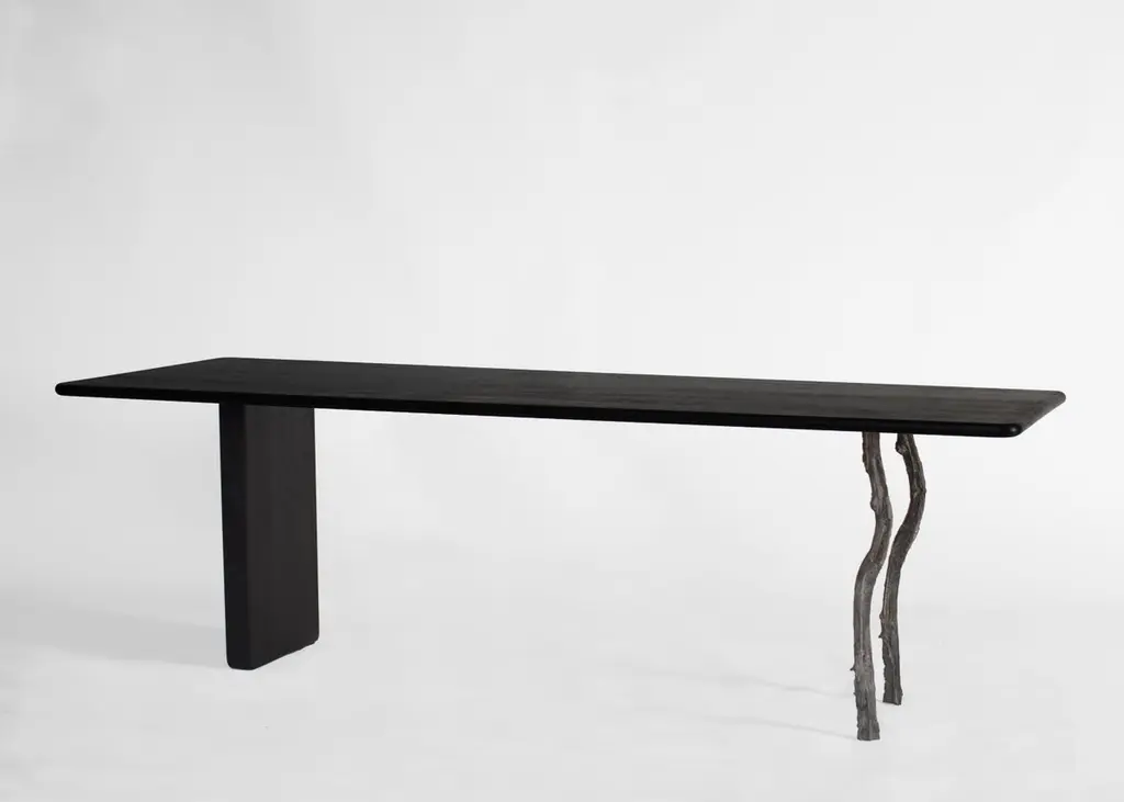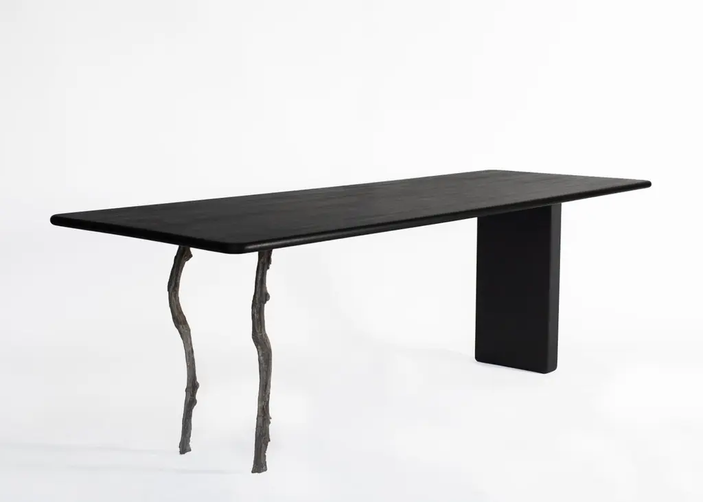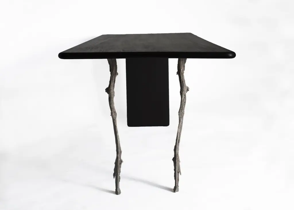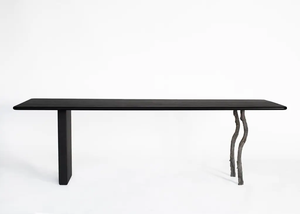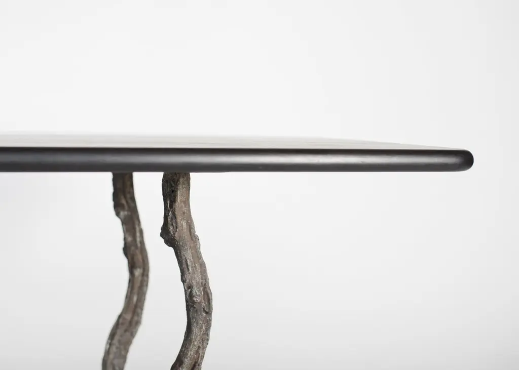Unique rectangular treebone table by Jesse SandersonEdition of 8Dimensions: W 240 x D 80 x H 75 cmMaterial: Caramelized bamboo, bronzeOver the years Sanderson has carefully selected old branches of acacia wood. They inspired the design of the Treebone table. A table that at first appears simple and elegant by the use of warm but sober materials, comes to life as soon as you notice its vivacious bronze legs. Legs that form a playful pattern of different lines and dimensions each time you look at them from a different angle, leaving the design with anthropomorphic features. Although the two branches appear to be asymmetric, they actually show full symmetr y when you stand directly in front of the table. The branches used have been cast in bronce immortalizing their lifelike contortions and story.Treebone presents an outspoken visual ensemble for contemporar y living that combines nature and modernity.