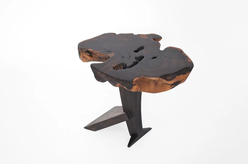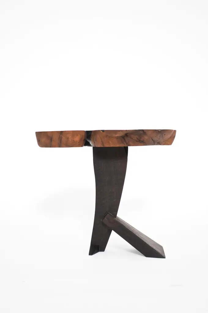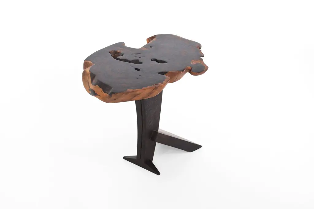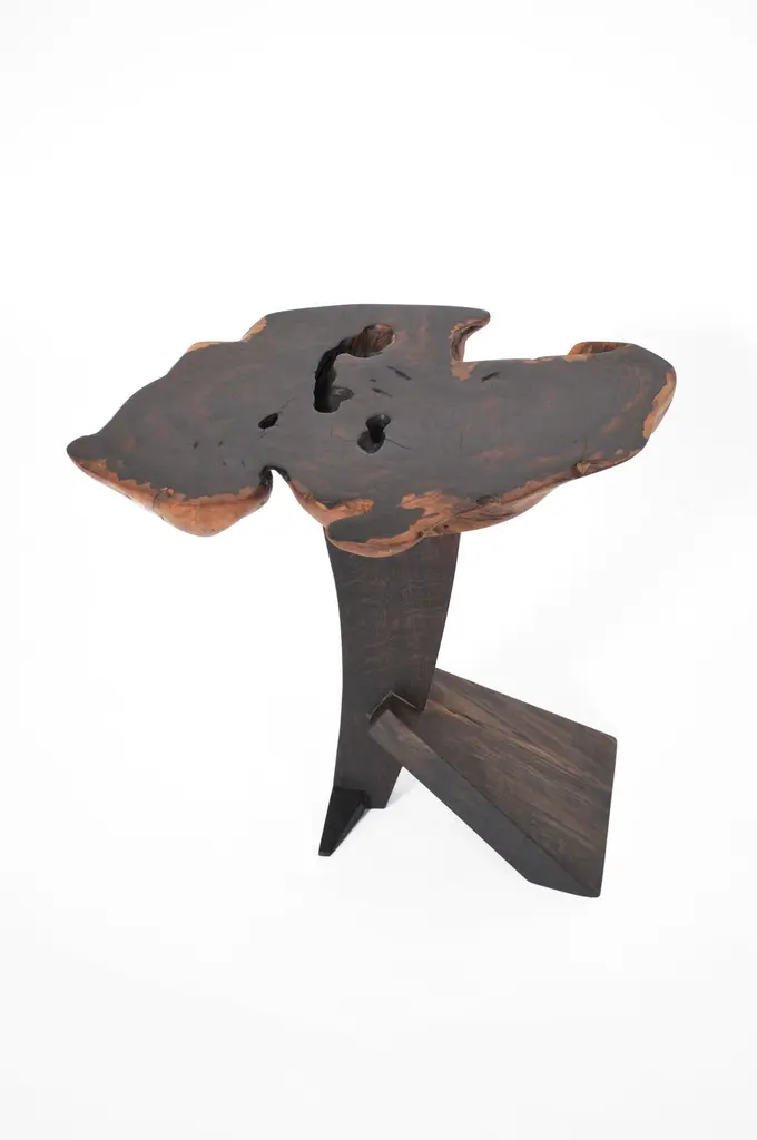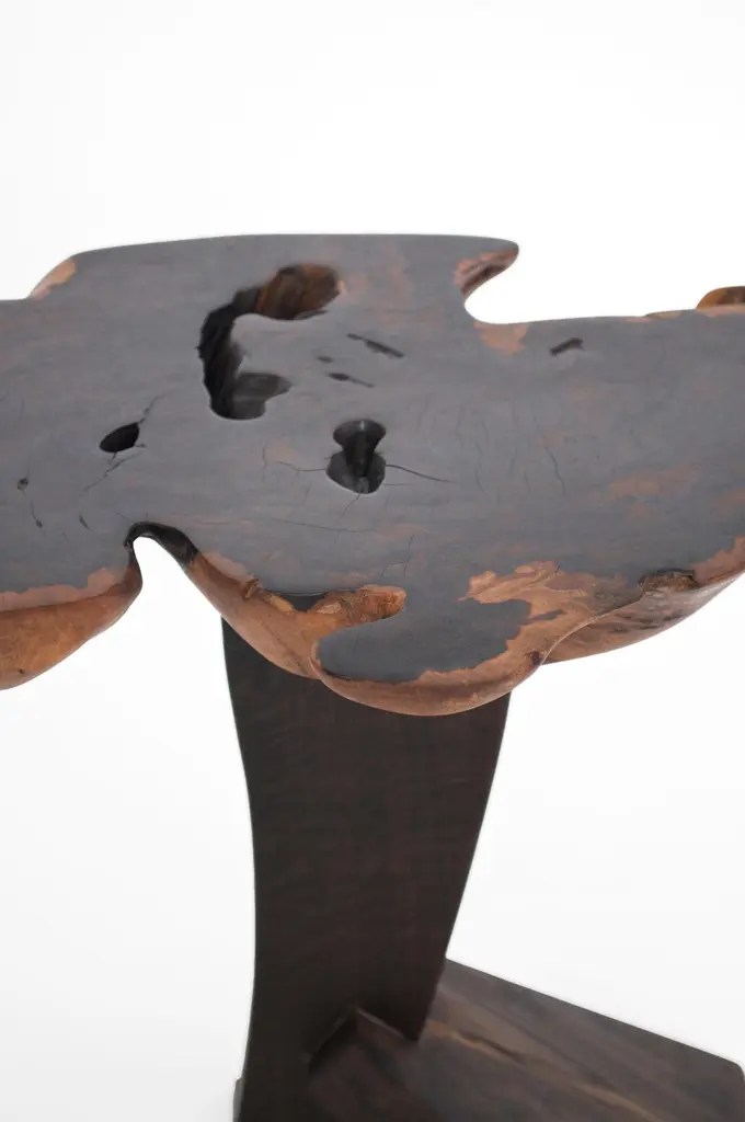 Unique signed table by Jörg Pietschmann T2551 Materials: Zirikote, Bog oak, polished oil finishMeasures: H 42 x W 50 x D 42 cm In Pietschmann’s sculptures, trees that for centuries were part of a landscape and founded in primordial forces tell stories inscribed in the memory of their fibers.The forms Jörg Pietschmann pares from ancient trees are extensive and astonish with their physical presence, a combination of elegance and primeval nature. Pietschmann’s sculptures are monuments to the trees from which they derive.Being endowed with the ruggedness of primeval matter gives them a veritable vitality: figures that appear to have grown into their sculptural form of their own accord. But Pietschmann’s tangibly present bodies have undergone a considerable degree of metamorphosis.In order to generate these unique tree specimens he examines the tree’s morphology and intrinsic inner map until the courses of its grain, of a curve, knots and cracks concur with his projections. The exploratory process is accompanied by constant modification, giving at the start of each new piece no more than an intimation of the figure that will later emerge. In their completion, Pietschmann’s sculptures once more become universal form.