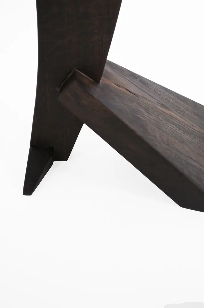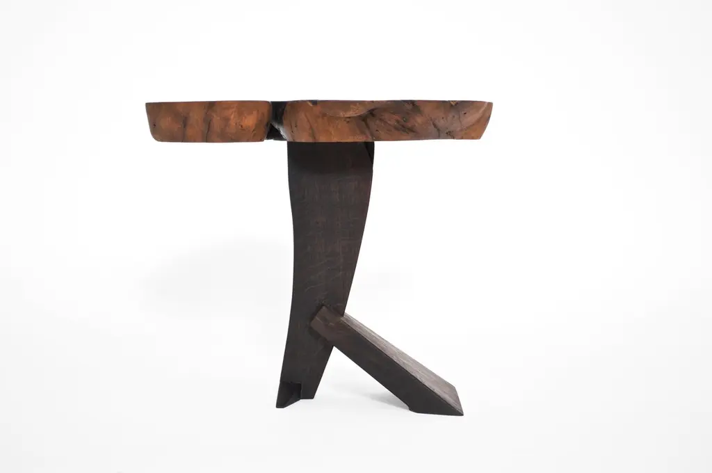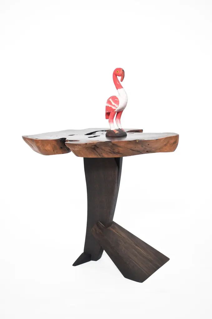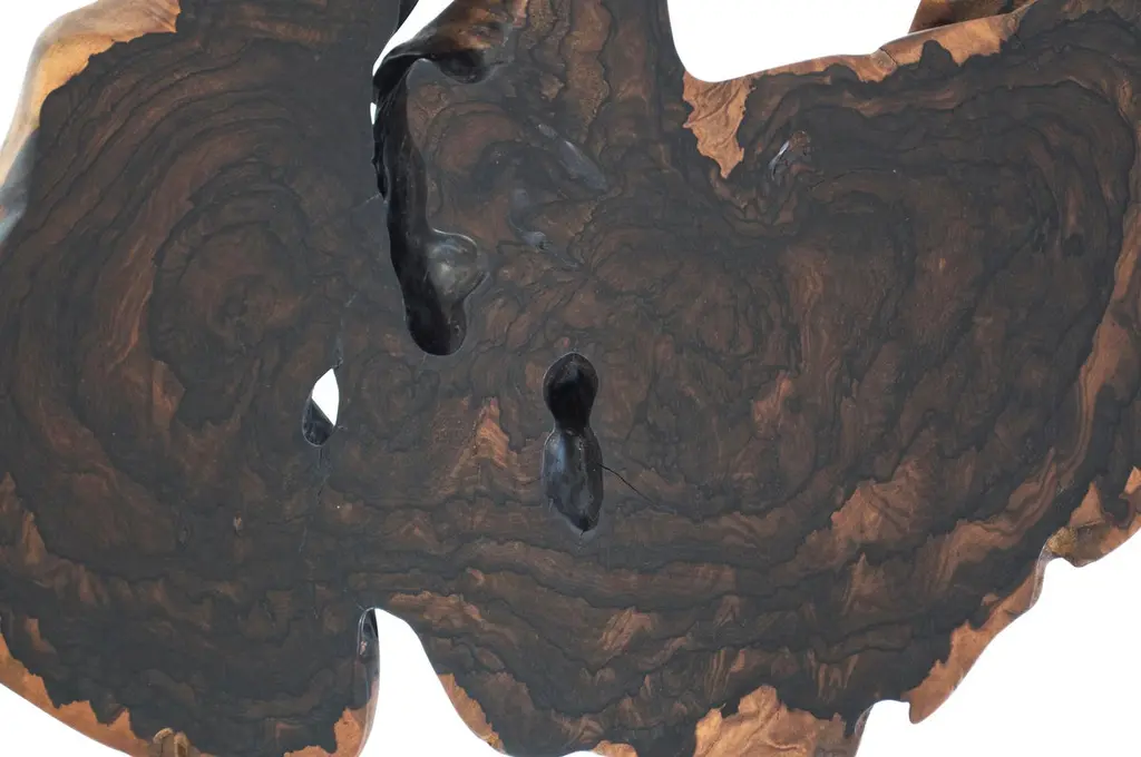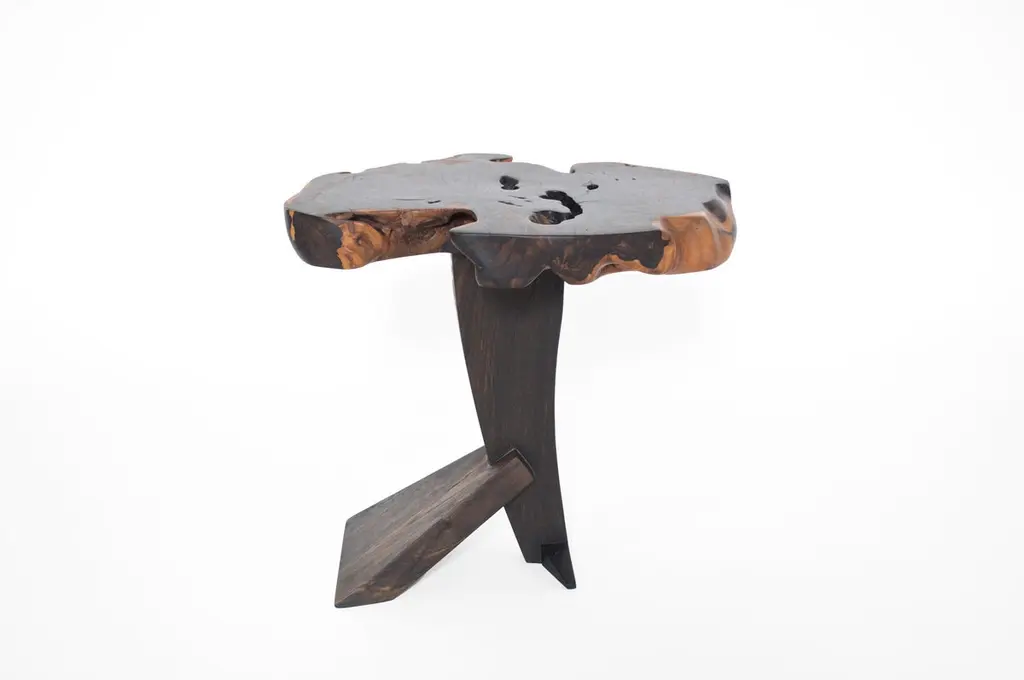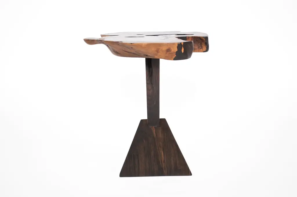 Unique signed table by Jörg Pietschmann T2551 Materials: Zirikote, Bog oak, polished oil finishMeasures: H 42 x W 50 x D 42 cm In Pietschmann’s sculptures, trees that for centuries were part of a landscape and founded in primordial forces tell stories inscribed in the memory of their fibers.The forms Jörg Pietschmann pares from ancient trees are extensive and astonish with their physical presence, a combination of elegance and primeval nature. Pietschmann’s sculptures are monuments to the trees from which they derive.Being endowed with the ruggedness of primeval matter gives them a veritable vitality: figures that appear to have grown into their sculptural form of their own accord. But Pietschmann’s tangibly present bodies have undergone a considerable degree of metamorphosis.In order to generate these unique tree specimens he examines the tree’s morphology and intrinsic inner map until the courses of its grain, of a curve, knots and cracks concur with his projections. The exploratory process is accompanied by constant modification, giving at the start of each new piece no more than an intimation of the figure that will later emerge. In their completion, Pietschmann’s sculptures once more become universal form.