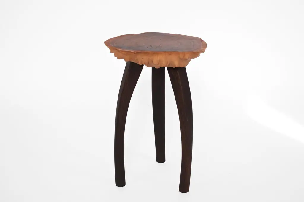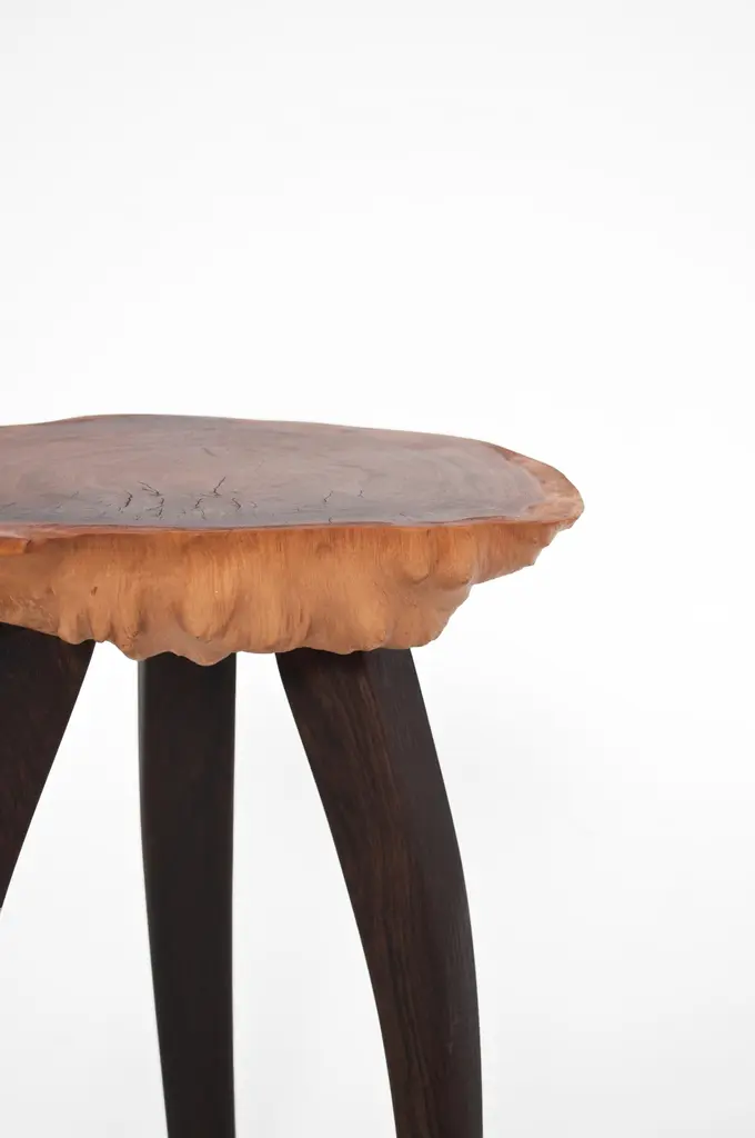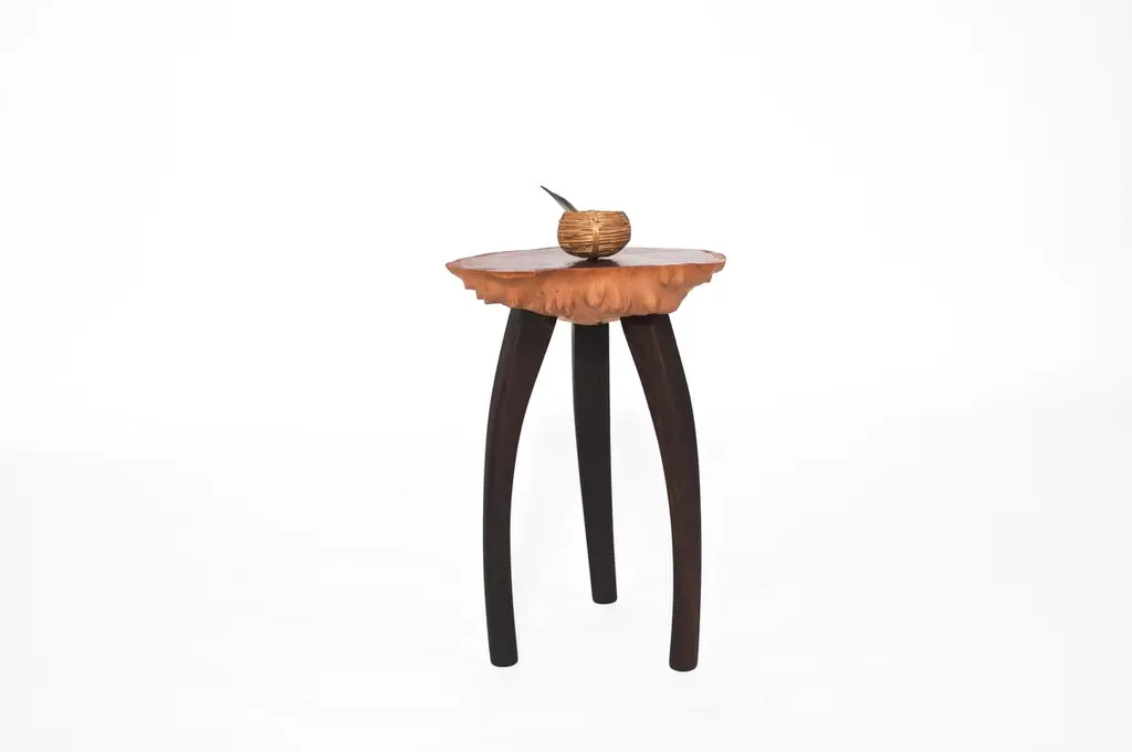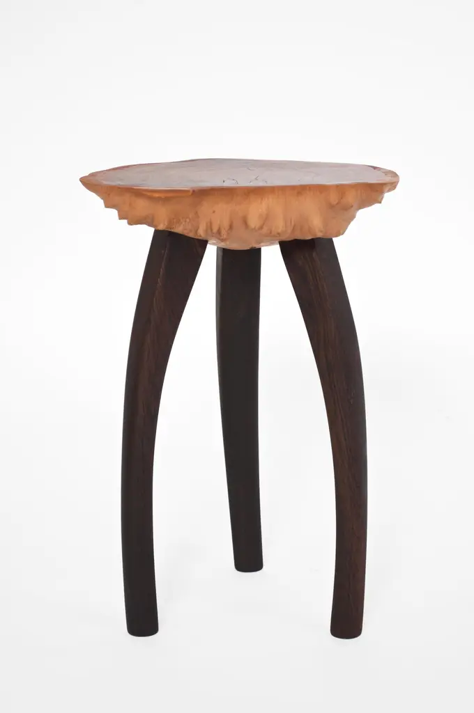 Unique signed table by Jörg Pietschmann T2571 Materials: Goldfield burl, smoked oak, polished oil finishMeasures: H 49 x W 39 x D 31 cm In Pietschmann’s sculptures, trees that for centuries were part of a landscape and founded in primordial forces tell stories inscribed in the memory of their fibers.The forms Jörg Pietschmann pares from ancient trees are extensive and astonish with their physical presence, a combination of elegance and primeval nature. Pietschmann’s sculptures are monuments to the trees from which they derive.Being endowed with the ruggedness of primeval matter gives them a veritable vitality: figures that appear to have grown into their sculptural form of their own accord. But Pietschmann’s tangibly present bodies have undergone a considerable degree of metamorphosis.In order to generate these unique tree specimens he examines the tree’s morphology and intrinsic inner map until the courses of its grain, of a curve, knots and cracks concur with his projections. The exploratory process is accompanied by constant modification, giving at the start of each new piece no more than an intimation of the figure that will later emerge. In their completion, Pietschmann’s sculptures once more become universal form.