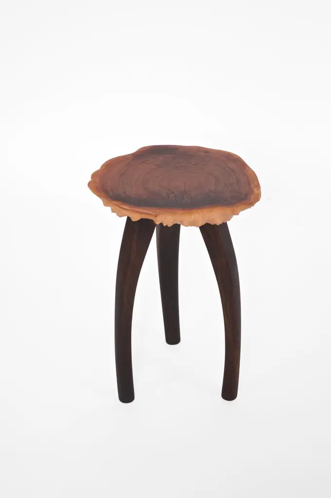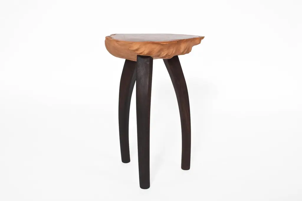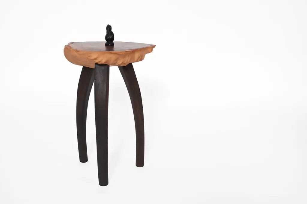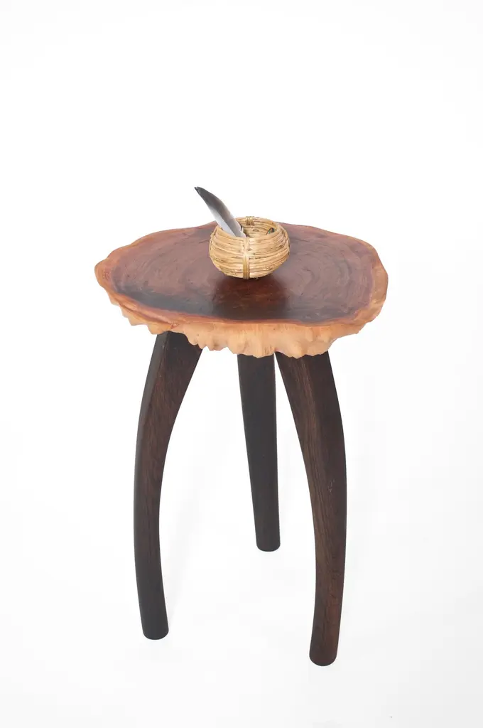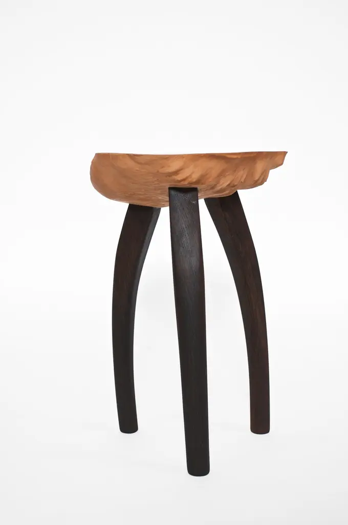 Unique signed table by Jörg Pietschmann T2571 Materials: Goldfield burl, smoked oak, polished oil finishMeasures: H 49 x W 39 x D 31 cm In Pietschmann’s sculptures, trees that for centuries were part of a landscape and founded in primordial forces tell stories inscribed in the memory of their fibers.The forms Jörg Pietschmann pares from ancient trees are extensive and astonish with their physical presence, a combination of elegance and primeval nature. Pietschmann’s sculptures are monuments to the trees from which they derive.Being endowed with the ruggedness of primeval matter gives them a veritable vitality: figures that appear to have grown into their sculptural form of their own accord. But Pietschmann’s tangibly present bodies have undergone a considerable degree of metamorphosis.In order to generate these unique tree specimens he examines the tree’s morphology and intrinsic inner map until the courses of its grain, of a curve, knots and cracks concur with his projections. The exploratory process is accompanied by constant modification, giving at the start of each new piece no more than an intimation of the figure that will later emerge. In their completion, Pietschmann’s sculptures once more become universal form.