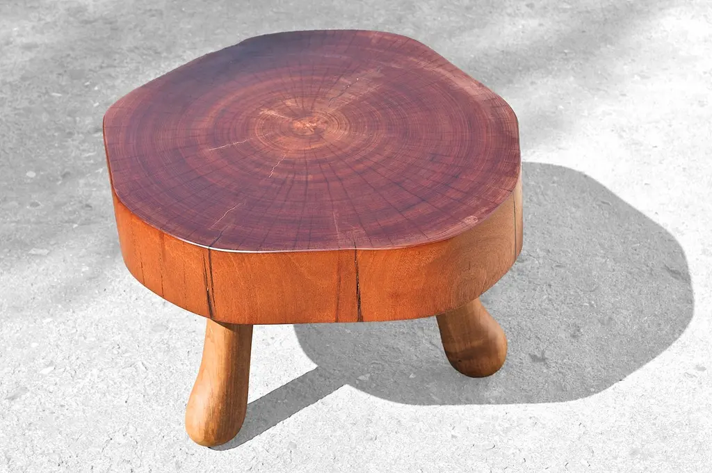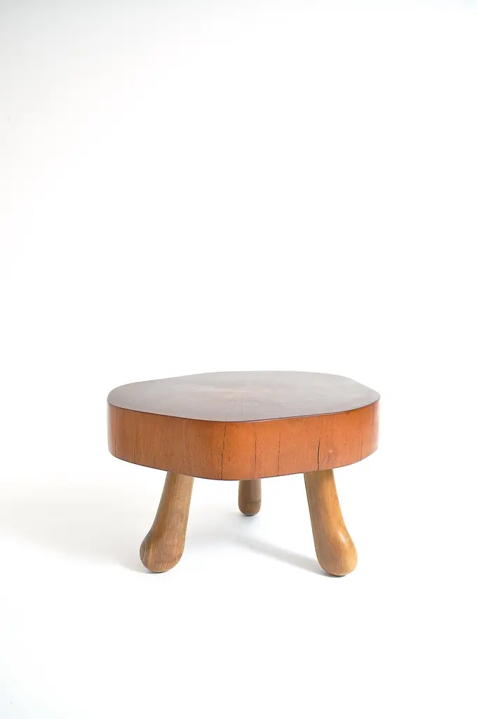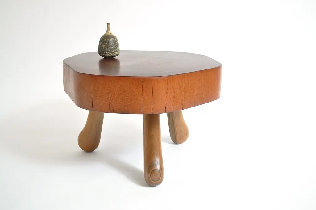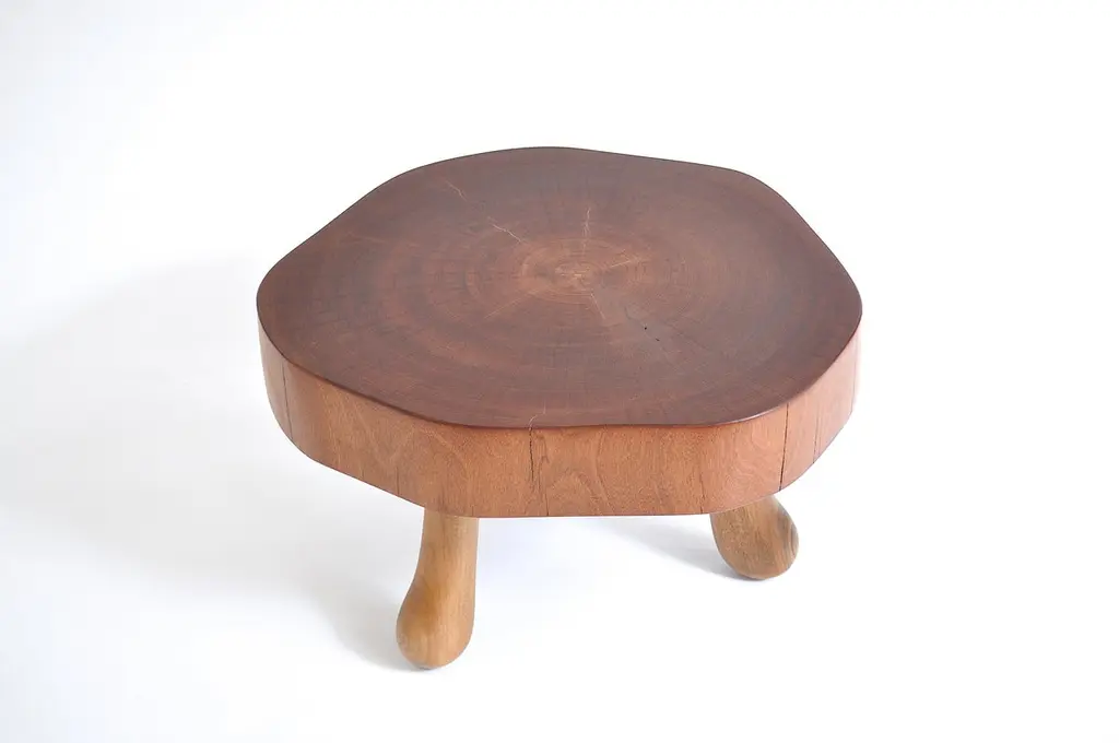 Unique signed table by Jörg PietschmannMaterials: Padouk, European Walnut Measures: W 63 x D 63 x H 40 cmIn Pietschmann’s sculptures, trees that for centuries were part of a landscape and founded in primordial forces tell stories inscribed in the memory of their fibers.The forms Jörg Pietschmann pares from ancient trees are extensive and astonish with their physical presence, a combination of elegance and primeval nature. Pietschmann’s sculptures are monuments to the trees from which they derive.Being endowed with the ruggedness of primeval matter gives them a veritable vitality: figures that appear to have grown into their sculptural form of their own accord. But Pietschmann’s tangibly present bodies have undergone a considerable degree of metamorphosis.In order to generate these unique tree specimens he examines the tree’s morphology and intrinsic inner map until the courses of its grain, of a curve, knots and cracks concur with his projections. The exploratory process is accompanied by constant modification, giving at the start of each new piece no more than an intimation of the figure that will later emerge. In their completion, Pietschmann’s sculptures once more become universal form.