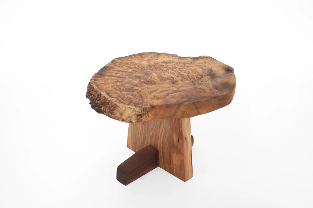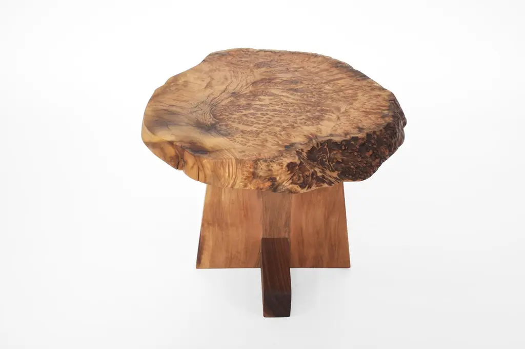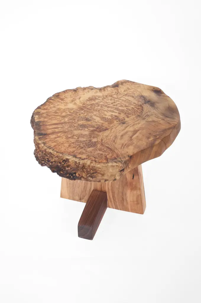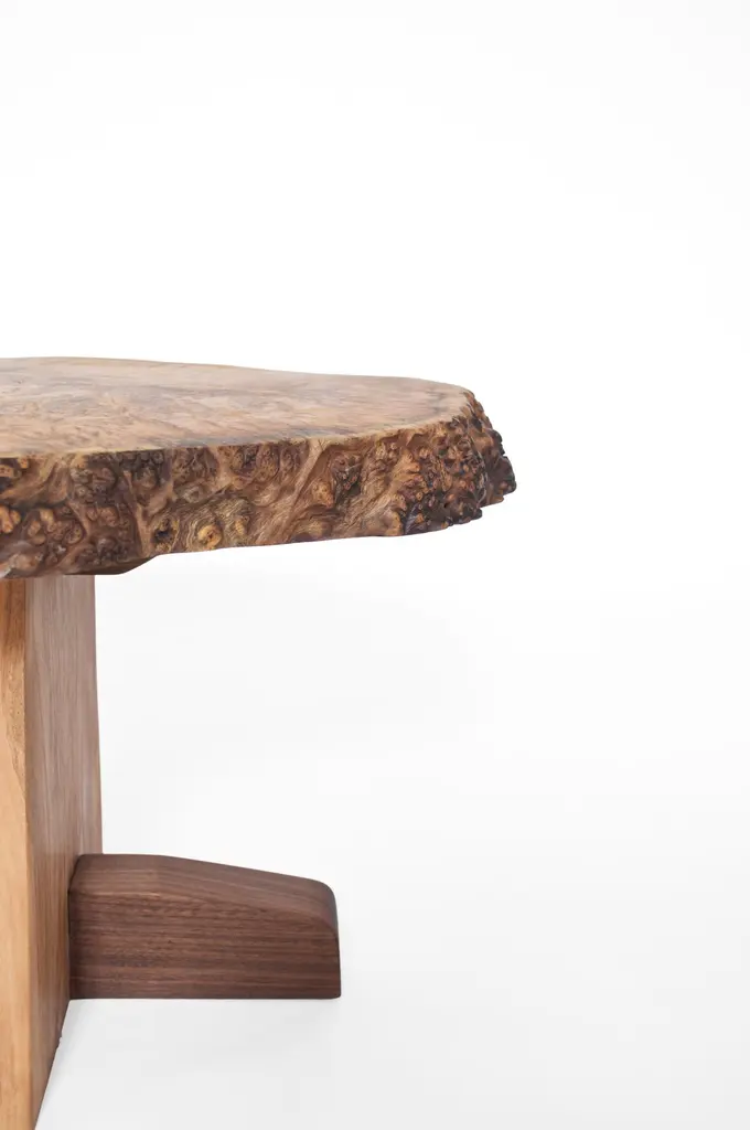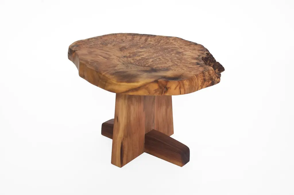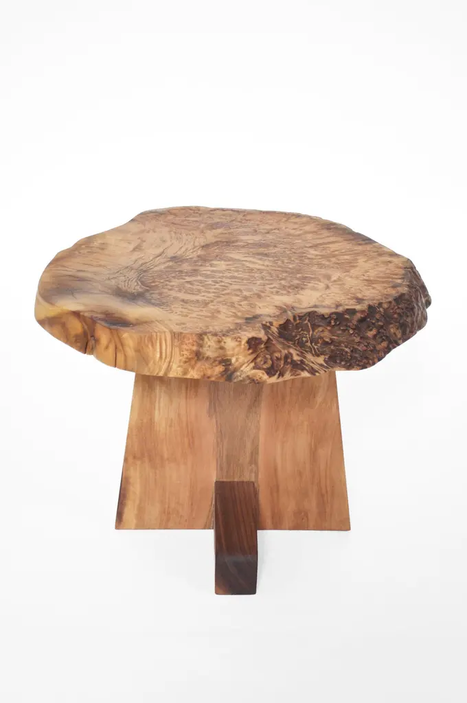 Unique signed table by Jörg Pietschmann T2561 Materials: Golden Matrone, Europe walnut, polished oil finishMeasures: H 38,5 W 56 x D 49 cmIn Pietschmann’s sculptures, trees that for centuries were part of a landscape and founded in primordial forces tell stories inscribed in the memory of their fibers.The forms Jörg Pietschmann pares from ancient trees are extensive and astonish with their physical presence, a combination of elegance and primeval nature. Pietschmann’s sculptures are monuments to the trees from which they derive.Being endowed with the ruggedness of primeval matter gives them a veritable vitality: figures that appear to have grown into their sculptural form of their own accord. But Pietschmann’s tangibly present bodies have undergone a considerable degree of metamorphosis.In order to generate these unique tree specimens he examines the tree’s morphology and intrinsic inner map until the courses of its grain, of a curve, knots and cracks concur with his projections. The exploratory process is accompanied by constant modification, giving at the start of each new piece no more than an intimation of the figure that will later emerge. In their completion, Pietschmann’s sculptures once more become universal form.