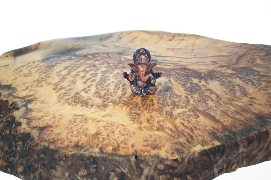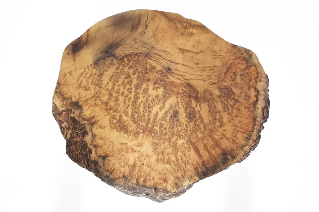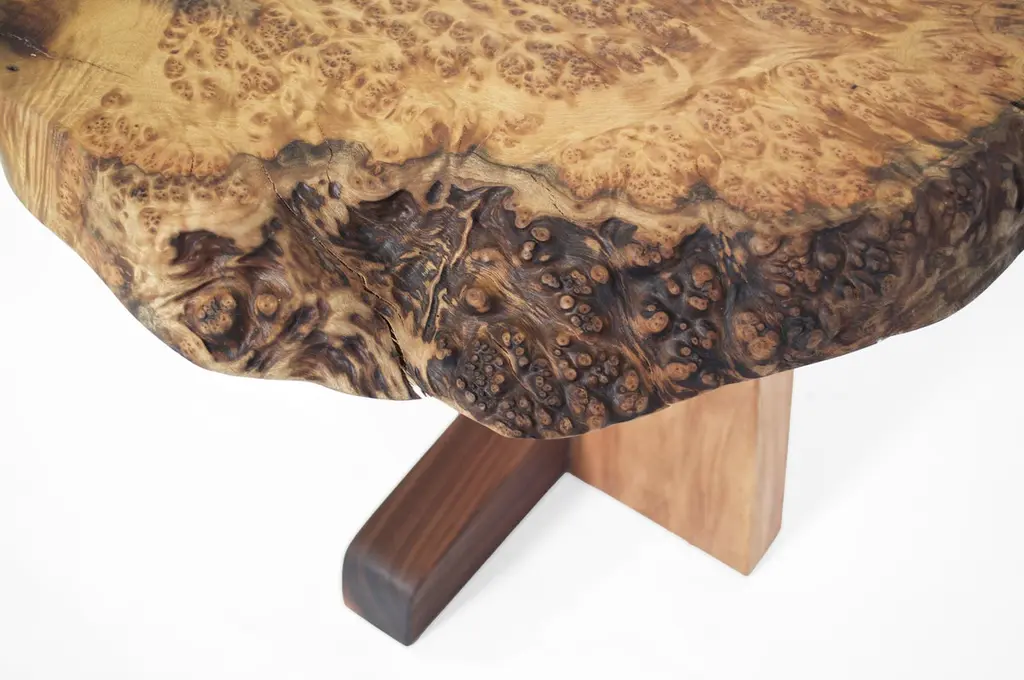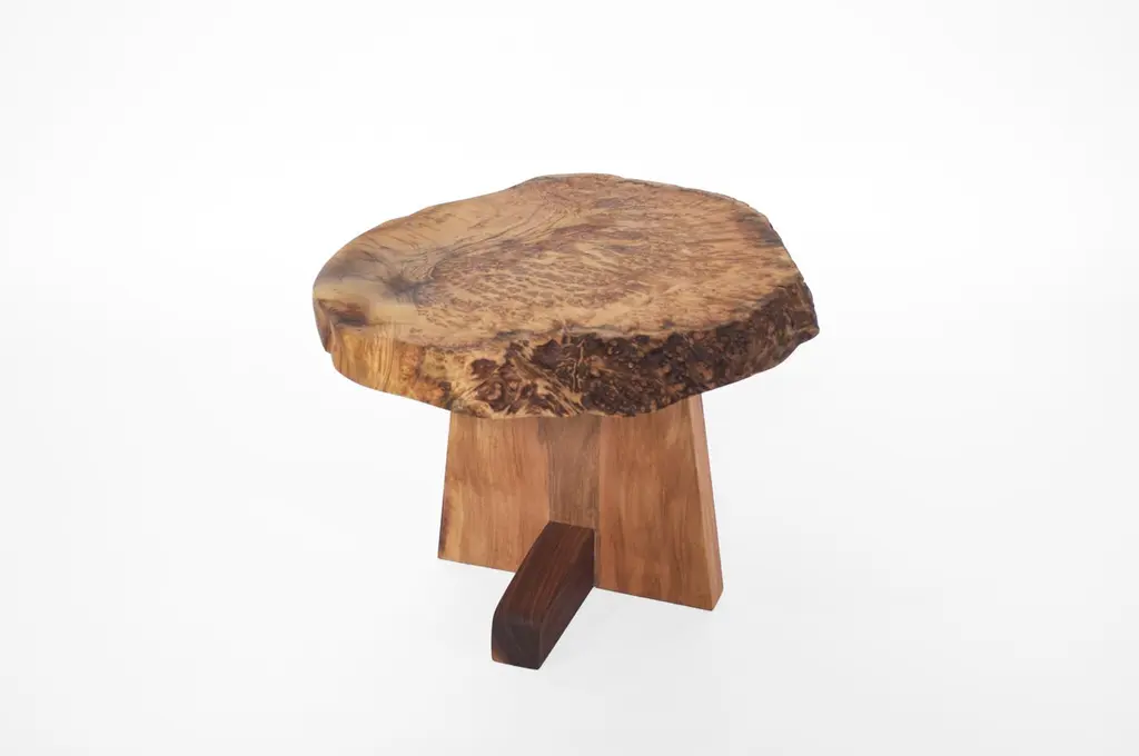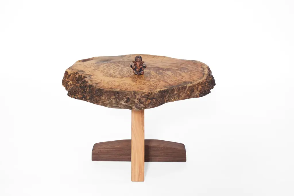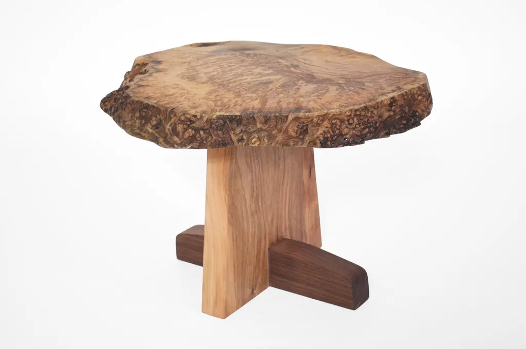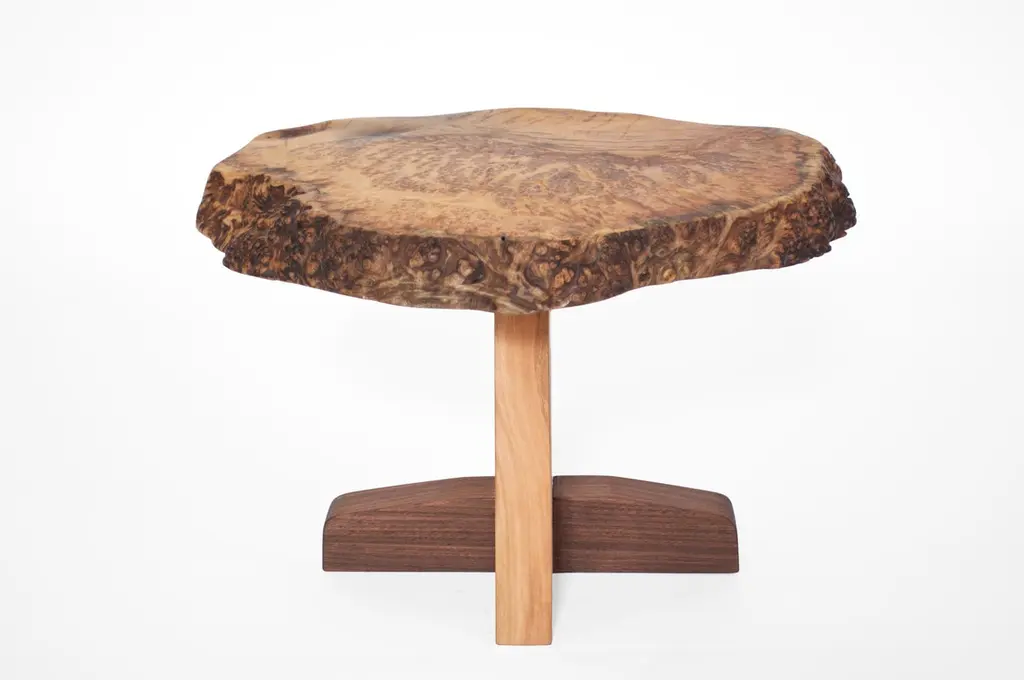 Unique signed table by Jörg Pietschmann T2561 Materials: Golden Matrone, Europe walnut, polished oil finishMeasures: H 38,5 W 56 x D 49 cmIn Pietschmann’s sculptures, trees that for centuries were part of a landscape and founded in primordial forces tell stories inscribed in the memory of their fibers.The forms Jörg Pietschmann pares from ancient trees are extensive and astonish with their physical presence, a combination of elegance and primeval nature. Pietschmann’s sculptures are monuments to the trees from which they derive.Being endowed with the ruggedness of primeval matter gives them a veritable vitality: figures that appear to have grown into their sculptural form of their own accord. But Pietschmann’s tangibly present bodies have undergone a considerable degree of metamorphosis.In order to generate these unique tree specimens he examines the tree’s morphology and intrinsic inner map until the courses of its grain, of a curve, knots and cracks concur with his projections. The exploratory process is accompanied by constant modification, giving at the start of each new piece no more than an intimation of the figure that will later emerge. In their completion, Pietschmann’s sculptures once more become universal form.