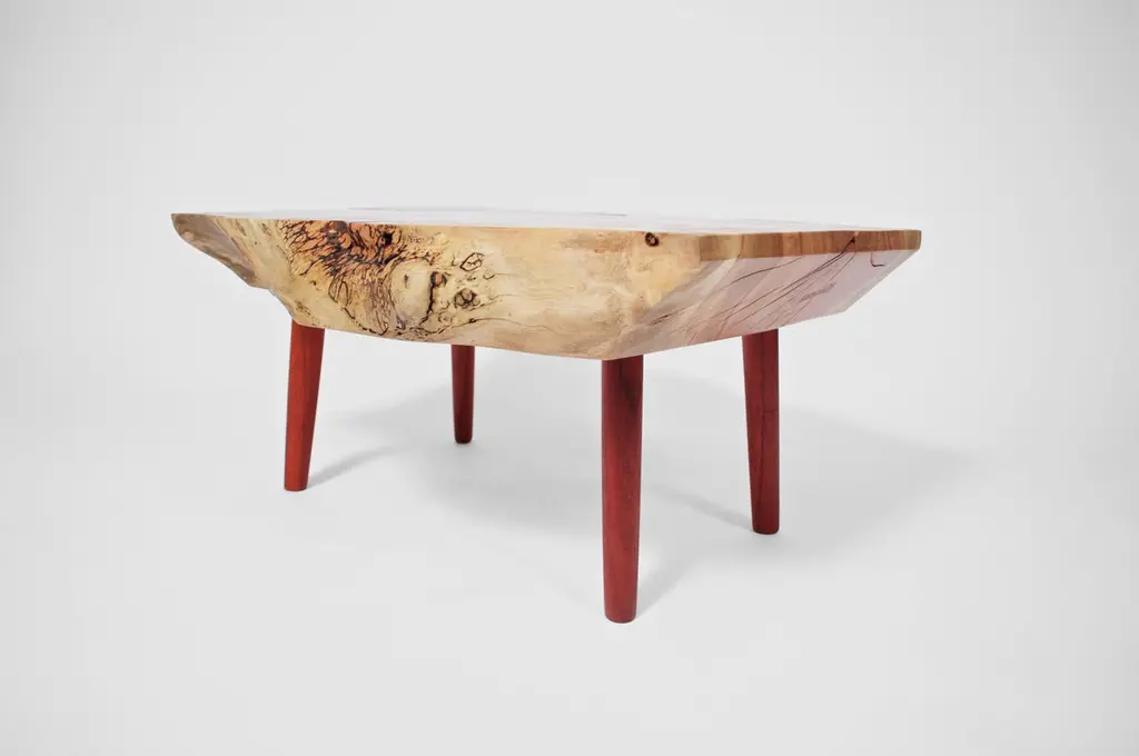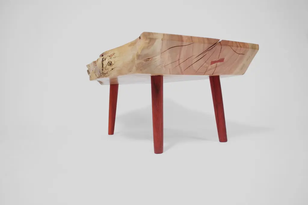 Unique signed table by Jörg PietschmannMaterials: Norway maple, PadoukMeasures: H 38 x W 84 x D 61 cmIn Pietschmann’s sculptures, trees that for centuries were part of a landscape and founded in primordial forces tell stories inscribed in the memory of their fibers.The forms Jörg Pietschmann pares from ancient trees are extensive and astonish with their physical presence, a combination of elegance and primeval nature. Pietschmann’s sculptures are monuments to the trees from which they derive.Being endowed with the ruggedness of primeval matter gives them a veritable vitality: figures that appear to have grown into their sculptural form of their own accord. But Pietschmann’s tangibly present bodies have undergone a considerable degree of metamorphosis.In order to generate these unique tree specimens he examines the tree’s morphology and intrinsic inner map until the courses of its grain, of a curve, knots and cracks concur with his projections. The exploratory process is accompanied by constant modification, giving at the start of each new piece no more than an intimation of the figure that will later emerge. In their completion, Pietschmann’s sculptures once more become universal form.