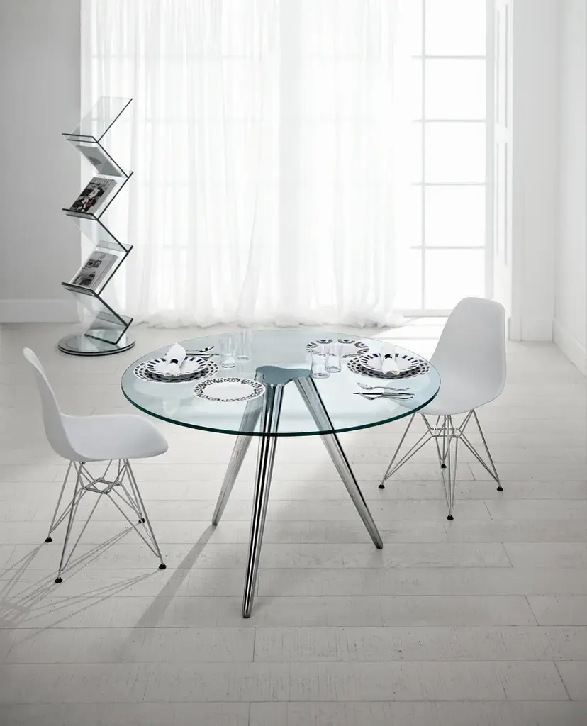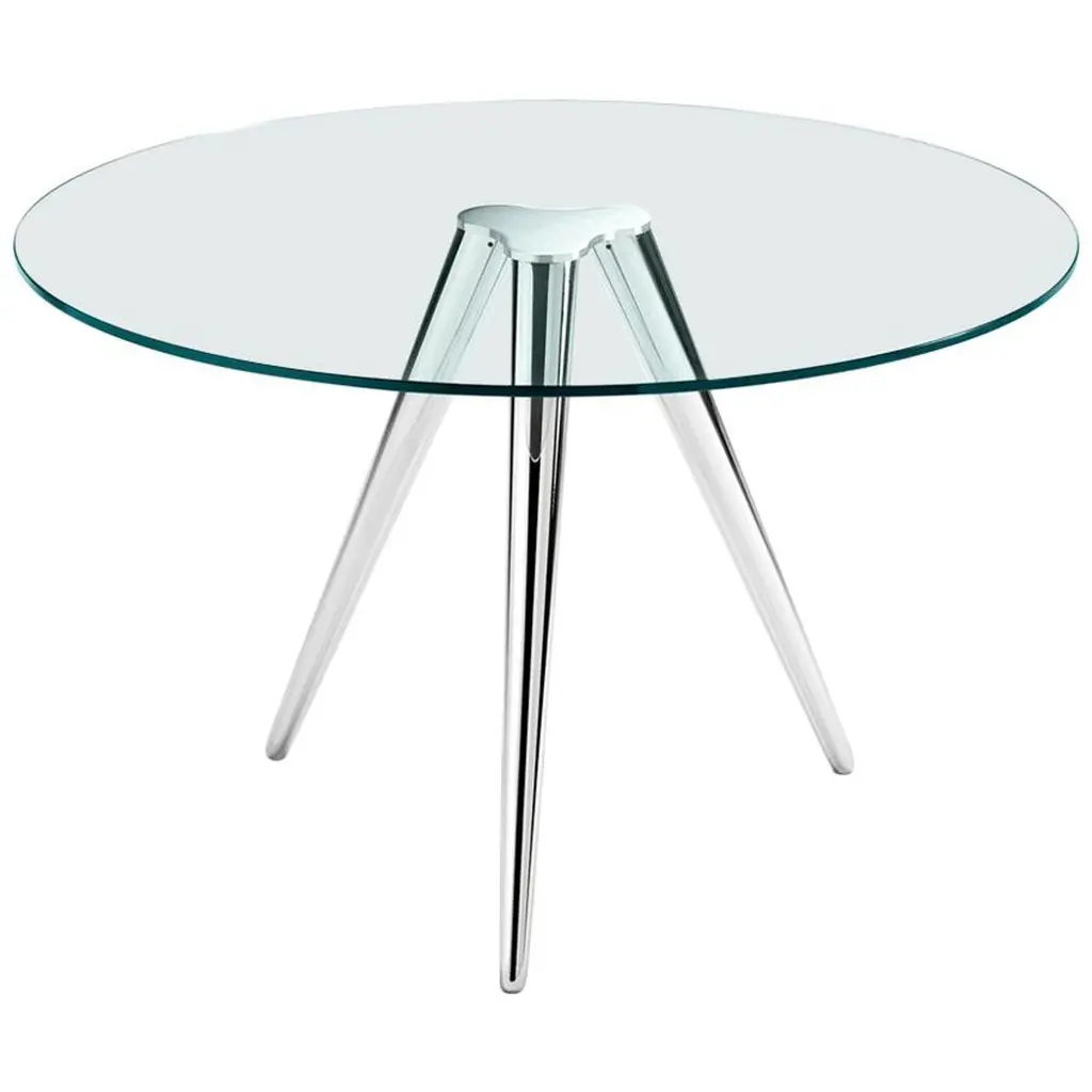 High table solid and elegant at the same time. Available with white lacquered or chromed base, top in transparent float, smoked or extraclear glass. Size: Ø 110 x h.74 cm Ø 120 x h.74 cm Ø 130 x h.74 cmThickness: 12 mm Load: 150 kg