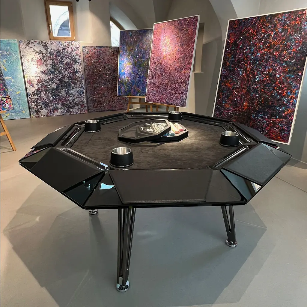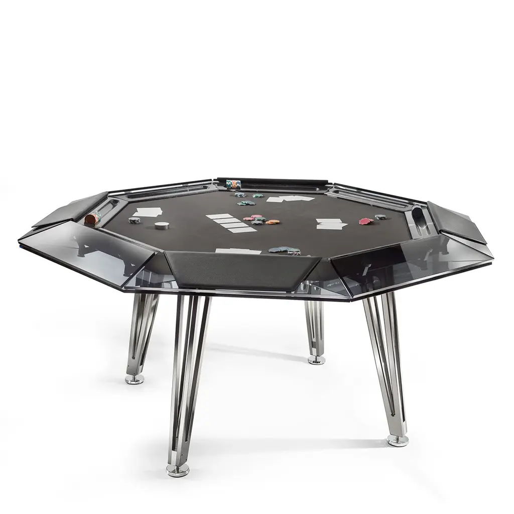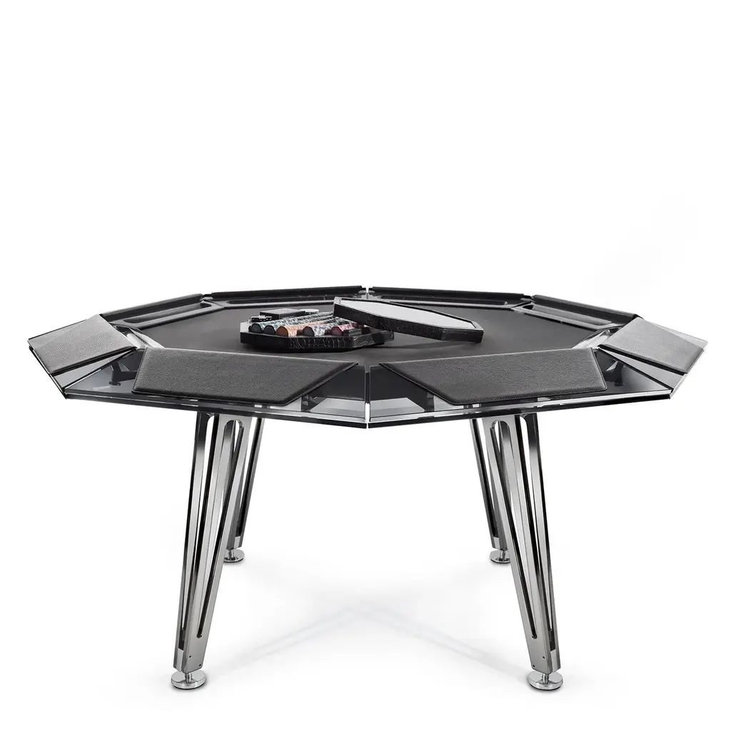 A true gem for home game rooms, this octagonal poker table for eight players boasts a captivating, distinctly contemporary design, rich in fine materials and sharp corners. Four splayed metal legs enriched with a black chromed finish sustain the glass structure, inspired by the classic appearance and cut of diamonds. a bold frame embraces the black game mat in Alcantara®. Leather armrests available at an additional price, while a lavish game set is included with purchase.