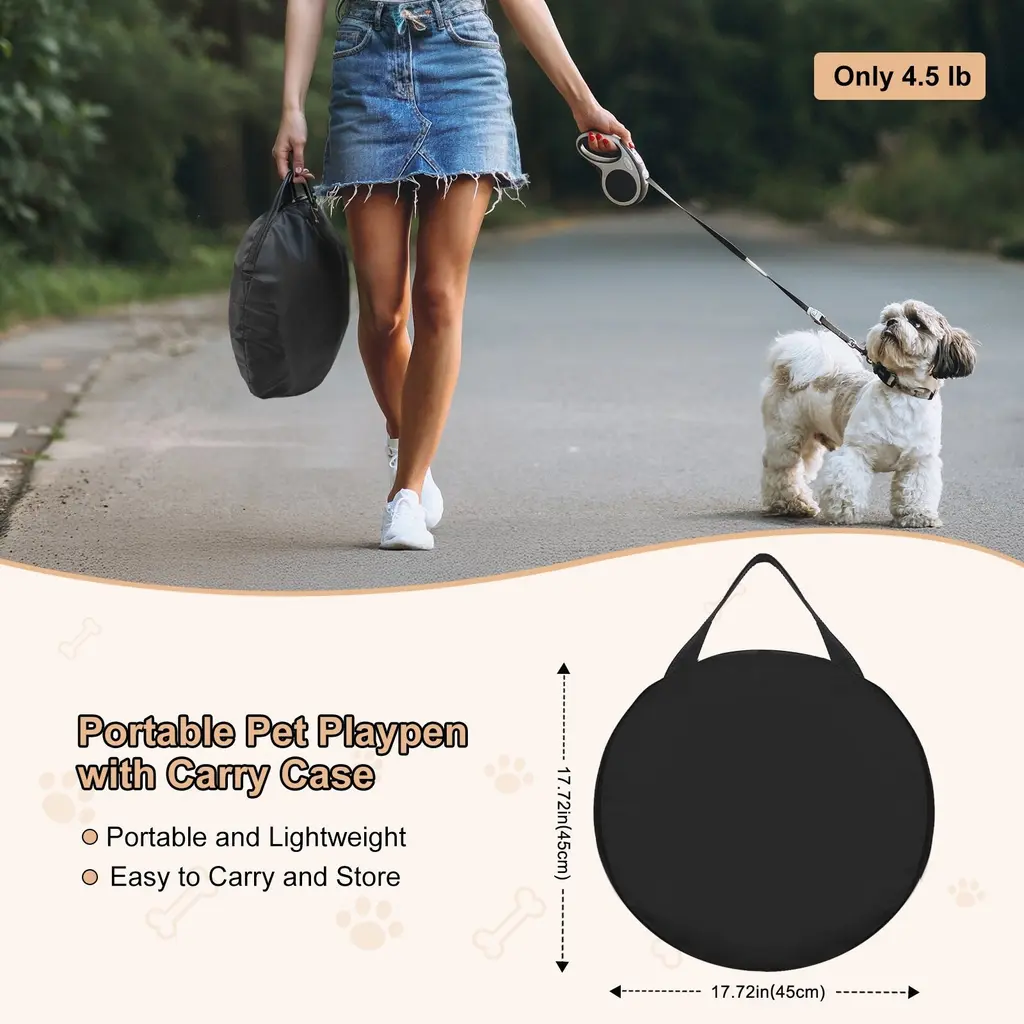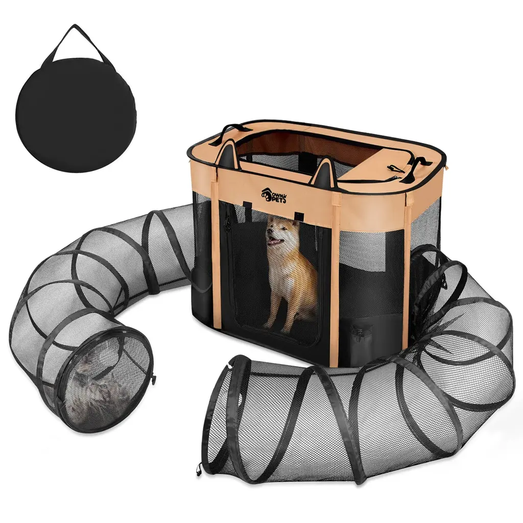 Upgraded Design for Durability: The Ownpets upgraded pet playpen features an innovative design with 8 foldable PVC support rods, ensuring a stable and durable structure. Measuring 33" x 24" x 23.23", it is perfect for small pets like cats and dogs.Multi-functional Expandable Tunnels: The included tunnels, each measuring 51.18" x 12.4" and totaling 102" , can be used individually or connected to the playpen, providing pets with an engaging exploration space. The connector design is compatible with other tunnel types for flexible setups.High-Quality Materials for Comfort: Made from durable 600D Oxford fabric and 360° breathable mesh, this playpen ensures excellent airflow and scratch resistance. The waterproof base makes cleaning easy, keeping pets comfortable and safe both indoors and outdoors.Convenient to Carry and Store: The playpen is designed for quick folding and comes with a dedicated carrying bag, making it easy to transport. The simple setup and takedown process make it ideal for travel, picnics, and camping, giving pets a fun play space anytime, anywhere.Thoughtful Details and Practical Accessories: Equipped with dual-zipper doors, an external side pocket, and two cat tunnels. Roll-up doors allow easy access for pets, while added features like a ball and other fun details enhance playtime, meeting pets' daily needs.Product Description The Ownpets upgraded cat and dog playpen provides a safe, comfortable, and feature-rich play space for your pets. Measuring 33" x 24" x 23.23", it is built with 8 foldable PVC support rods for durability and stability. The two included tunnels, totaling 102" in length, can be used individually or attached to the playpen, offering pets an exciting area to explore. Constructed from high-quality 600D Oxford fabric and 360° breathable mesh, it ensures good air circulation and scratch resistance. The waterproof base design makes cleaning simple. The easy fold and carry design with a dedicated carrying bag is perfect for travel and outdoor activities. The dual-zipper doors and practical side pocket provide convenience, while the tunnels and fun accessories make playtime more enjoyable.Package Included: