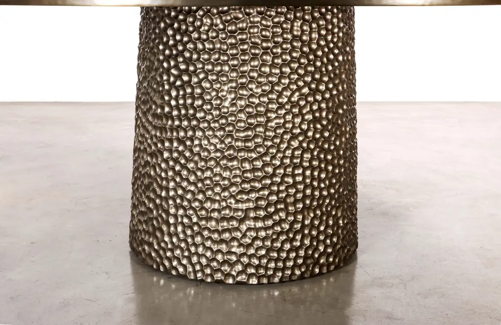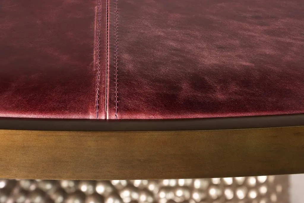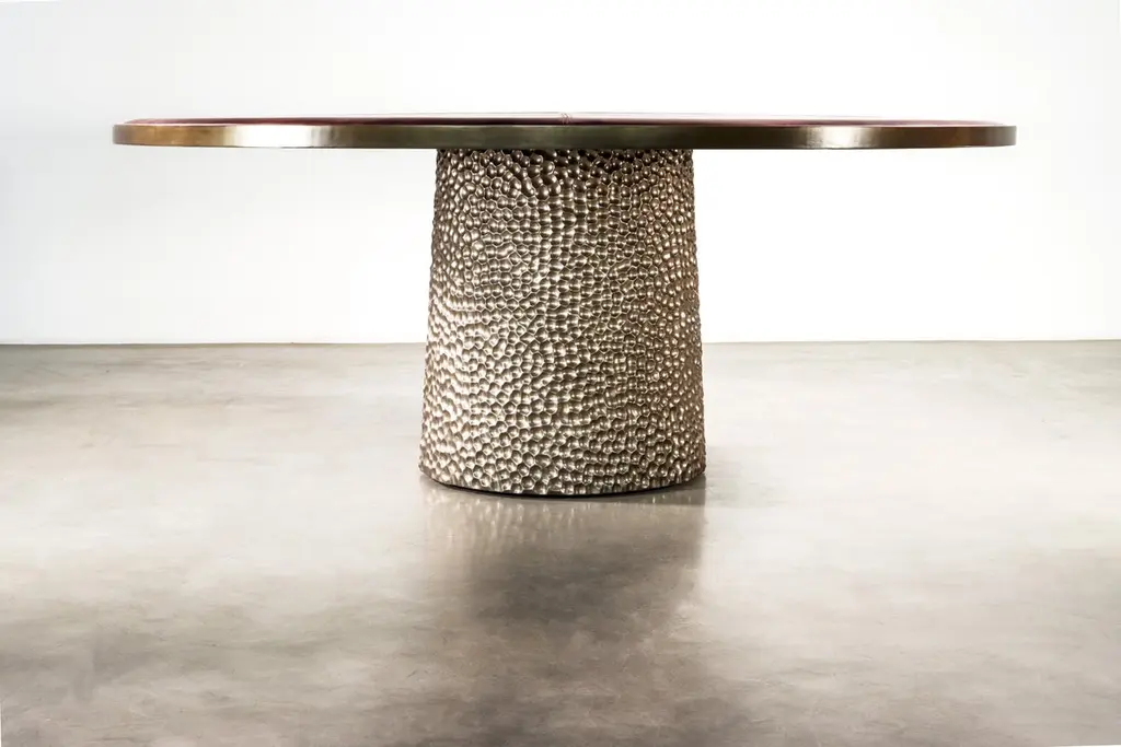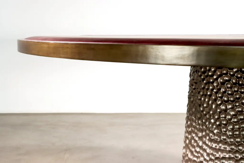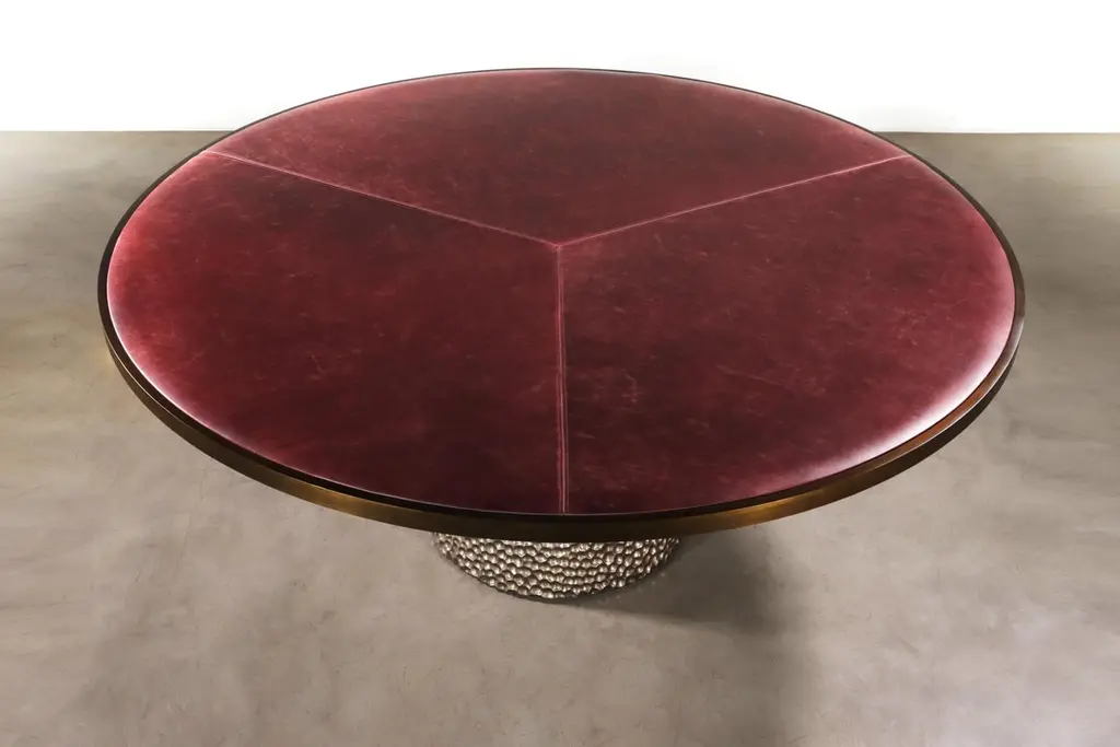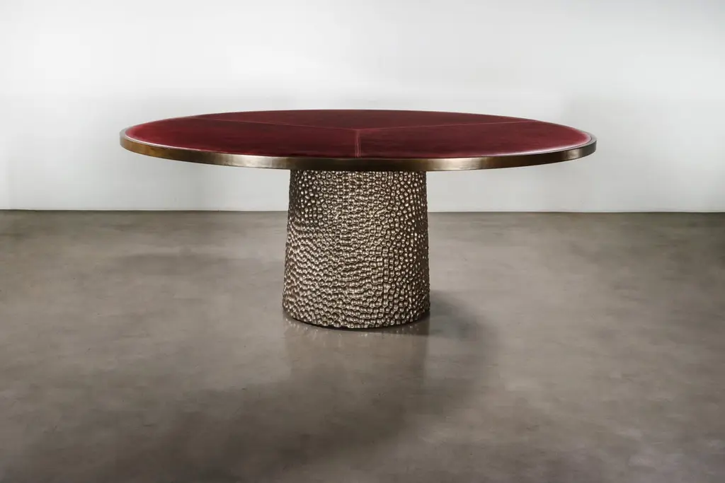 The Giada Table features an upholstered top in the fabric or leather of your choice with an elegant bronze trim and a hand carved wood base shown here in a metallic finish. Measurements are 72" Dia x 30" H as shown but available in custom sizes. Other materials available are Argentine Rosewood, Oak, Maple, Cherry, Beech, Elm, Okume, Teak, African Teak, Bird’s Eye Maple, Black Maple, Bubinga, Cerused Oak, Cerused Gray Oak, Gray Oak, Ebony, Macassar Ebony, Striped Macassar Ebony, Walnut Burl, Sycamore, Walnut and Zebrawood. Also available in any type of stone; Carrara, Calcutta Gold, Nero Marquina, St Laurent, Blue Jeans, Onyx and more. Available in matte, semi-gloss, high gloss finish or lacquered. Available as shown or customizable to your desired size, shape, finish, and more.About Costantini DesignCostantini is a furniture design and manufacturing company founded in 2002 by artist and designer William C Stuart. The name Costantini comes from his maternal grandfather, a first generation Italian-American. Born in New York City and raised upstate, William majored in studio art at Colgate University with a year abroad in Paris, graduating with honors. In 2001, he traveled to Buenos Aires and fell in love with the culture and craftsmanship instantly. He designed his first collection soon after and opened an art and design gallery in Los Angeles. A decade later, he came home to New York and now has a studio in the famed West Chelsea Arts Building where his works blur the lines between art and functional design. The team of artisans continue to produce the majority of the furniture in Argentina. Aside from private collections, some notable public projects include the Hotel Bel Air, the Sultanate of Oman, Bergdorf Goodman, NoMad Hotels, Four Seasons, Ritz Carlton, and Grand Hyatt. Our work has been featured in publications such as Architectural Digest, Galerie Magazine, the Wall Street Journal, Interior Design Magazine, Luxe, and more. Visit us at our New York studio, open by appointment.