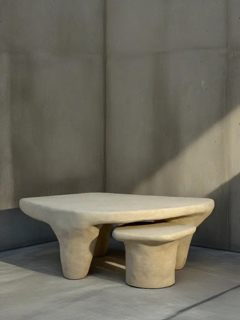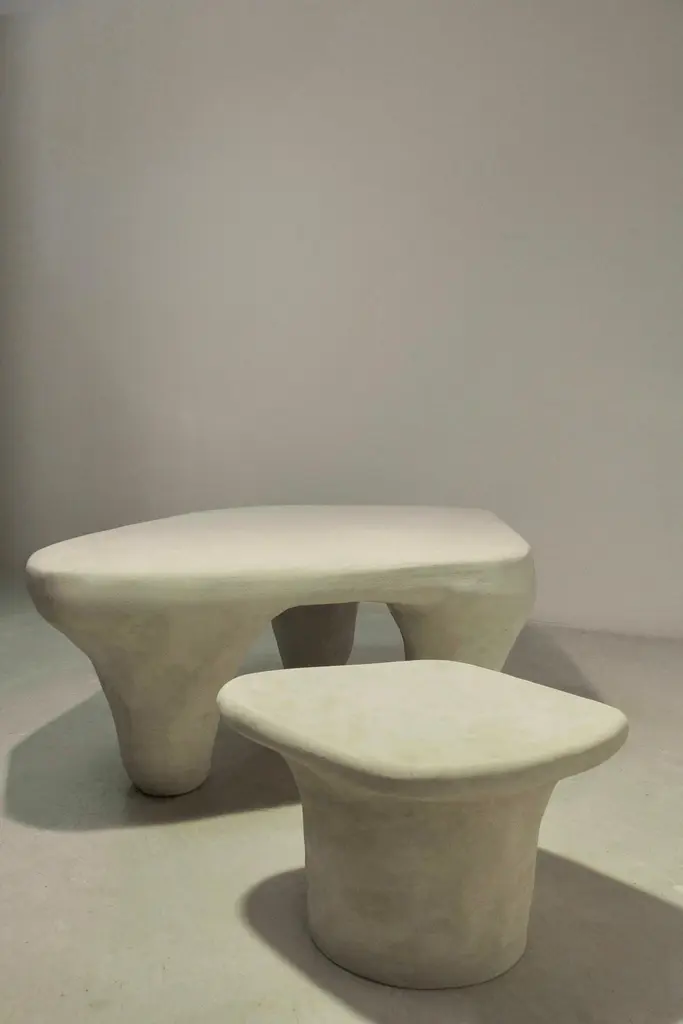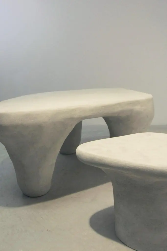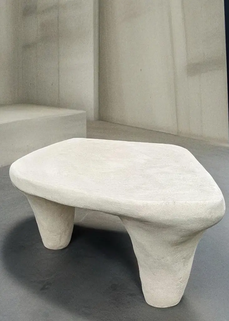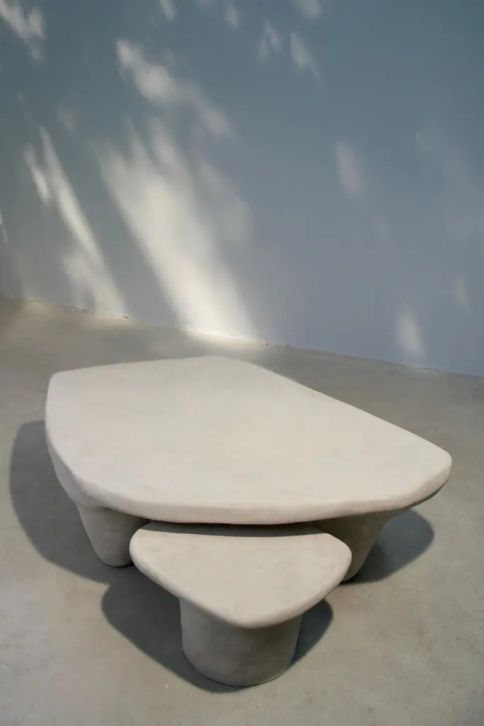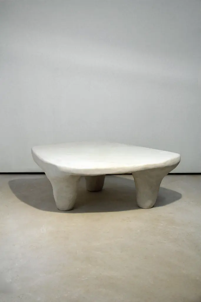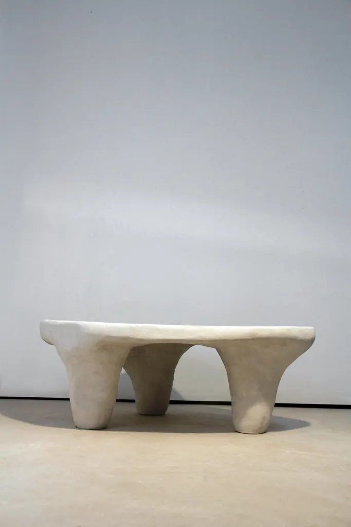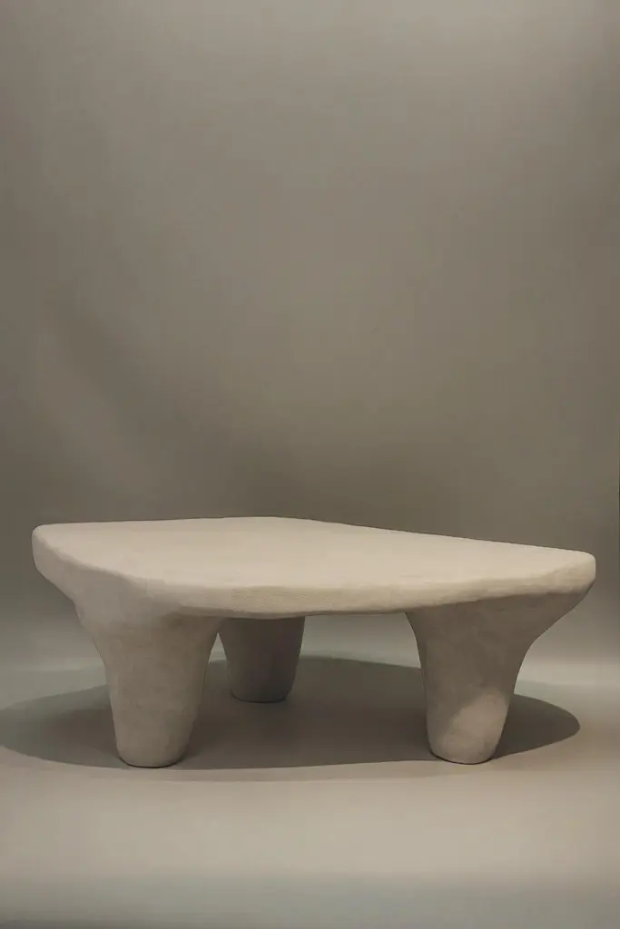 V003 Table by Aeny StudioLimited EditionDimensions: D 77 x W 115 x H 39 cm.Materials: Repurposed PVC, plywood, paper composite, gypsum mix, and sand.Each piece is individually hand-sculpted, resulting in variations that make every item truly unique within its limited series. Customization options are available for colors, shapes, sizes, and finishes. Please contact us.Founded by Nayara Nascimento, aeny studio challenges conventional design by transforming discarded and repurposed materials into sculptural objects that are both expressive and functional. Drawing inspiration from the raw, untamed beauty of nature, a deep connection to her native Brazilian heritage, and a neurodivergent perspective, Nayara’s work embodies themes of resilience, imperfection, and transformation. Each piece invites viewers to see beyond function or decoration, revealing deeper narratives that explore the unexpected beauty in raw, unrefined forms.Nayara’s process is led by an instinctive engagement with the materials, allowing her to embrace their natural textures, quirks, and irregularities. Whether working with wood, metal, or gypsum, she treats each creation as an opportunity to explore new possibilities, letting the materials guide the design. The hands-on, experimental approach means no two pieces are alike—each object is a testament to the fluid, organic nature of creation, where unexpected outcomes are celebrated, not corrected.In an industry driven by uniformity and mass production, aeny studio’s approach is intentionally slow and mindful, letting each piece emerge at its own pace. This deliberate method allows for moments of spontaneity and unplanned gestures to become integral parts of the design, making each piece feel deeply personal yet universally relatable. By honoring theimperfect, Nayara’s work challenges us to reconsider what we value, encouraging a return to a more instinctive, tactile way of seeing and engaging with the world.'My work is a response to this desire to 'switch off' and reconnect without instinct - a quiet, inexplicable voice inside of us communicating an emotion or feeling that only art or music can convey. In our fast- paced technological world, it seems increasingly vital that we don't render ourselves blind to that deep primal language, that is so often undervalued'.