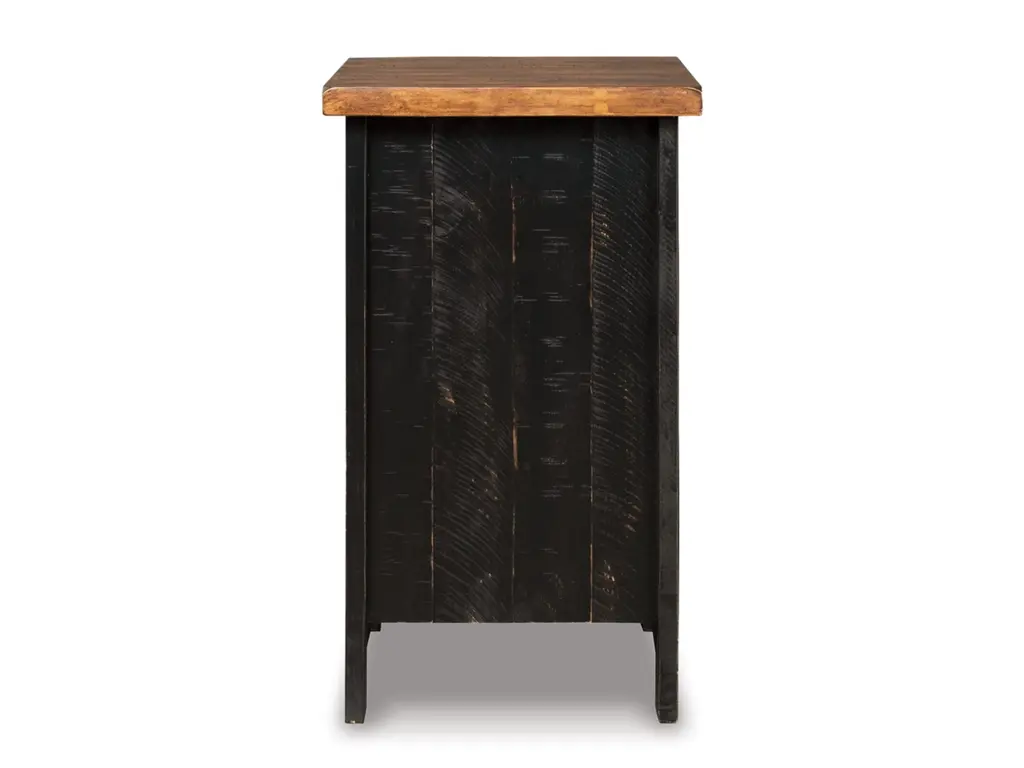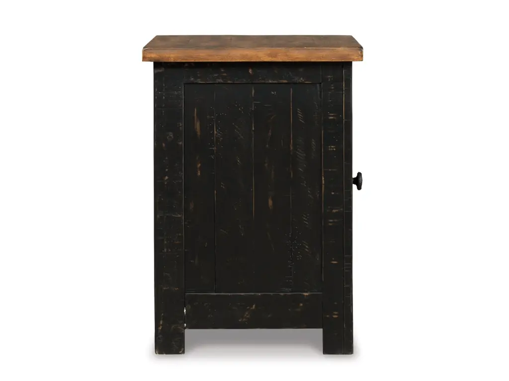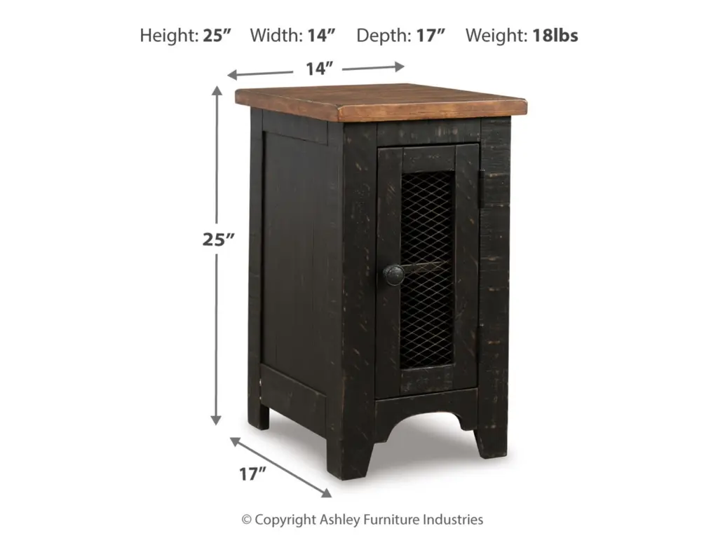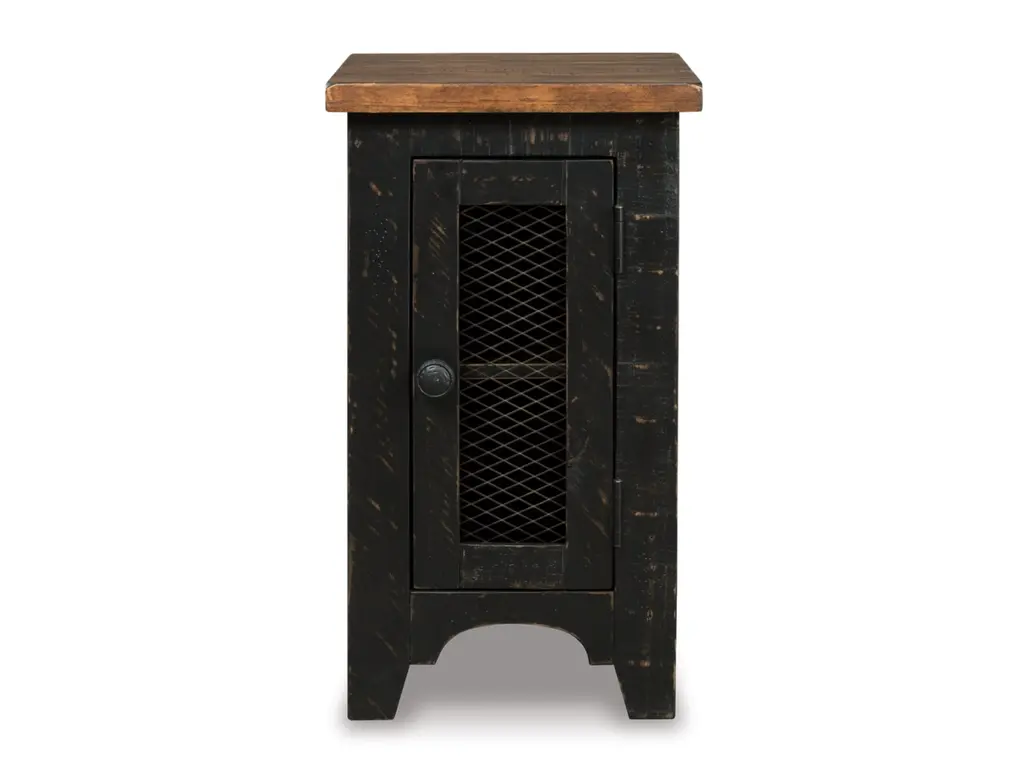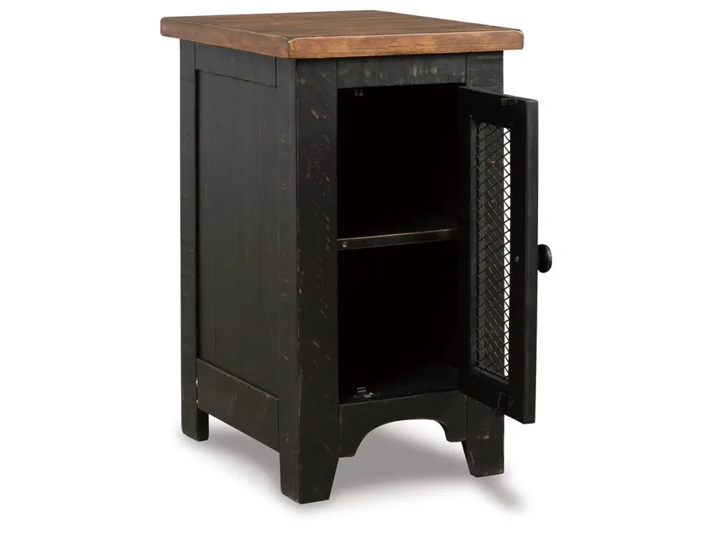 To those with an eye for the best in rustic farmhouse living, the two-tone Valebeck chairside end table doubles up on charm. Designer touches include plank-effect styling, distress marks and a wire mesh door front for added character.