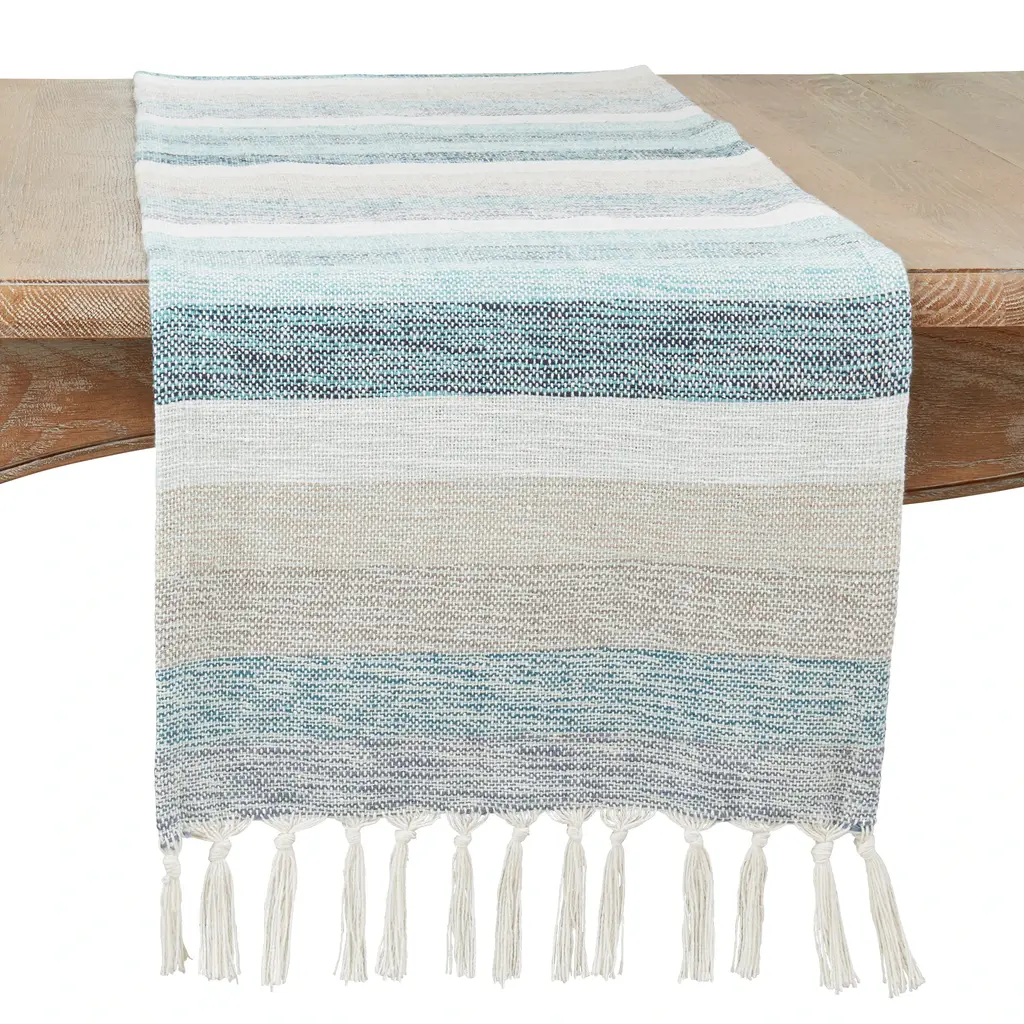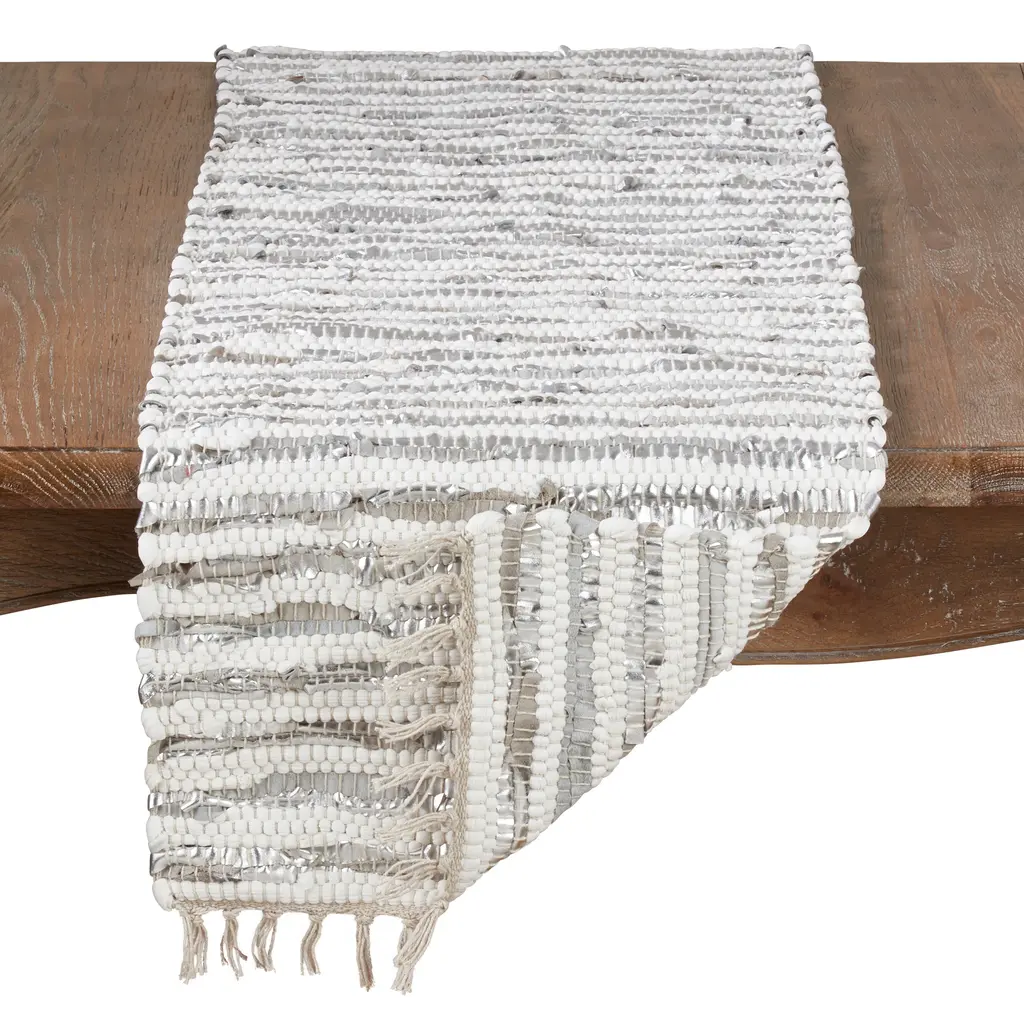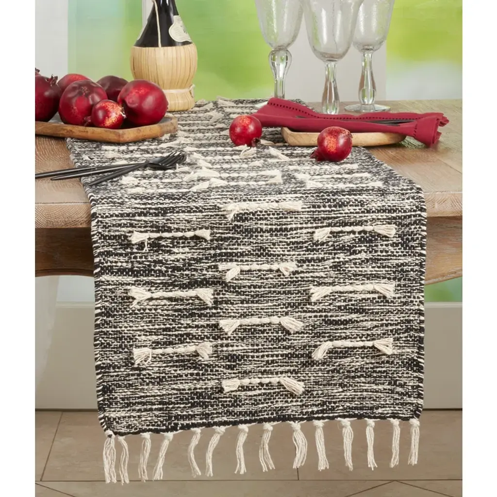 This table runner can be easily dressed up for entertaining guests or pared down for casual occasions. It's crafted from 100% cotton and has a texturized black and white pattern adorned with bold white lines. Fringed edges add a distressed look that's easily at home on reclaimed wood tabletops, walnut-finishes, and even light, neutral wood tones. Pair it with bold, vibrant placemats for an on-trend contrast, or lean into the neutral hues by adding additional black and white placemats and napkins.