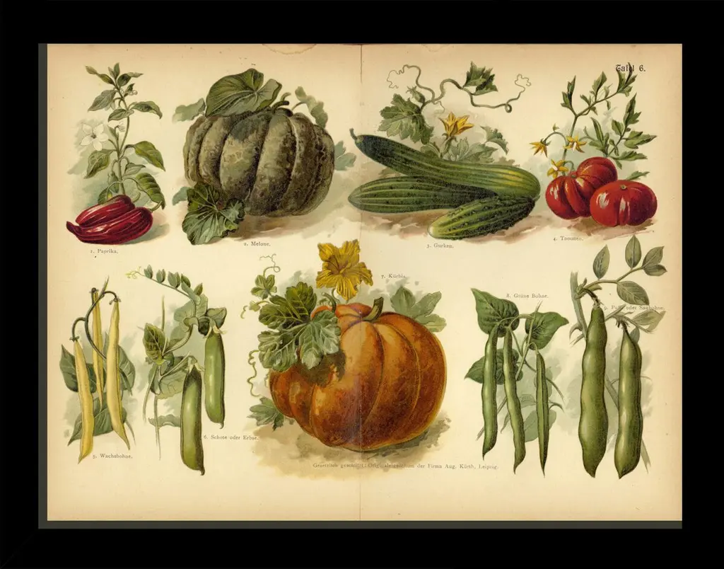 Vegetables; Peas in pods, radish, carrot, & melon. Illustration from a famous French seed catalog and the vegetables that can be grown.