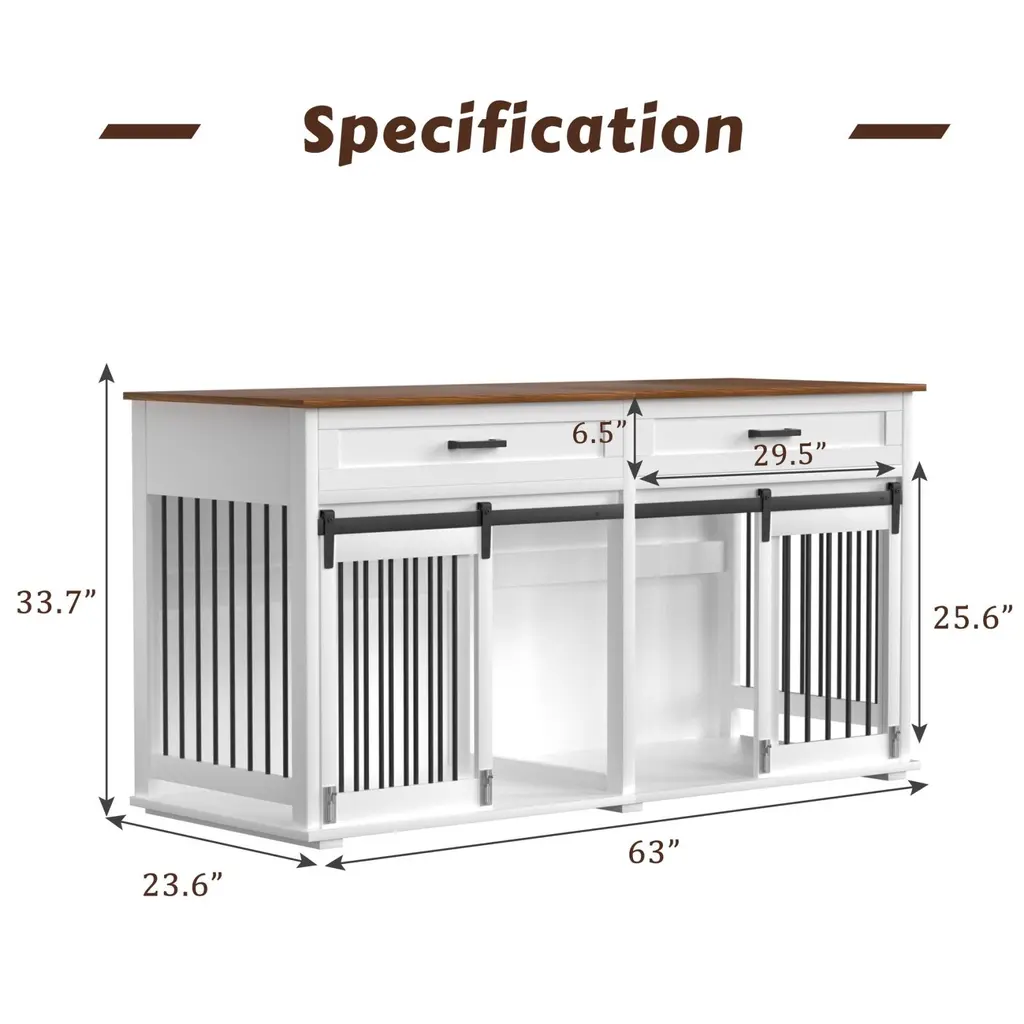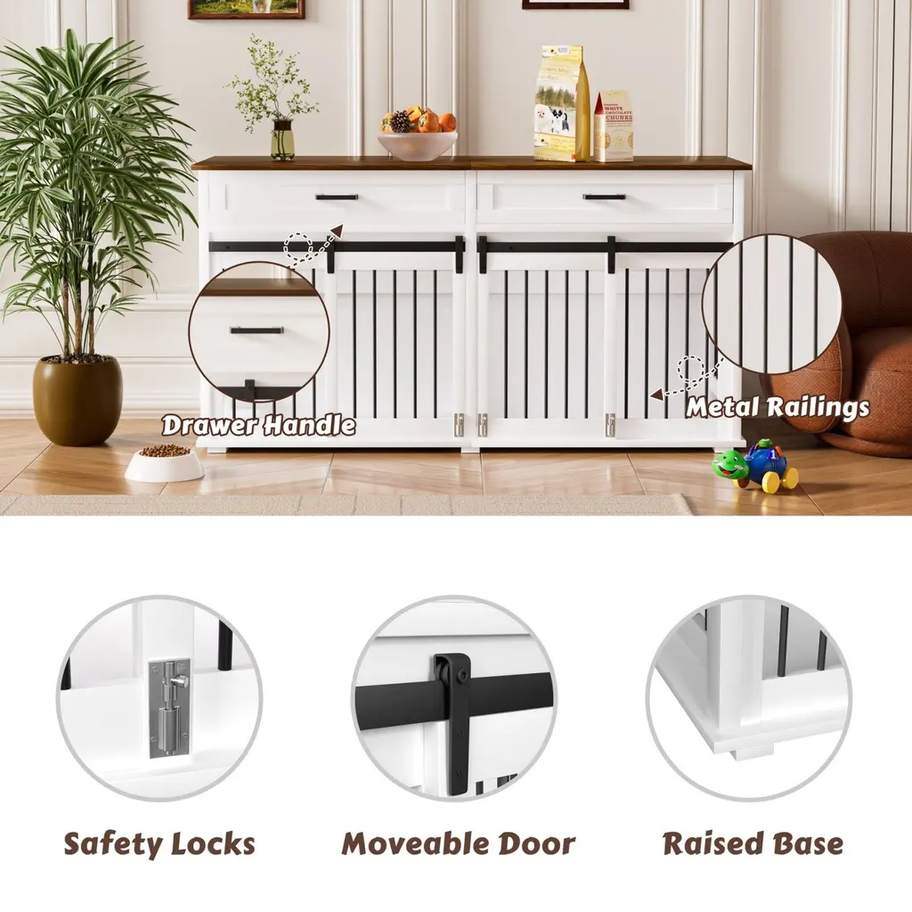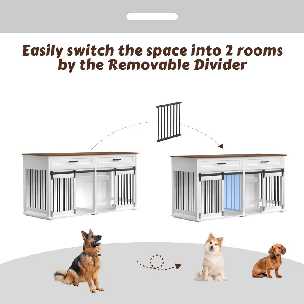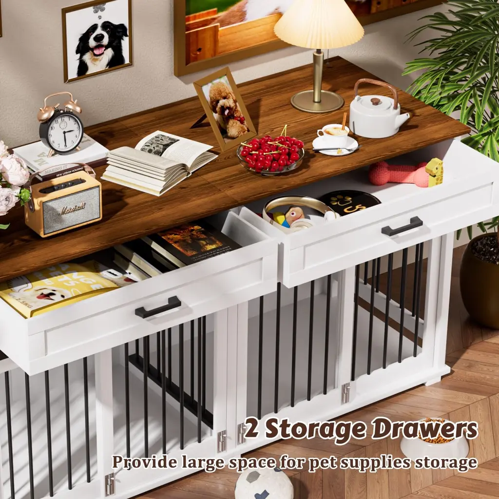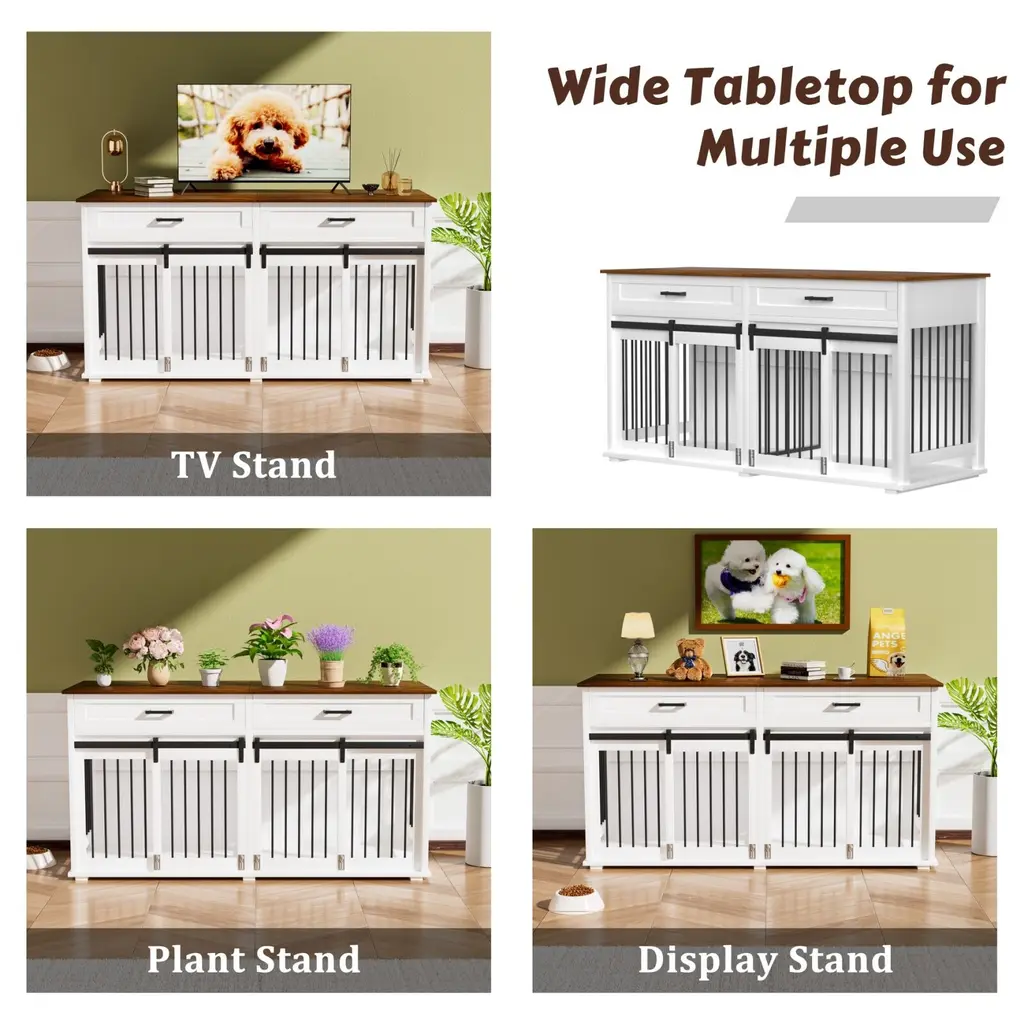 Equipped with two storage drawers, this dog kennel furniture provides large space for storing pet supplies, toys, and other essentials. The drawers are easy to access and help keep your home organized.The removable divider allows you to easily switch the space into two rooms, perfect for housing multiple pets or creating separate areas for different activities.This dog crate furniture is not just a pet enclosure but also serves as a TV stand, plant stand, and display stand. Its wide tabletop provides ample space for various items, making it a perfect addition to any room in your home.With dimensions of 63"L x 23.6"W x 33.7"H, this large dog crate offers plenty of space for your pet. The heavy-duty metal railings and raised base ensure stability and durability, while the safety locks and movable door provide secure access.The modern design of this dog cage complements any home decor. The raised base helps protect your floors from scratches and damage, while the metal railings provide a sleek and secure enclosure for your pet.