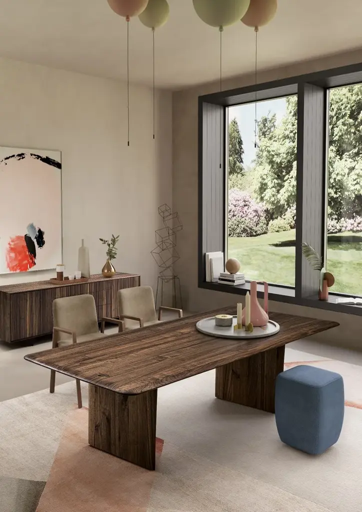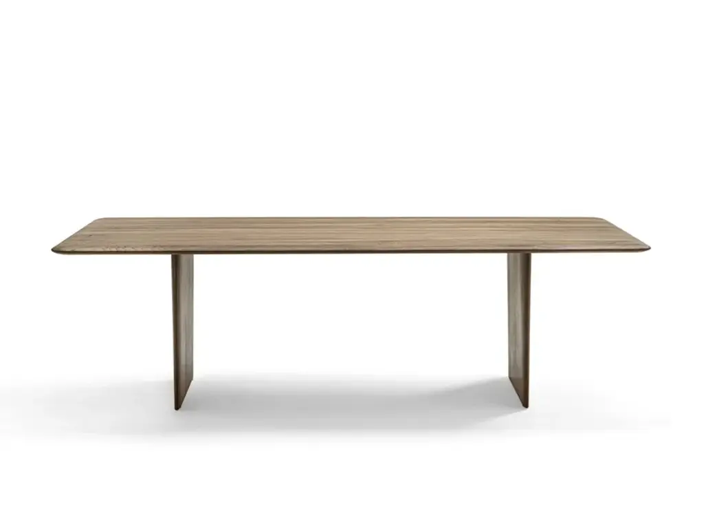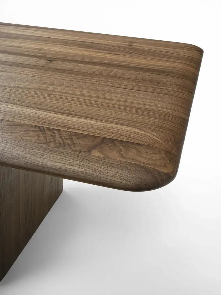 Vela is a table entirely made of solid wood with glued lists with rounded sides, characterized by top and legs having thin thicknesses thanks to the bevelled and rounded edges which give it a light and sinuous design.AVAILABLE FINISHES:A1: walnut without knots, walnut with knotsA2: oak without knots, oak with knots, cherryA4: oak without knots pigmented: total blackoak with knots pigmented: total black