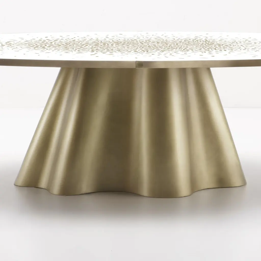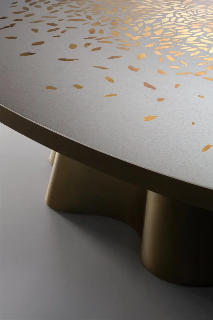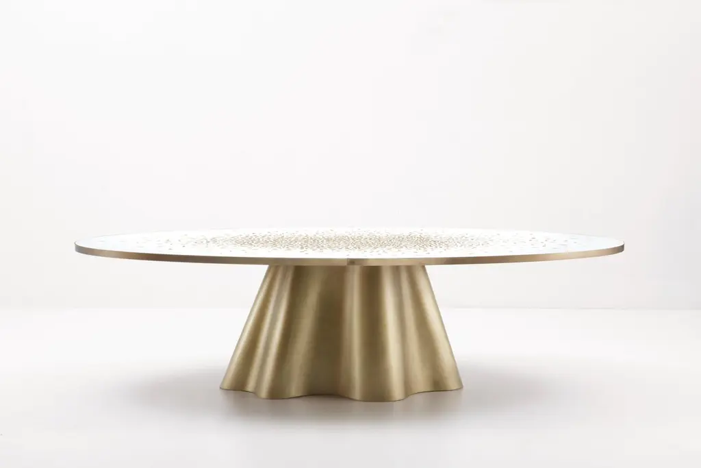 Vela Table by De CastelliDimensions: W 280 x D 160 x H 76 cmMaterials: Orbitale DeLabré BrassVela is a table-sculpture that explores and enhances the different facets and uses of metal. The stately oval top in Venetian terrazzo made of white marble has been crafted in collaboration with Laboratorio Morseletto to embrace small pieces of brass obtained from 'shattered’ sheet metal. Surrounded by marble, the pieces become precious inserts in an ethereal composition, a burst of petals floating upon the wind. The two-dimensional brass that distinguishes the table top is juxtaposed with the sculptural three-dimensionality of the base. Soft, sinuous folds unfurl and alternate to create coves that rise into an intricate conical trunk, delicate and solid at the same time.DE CASTELLI“HARD COUTURE”Faithful to its decision to reinstate the special role of metal in design and experimentation, De Castelli infuses artisan ideas and workmanship into industrial processes, leading to entirely original results. The encounter with design inspires an approach to materials founded upon respect for their potential, be it hidden or obvious, which emerges slowly in a collection of pieces that, despite being part of a series, remain unique.Unique not only for the hand that has created them, but also for the singular cultural path that focuses on the aesthetic (and not just practical) value of the primordial material with which De Castelli shapes living spaces.A BESPOKE APPROACHEach object, even in the repetition of form, is a creative act in and of itself, one that incorporates a heritage of constantly-evolving expertise and research. The equation that relegates ‘cold’ metals to the margins of furnishing projects is thus overturned, bringing iron, brass and copper, in their infinite variations and finishes, to the centre of an entirely renewed stage, allowing them to finally shine with their own light.SUSTAINABILITYDe Castelli has always been committed to making the entire production cycle increasingly sustainable, aware that metal, the material with which its business identifies itself, is precious and must be treated with care, without waste.PEOPLE FIRSTThe wide spaces of the De Castelli headquarters in Crocetta del Montello (TV) allow those who work to enjoy environments where order, cleanliness and safety are always maintained and guaranteed. An attitude of attention and respect for people that has led to the shared ethical code.