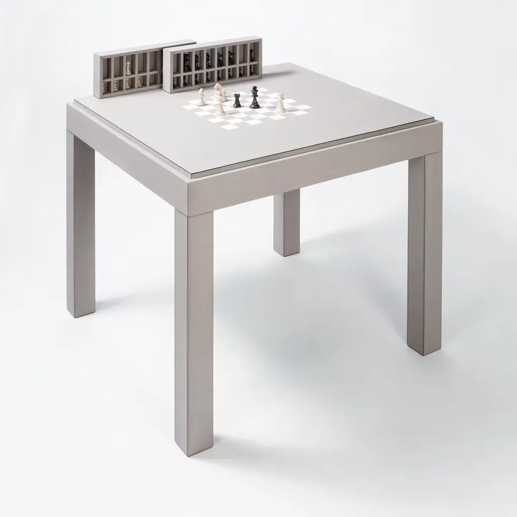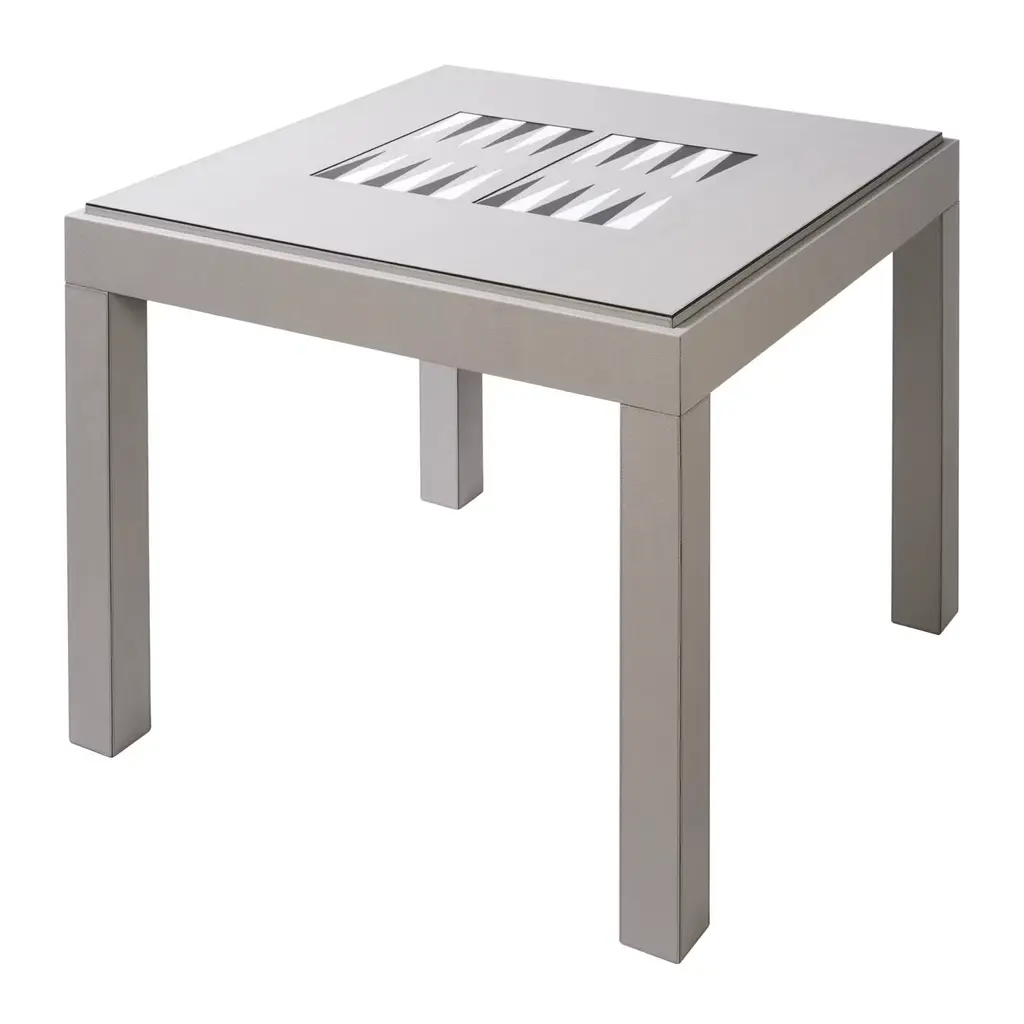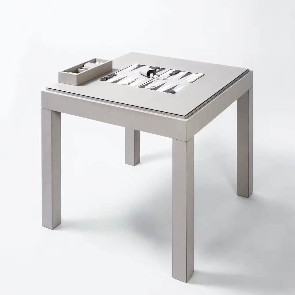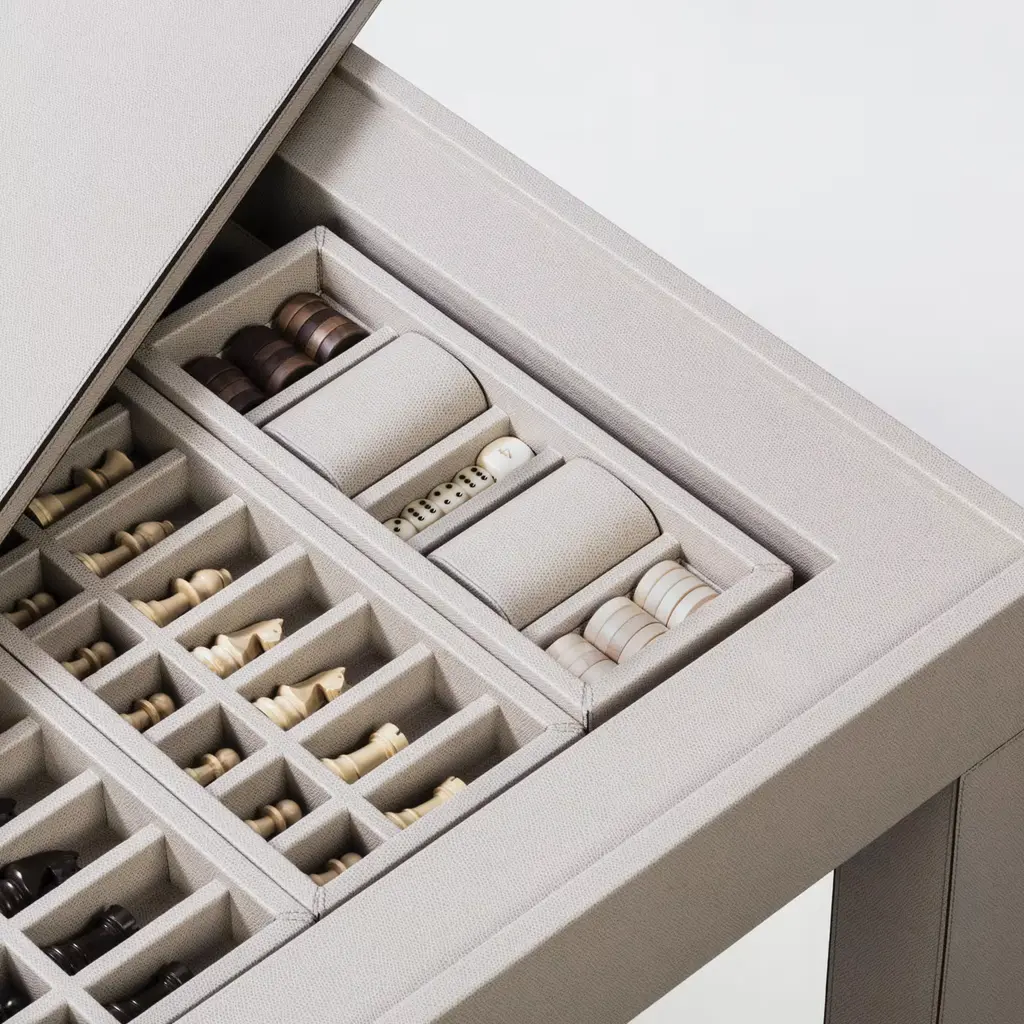 This stunning table is the ideal surface to play backgammon, chess, and checkers in style. The wood structure is upholstered in leather and features removable legs, so that both sides of the beveled top can be used: a backgammon field with leather inlays on one side and an inlaid chessboard on the other. Under the top three leather-covered trays with compartments store the boxwood chess pawns, the maple and walnut backgammon pawns with leather inserts, two dice cups, standard dice, and a doubling cube.