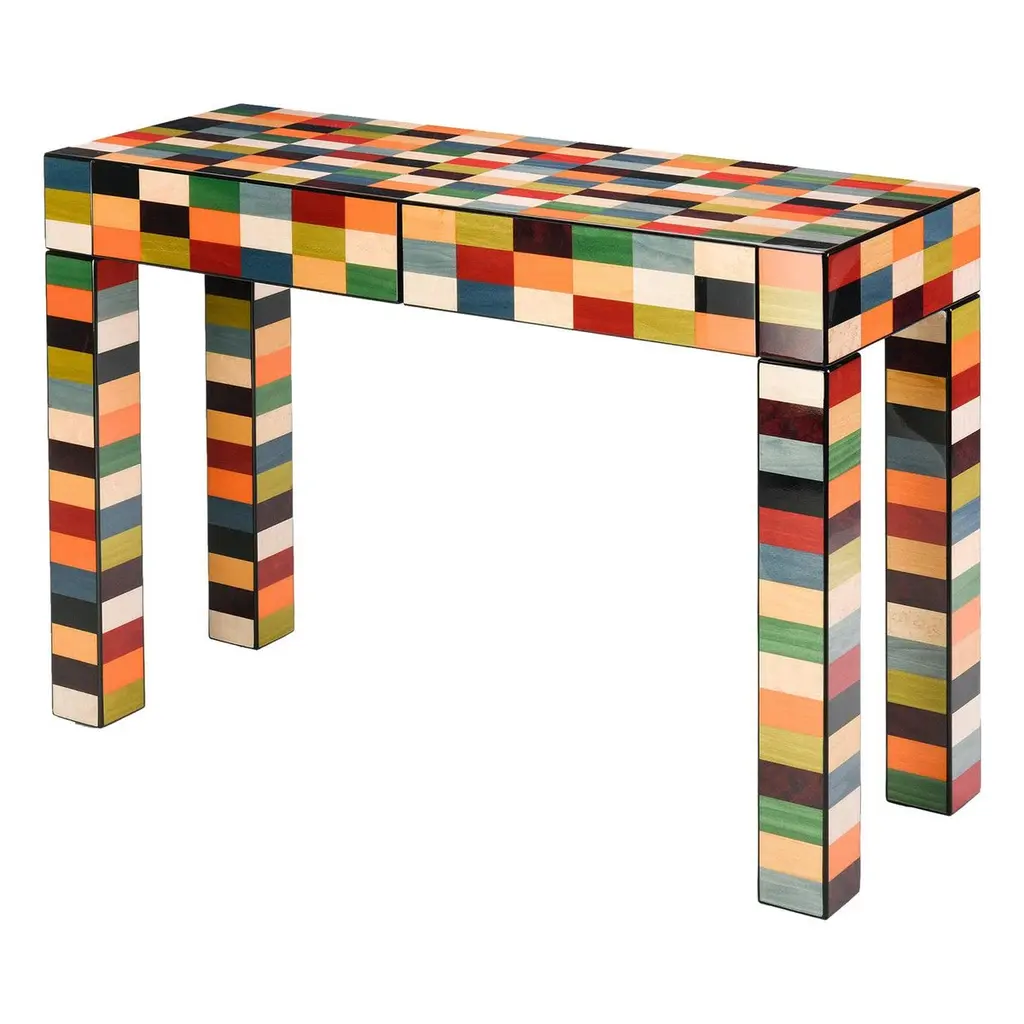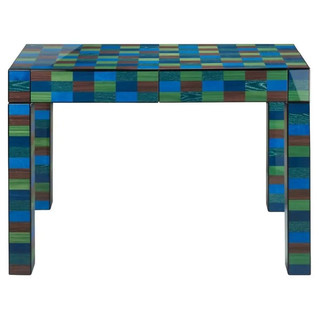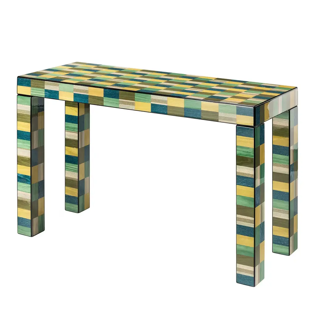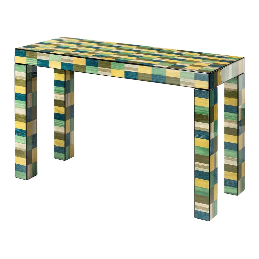 Venice Cannaregio Console Table by MoriciDimensions: W 120 x D 41 x H 73 cm. Materials: Wood, inlay veneer.Finish : Gloss brushed polyester. Exquisitely crafted by expert hands, this console table will be a timeless and elegant focal point in an eclectic or contemporary interior, thanks to its clean, essential lines. Crafted entirely from wood veneer with a striking geometric inlay, lacquered in a pastel palette of green, blue, and brown, it's brushed and polished for a superb finishing touch.About:Driven by a passion for craftsmanship, Luciano Morici and his wife Doriana Marconi launched their business in the late 1970s. Their collaborations with leading local companies quickly blossomed, designing and producing wood and leather accessories renowned for their meticulous attention to detail. Over time, the small artisan workshop, thanks to the value of its products, has transformed into a company with a fundamental artisanal vocation.Their products are the result of the finest Italian artisan tradition in wood and leather working. The company maintains strong ties to the splendid Marche region, renowned for its art and culture, beautiful landscapes, and a deeply rooted entrepreneurial spirit recognized internationally.