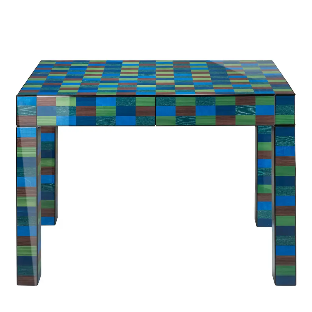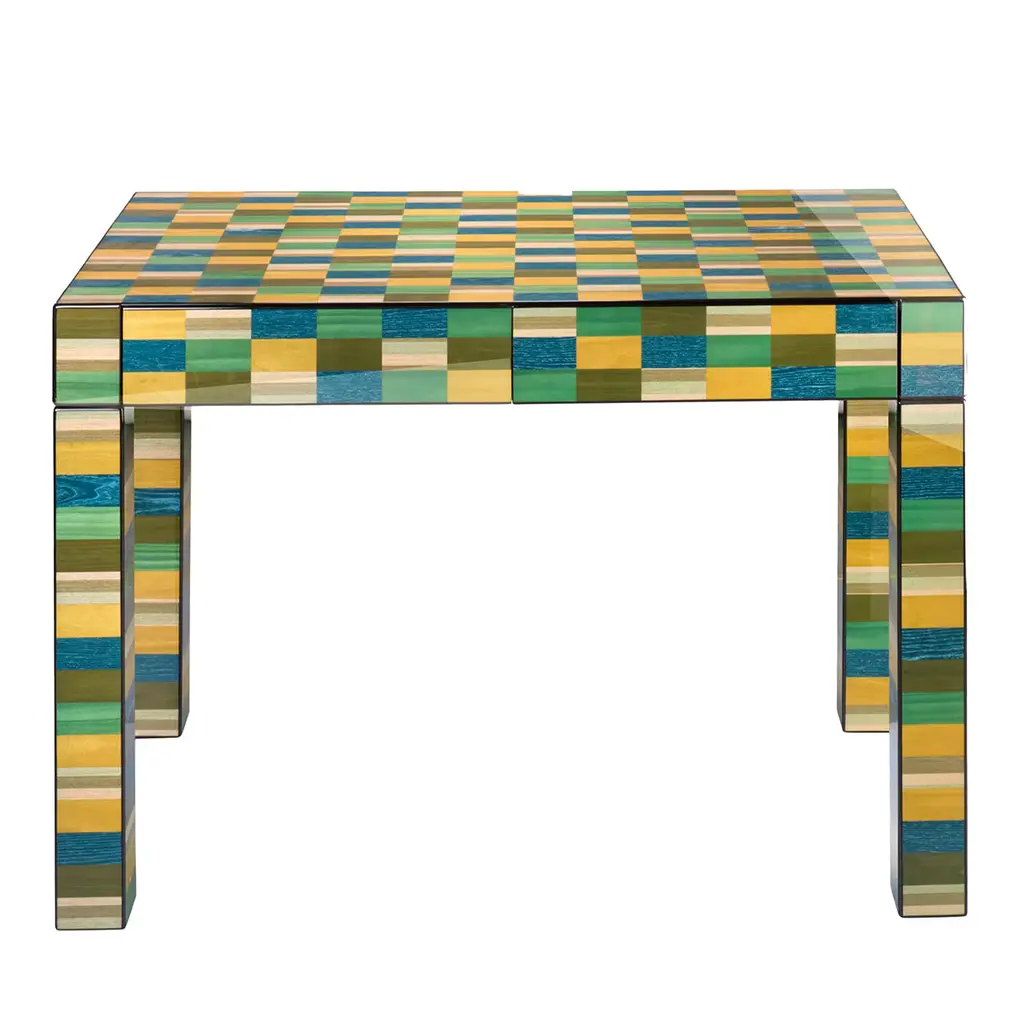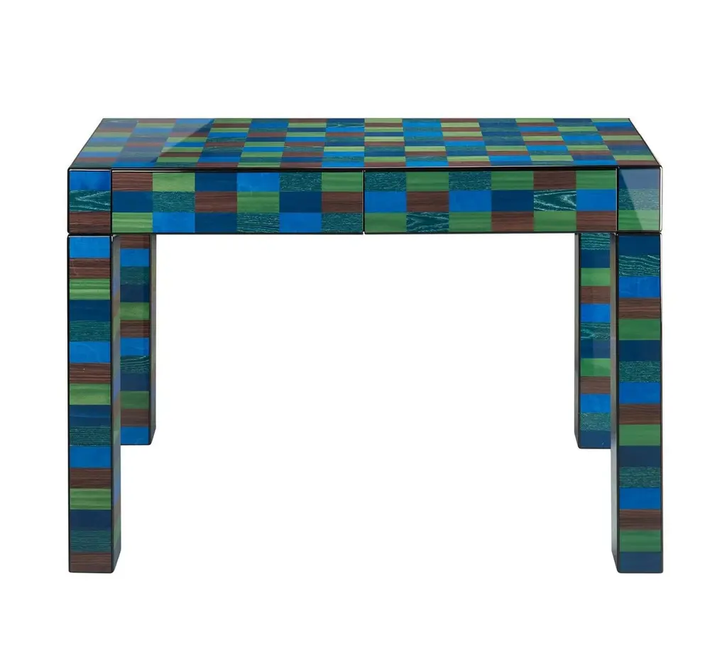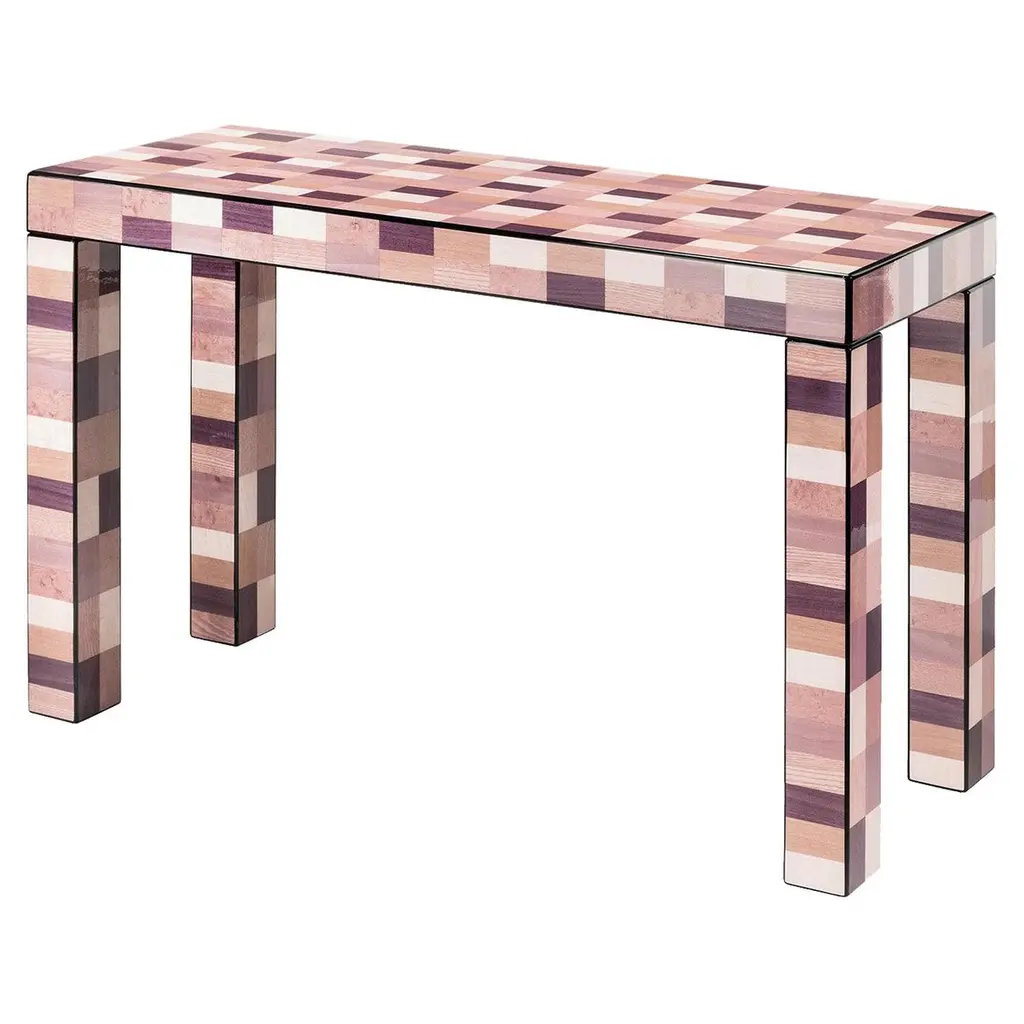 Venice Cannaregio Console Table by MoriciDimensions: W 120 x D 41 x H 73 cm. Materials: Wood, inlay veneer.Finish : Gloss brushed polyester. Exquisitely crafted by expert hands, this console table will be a timeless and elegant focal point in an eclectic or contemporary interior, thanks to its clean, essential lines. Crafted entirely from wood veneer with a striking geometric inlay, lacquered in a pastel palette of green, blue, and brown, it's brushed and polished for a superb finishing touch.About:Driven by a passion for craftsmanship, Luciano Morici and his wife Doriana Marconi launched their business in the late 1970s. Their collaborations with leading local companies quickly blossomed, designing and producing wood and leather accessories renowned for their meticulous attention to detail. Over time, the small artisan workshop, thanks to the value of its products, has transformed into a company with a fundamental artisanal vocation.Their products are the result of the finest Italian artisan tradition in wood and leather working. The company maintains strong ties to the splendid Marche region, renowned for its art and culture, beautiful landscapes, and a deeply rooted entrepreneurial spirit recognized internationally.