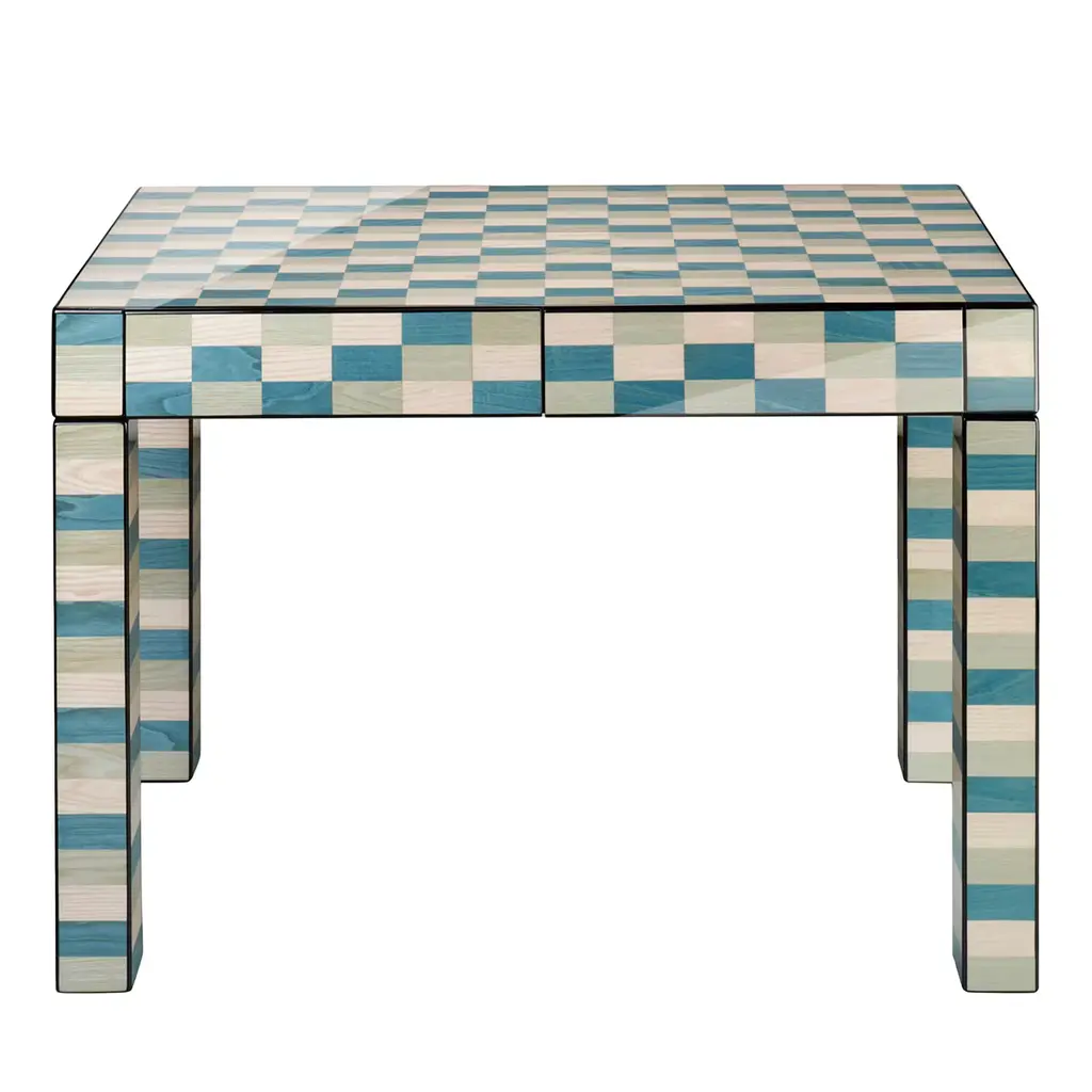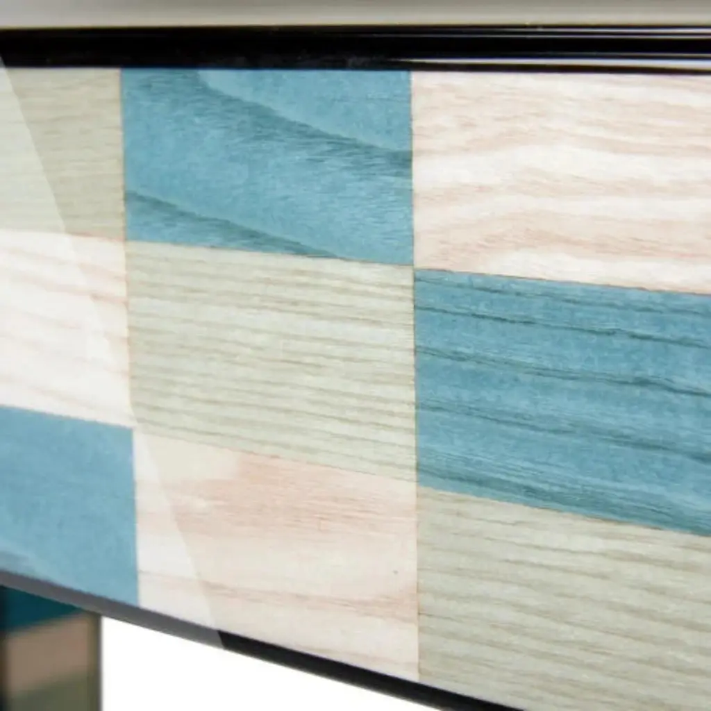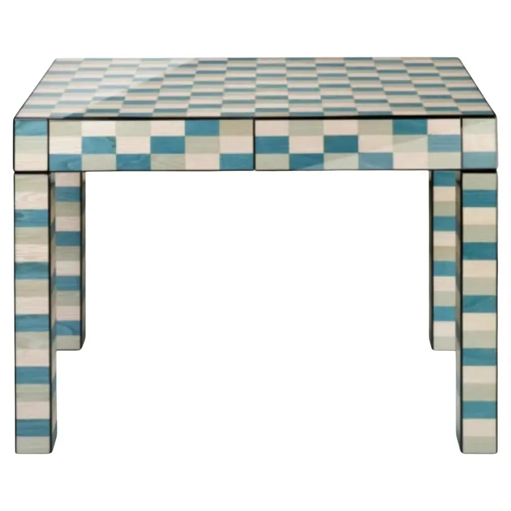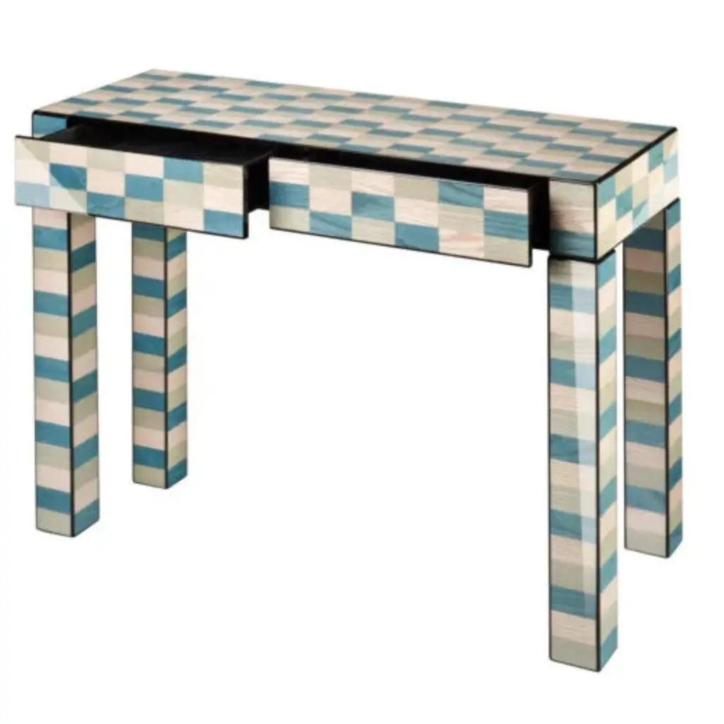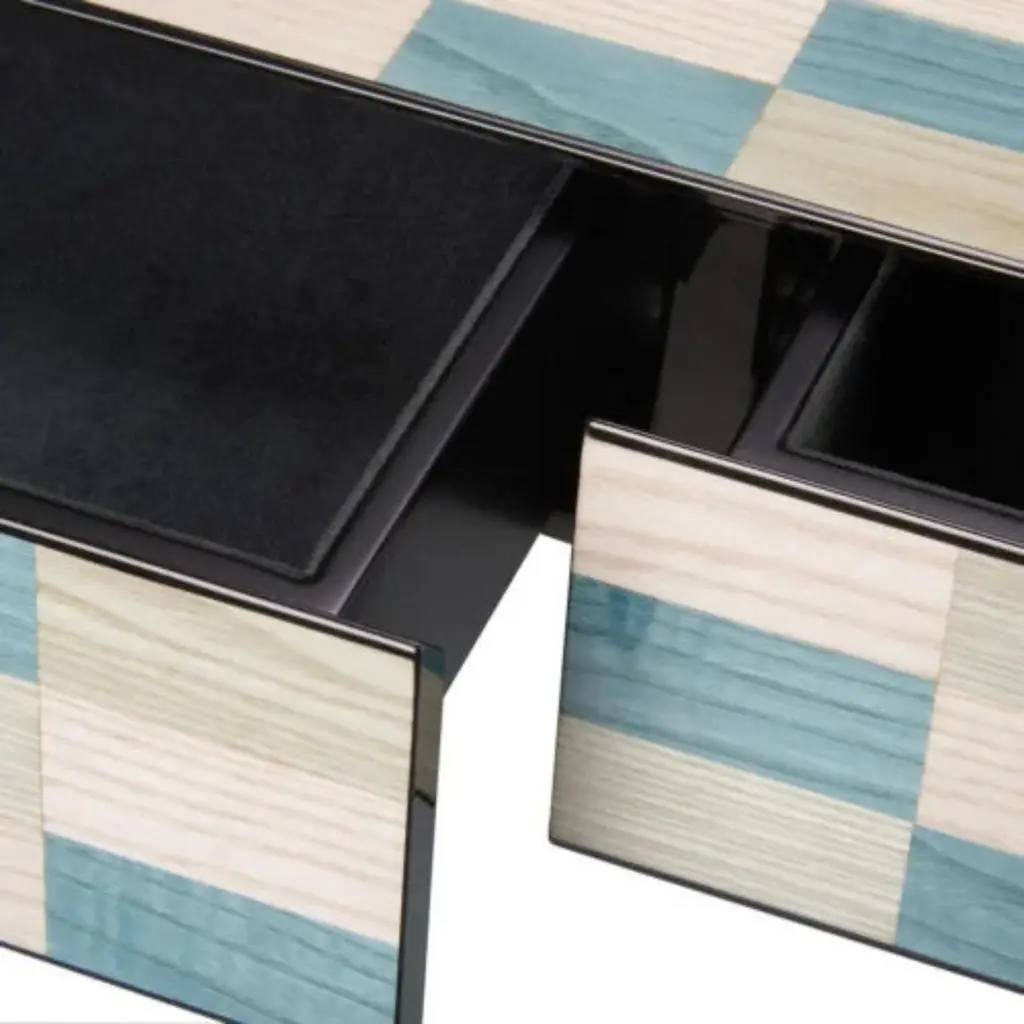 Venice Laguna Console Table with Drawers by MoriciDimensions: W 113 x D 41 x H 73 cm. Drawers : 42×32.5 H6 covered in black alcantara.Materials: Wood, inlay veneer, black Alcantara.Finish : Gloss brushed polyester. Enriching any interior, from the most classic to the most modern – from a conference room, an office, a home office – this console table will create a timeless and elegant focal point. Crafted entirely of veneered wood with a strong geometric inlay, lacquered in a palette of blue and green tones, and hand-polished and brushed, it features two practical drawers covered in black Alcantara.This coffee table, a contemporary and sculptural art object that embodies conviviality, will enliven any residential or commercial space. Crafted entirely of wood, it features a stunning inlay work composed of a captivating array of modern-inspired colored rectangles, polished and brushed for a bold finishing touch.About:Driven by a passion for craftsmanship, Luciano Morici and his wife Doriana Marconi launched their business in the late 1970s. Their collaborations with leading local companies quickly blossomed, designing and producing wood and leather accessories renowned for their meticulous attention to detail. Over time, the small artisan workshop, thanks to the value of its products, has transformed into a company with a fundamental artisanal vocation.Their products are the result of the finest Italian artisan tradition in wood and leather working. The company maintains strong ties to the splendid Marche region, renowned for its art and culture, beautiful landscapes, and a deeply rooted entrepreneurial spirit recognized internationally.