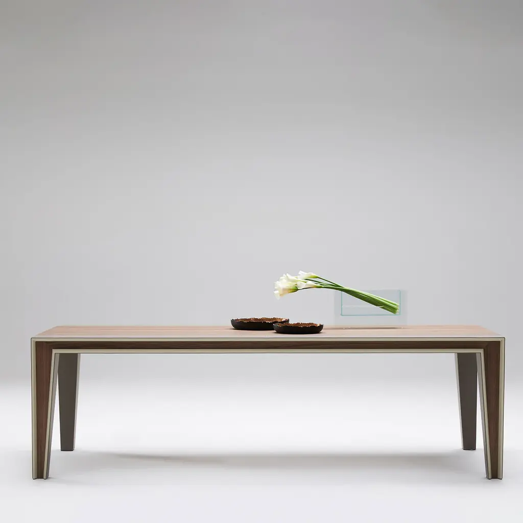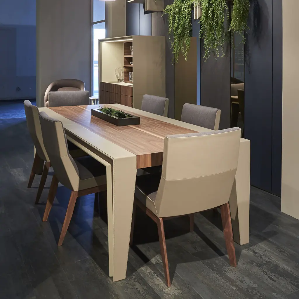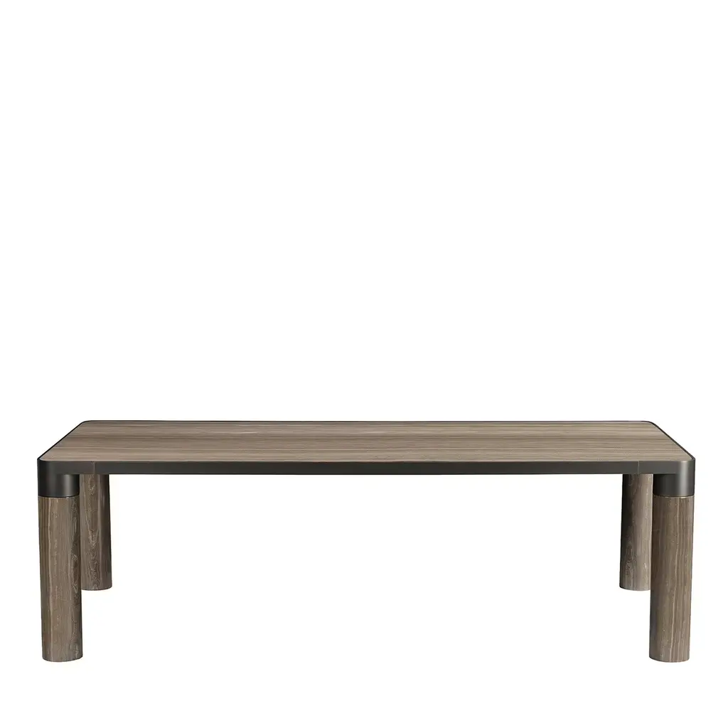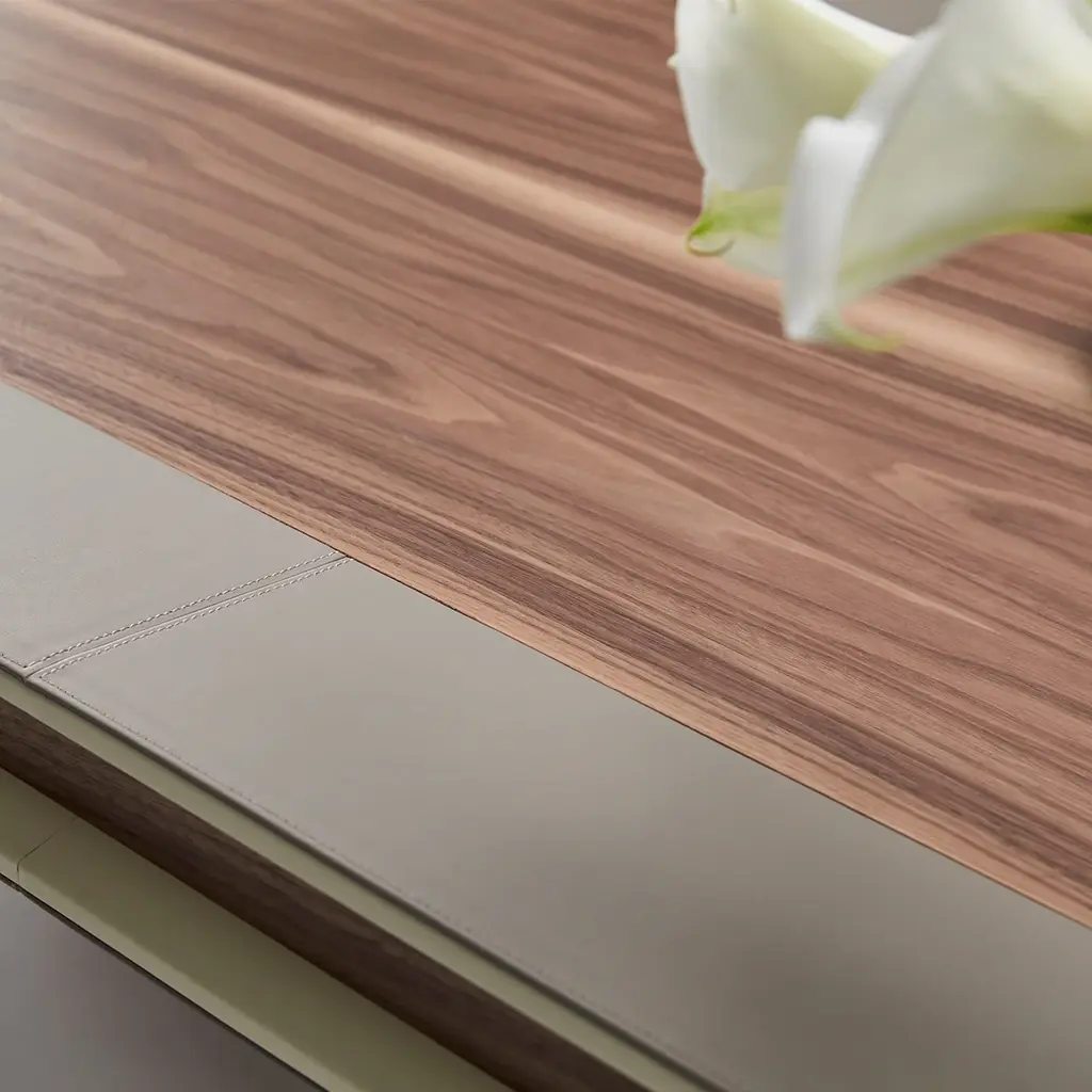 Archetypal lines whose rigor gets celebrated through precious sartorial inserts lend this table its fascinating contemporary elegance. Beige leather bands perfected by minute seams run uninterrupted along the top and legs' profiles, creating a neat yet harmonious contrast with the structure's warm wooden essence.