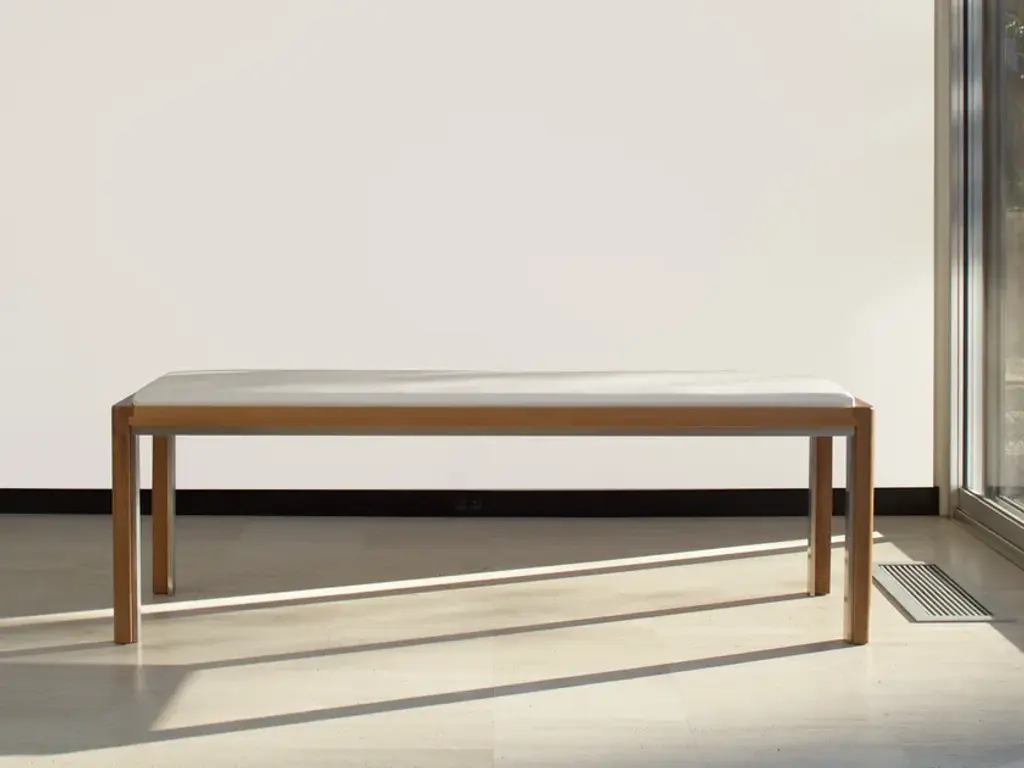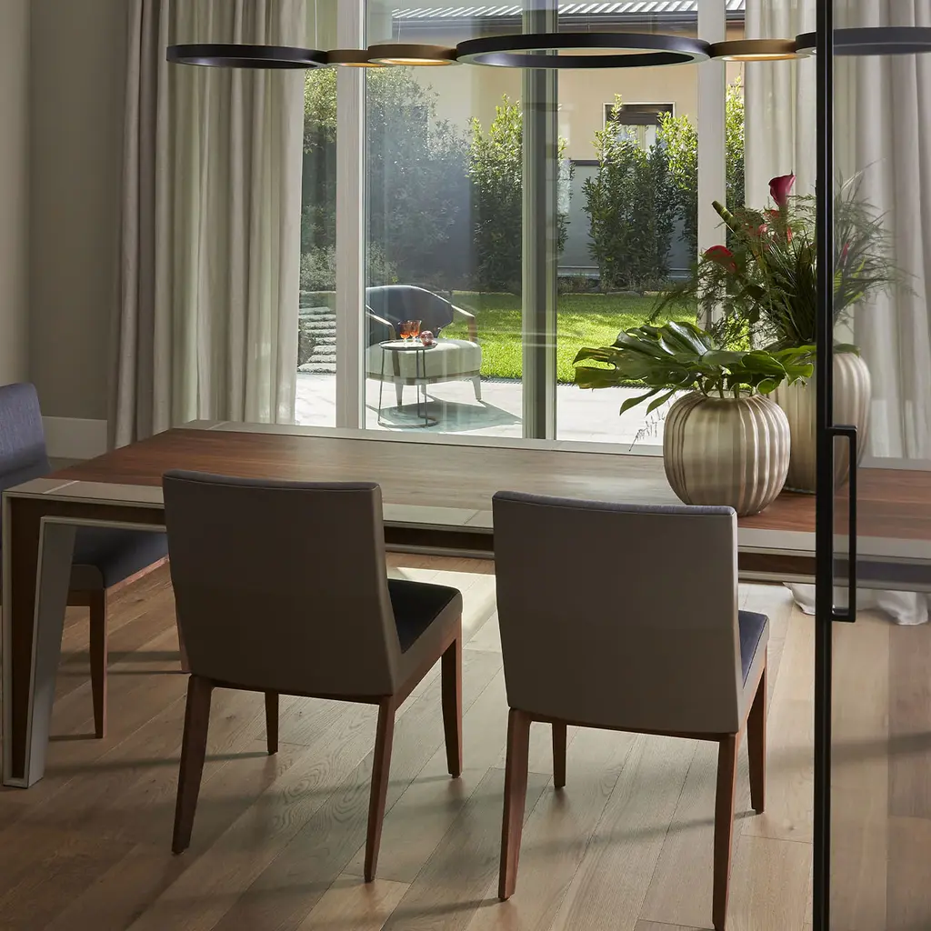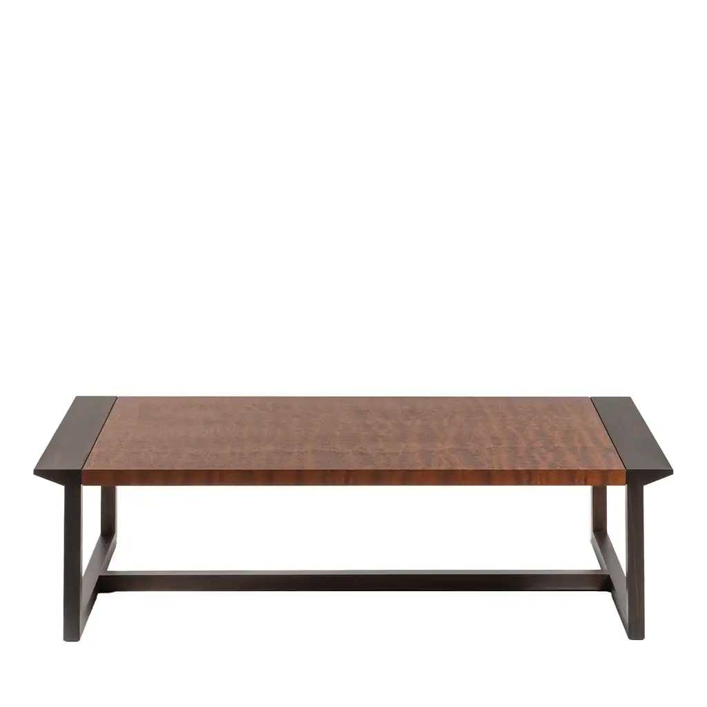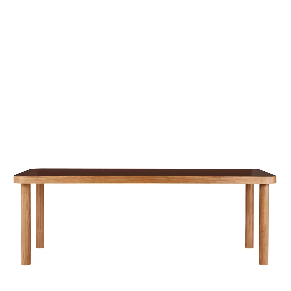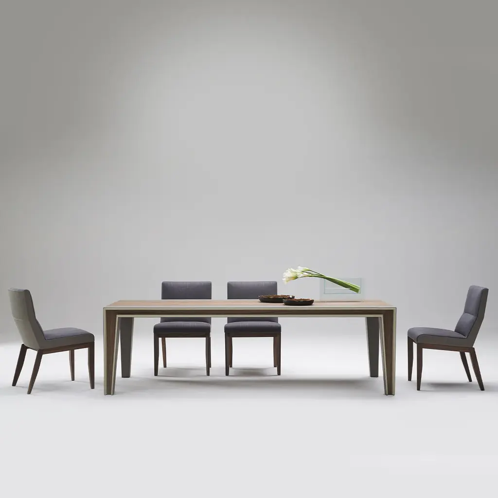 Archetypal lines whose rigor gets celebrated through precious sartorial inserts lend this table its fascinating contemporary elegance. Beige leather bands perfected by minute seams run uninterrupted along the top and legs' profiles, creating a neat yet harmonious contrast with the structure's warm wooden essence.