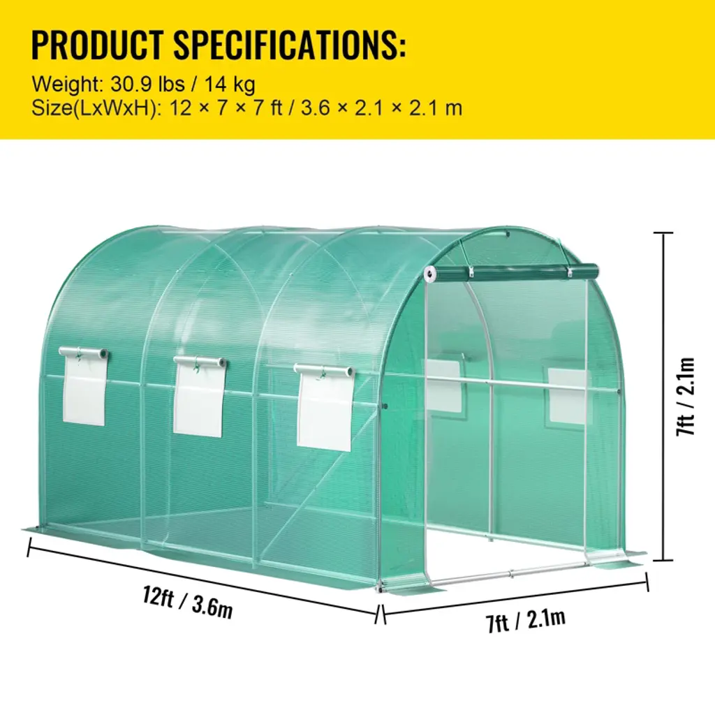 Feature: Excellent Air Ventilation: With 6 mesh windows, our tunnel greenhouse can keep out small "annoyances" and increase cross ventilation and airflow. Moreover, we have a roll-up zipped door for air to freely enter and exit. Keep your space clear of debris and make sure every breath you take is one to remember. Upgraded Galvanized Frame: We upgraded he galvanized steel to 0.8" diameter and 0.02" thickness. This high tunnel greenhouse has 3 top beams to prevent rain and snow buildup on the dome. Moreover, the diagonal poles can ensure stability during extreme weather. We have got you covered, so get ready to see your crops grow all year round. High-Quality Waterproof PE: The walk-in tunnel greenhouse comes with a PE cover, which can protect your plants from ultraviolet rays, rust, and rain all year round. The size of the cover fits the frame closely, enhancing the warmth and wind resistance in winter. Note: Not recommended for use in severe weather conditions. All Tools Included: The hoop house greenhouse is easy to assemble with connectors, and screw covers can prevent scratches and rust.Includes 4 ropes, stakes, and guy ropes for added security, stability, and strength. Note: Do not tighten screws until the final position is confirmed. Warm Home for Plants: Our 12 x 7 x 7 ft green house provides the best solution for cultivating vegetables, flowers and creating beautiful landscapes efficiently. The hoop house kit protects plants from the cold, frost, and hail in winter; it creates a better environment by increasing the air flow in summer. Package Content: 1 x Tunnel Greenhouse 2 x Spanner 4 x Stake 4 x Guy Rope 1 x PE Cover