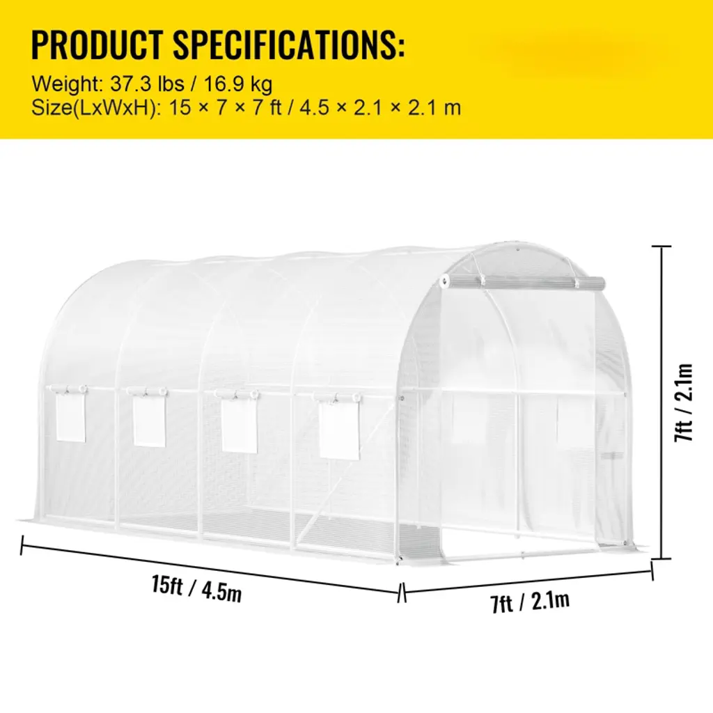 Vevor 15 X 6.5 X 7 Ft Walk-in Tunnel Greenhouse, Portable Plant Hot House With Galvanized Steel Hoops, 1 Top Beam, Diagonal Poles, White