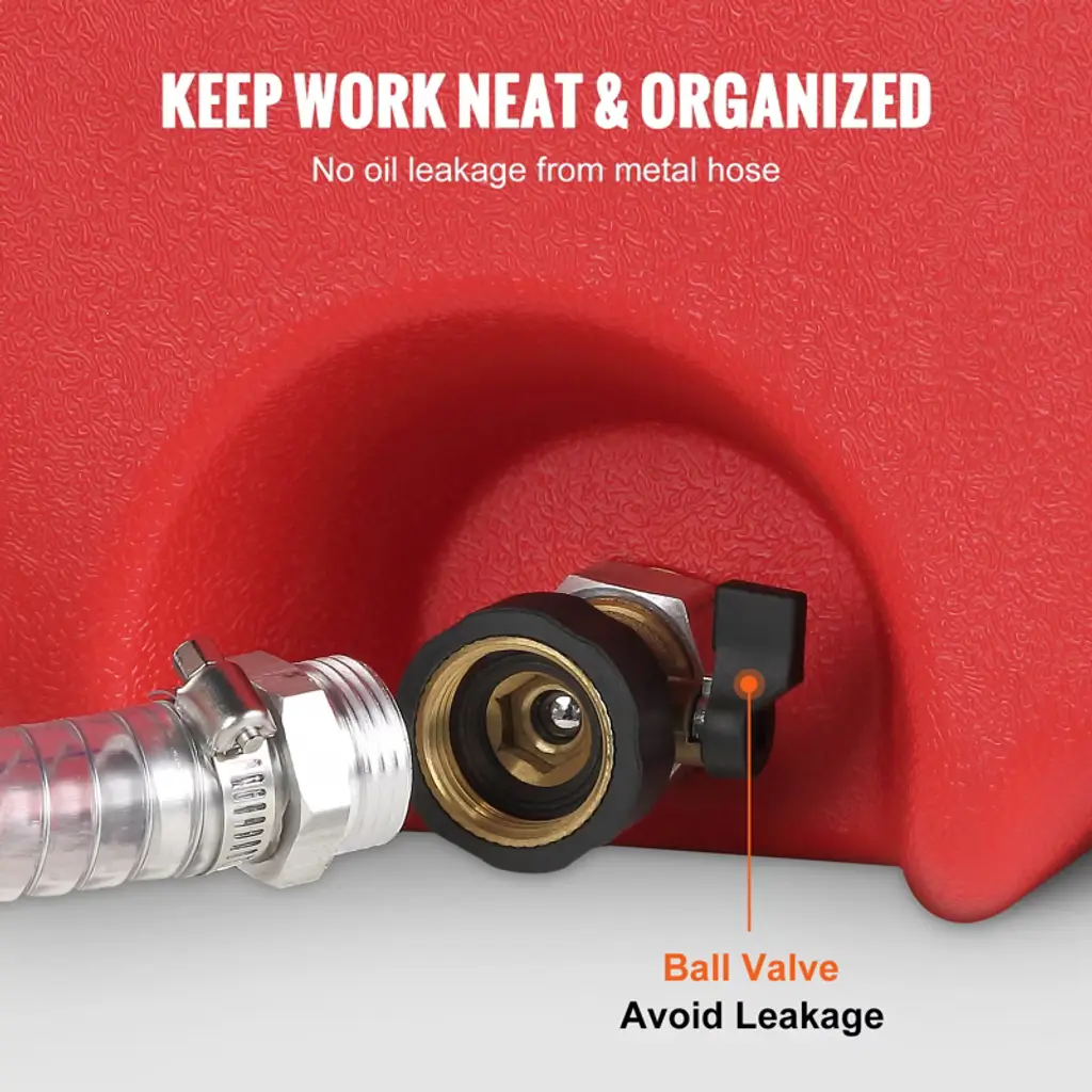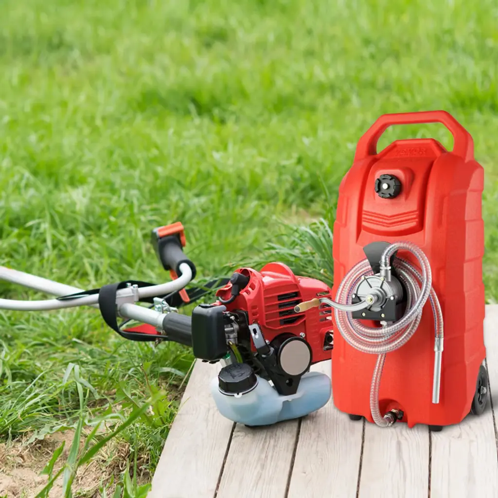 Feature: 16-Gallon Fuel Tank: The 16-gallon fuel tank capacity is 14% larger, easy to operate, and avoids frequent oil refills. This fuel caddy can be filled with gasoline, diesel, and machine oil, filling more machines at a time and improving working efficiency. 6-Inch Rubber Wheels: Equipped with 6-inch rubber wheels, this gas caddy is durable and suitable for concrete, wood, dirt, and tile, so you can easily move it to different places. Compared with ordinary plastic wheels, rubber wheels have more flexibility and lasts longer. Metal Wire Hose: The gas storage tank adopts an anti-bending metal wire hose, which significantly ensures that it won't be pulled off in the process of use. Unlike traditional rubber hoses, the metal wire hose will not collapse even after long-term use, making fuel filling convenient and fast. Anti-Leakage Ball Valve: The portable fuel tank is built with a ball valve, which has a strong anti-leakage effect and greatly improves the overall fuel utilization rate, maintains the machine neat, and makes your working environment more secure and comfortable. NOTE: The sealing ring at the ball valve has been tightened before delivery and cannot be tightened again with tools, as it may cause oil leakage. High-Efficiency Hand Pump: The portable gas tank features the hand-cranking method to deliver fuel, which is faster than the hand-pressure pump and provides a superb delivery efficiency of 4 gal/100 rpm. It is ideal for placing in truck trunks, garages, stores, scrap yards, kits, or sheds and is perfect for cars, motorcycles, boats, lawn mowers, snow blowers, etc. Package Content 1 x PTFE Tape 1 x User Manual