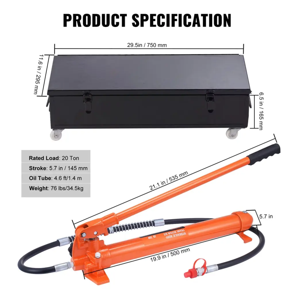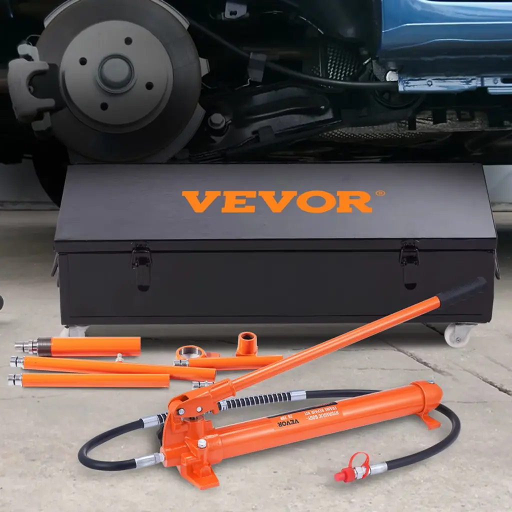 20 Ton Porta Power Kit, Portable Hydraulic Jack with 4.6 ft/1.4 m Oil Hose, Car Frame Repair Tool with Storage Case for Automotive, Heavy Equipment, Mechanic (44000 LBS) Feature: Heavy Load Capacity: 20-ton hydraulic pump provides you with the extra muscle you need to get the job done right. The pump has an automatic overload system to help prevent damage to rams and equipment. Make all bull-work repairs easier with VEVOR porta power kit! Leak-Proof and Rust-Proof: No more worries about oil leakage or rusting with the TPU seal and electrostatic powder spraying. The porta power kit is designed to provide sufficient working pressure while ensuring a long-lasting finish. The paint is resistant to oil, grease, and dirt, making cleaning easy even after extensive use. Perfect for All Your Needs: The portable hydraulic ram kit includes everything you need to complete your repair work! Hydraulic pump, hydraulic ram, 3pcs extension tubes, V-shaped head, wedge head, connector, flat base, spreader ram toe. You will be ready to take on any project without breaking a sweat. Tough Blow-molded Carrying Case: Every great tool needs a great box. Crafted from HDPE and passing rigorous drop tests, our toolbox promises lasting durability. All parts fit neatly inside the case, and with the added convenience of wheels, transporting your porta power kit from job to job has never been easier. Multi-function Auto Body Frame Repair Kit: This hydraulic ram kit is the perfect choice for auto-body repairs, frame repairs, and construction sites. Bend, lift, push, straighten and spread metals with this industrial-quality hydraulic kit! The quality components and fittings make this unit perfect for those looking for quality and precision all day! Package Content: 3 x Extension Tube 1 x Connector 1 x Handle 1 x Base 1 x V-shaped Head 1 x Spreader Ram Toe 1 x Wedge Head 1 x User Manual