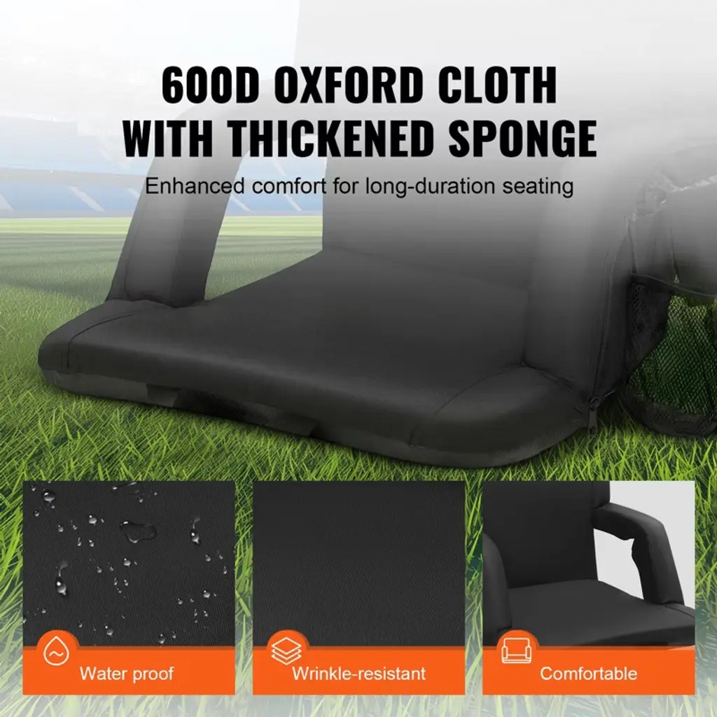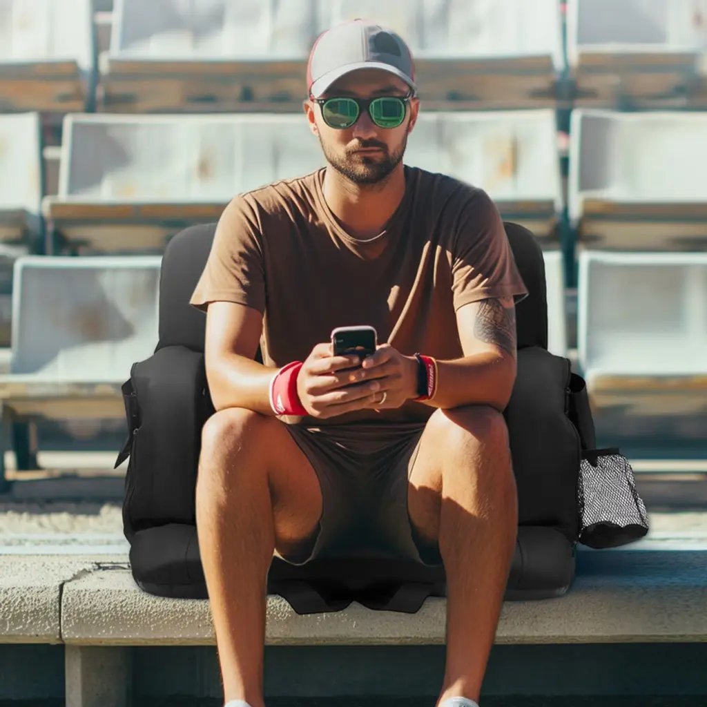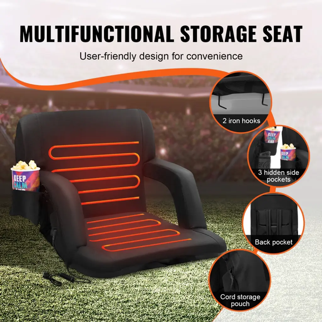 Feature: High-Quality Material: This bleacher seat back is made with a lightweight solid frame, thickened high-density sponge, and 600D waterproof Oxford fabric cover, making it durable and wear-resistant. It provides enhanced comfort for long durations of sitting. The weather-resistant surface treatment makes it easy to clean and maintain, keeping it dry in light rain or snow. The seat is widened to 22 inches, accommodating most people. 3-Level Heating Mode: The chair is powered by any USB battery (NOT included). This portable reclining chair features dual heating and three-level temperature control, allowing you to heat both the seat and backrest. Comfortable to use in any season, it keeps you warm while watching exciting games in cold weather. Portable Seat: With an easy-to-move foldable design, the stadium seat chair can be flattened in one step and packed easily into a backpack, taking up minimal space in your car trunk. Perfect for parties, concerts, picnics, and spectator events. Equipped with multiple side pockets, each designed for different uses such as a cellphone pocket and a back pocket, it enhances your convenience at events. 6-Position Adjustable Backrest: The folding stadium seat offers 6 adjustable reclining angles, including 90°, 105°, 130°, 145°, 160°, and 180°. Adjust the seat by pushing it past the foremost position, and then push it back to get a flat position. This adjustment provides ample support, maintaining a comfortable posture even during hours-long events. Safe and Stable: The bottom features two iron frames that can quickly and easily secure your seat to most stands and benches. No worries about your seat falling off the stands, allowing you to fully enjoy watching the game. Package Content 2 x Stadium Seats 1 x Set of Accessories