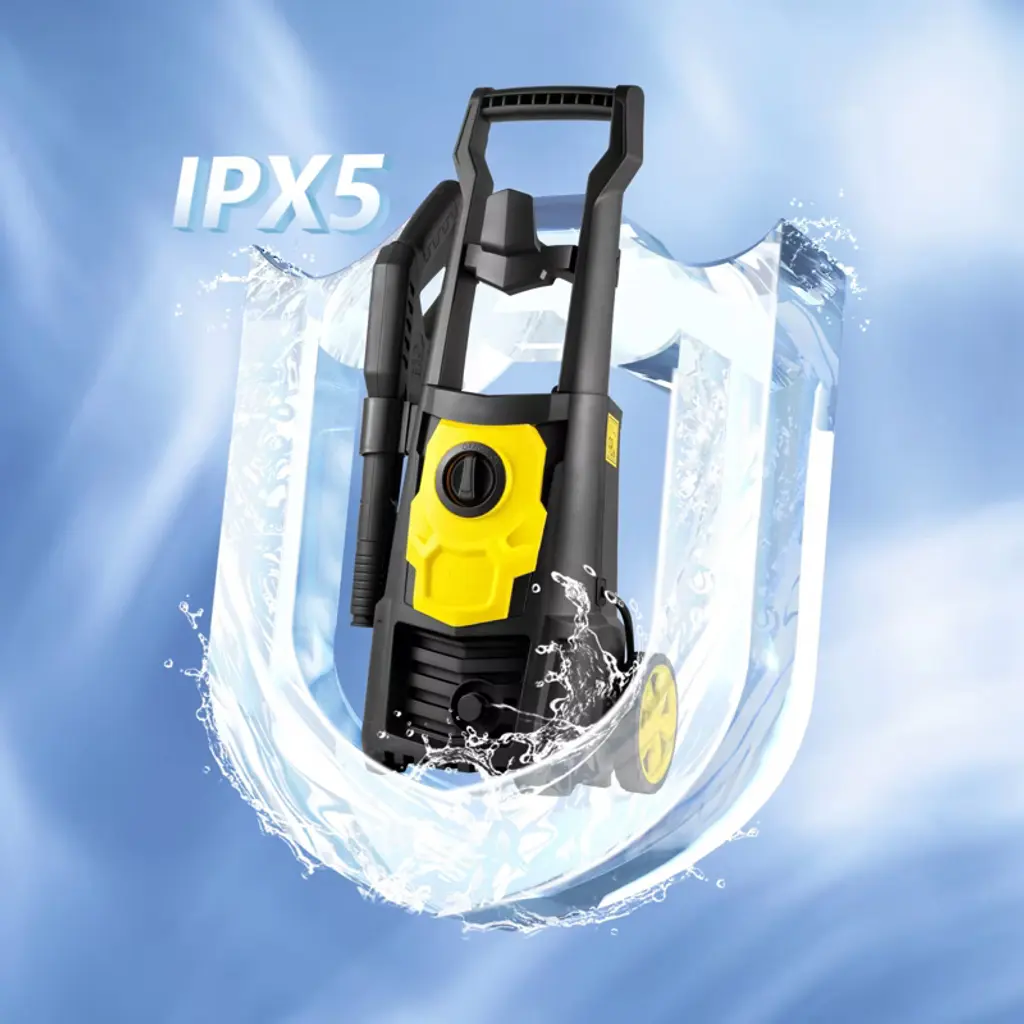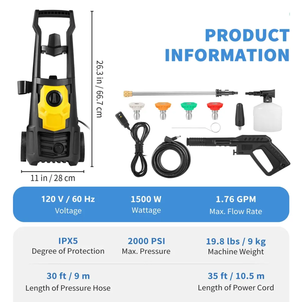 Feature: 2000PSI High-pressure Washer: Built with a powerful 1500 W motor that generates a high water flow rate of up to 1.76 GPM. Hence, VEVOR’s electric pressure washer can completely clean up old paint, oil, weed, and other stubborn stains. Ideal for homes, RVs, patios, fences, decks, driveways, cars, lawn equipment, etc. Automatically stops working when temperatures reach over 105℃, ensuring ultimate security and consistent high quality performance. It is ETL certified. Extended Hose & Leak-proof: A 30 ft hose allows for flexible cleaning in any large area. Our high-pressure washer adopts a sturdy metal water inlet and outlet to avoid water leakage, so you no longer have to worry about water spraying everywhere. Get ready to get every job started right. Easy to Move & Install: Our power washer made of compact PP plastic features effortless transportation due to an ergonomic handle and 2 universal wheels. Also, just one person is needed to complete the assembly in minutes, which means you'll get your cleaning chore done faster and easier with less strain and fatigue. Provide Security for You: Are you tired of your energy depleting rapidly? Well, get ready to run longer and better. Built-in TSS (Total Stop System) automatically shuts off the pump when the trigger is not engaged to save energy and prolong the service time of the electric power washer. A press-type security lock prevents the spray gun from being engaged accidentally. We recommend not using it for over 3 hrs at a time. 5 Nozzles for Different Jobs:The pressure washer provides 5 quick-connect metal spray nozzles ( 0°/ 15°/ 25°/ 40°/ Turbo Nozzle ) and a 500 ml self-spraying detergent bottle for best suiting your different cleaning tasks. The water inlet filter makes the water nozzles spray smoothly without any blockage. Therefore, you do not need to change nozzles frequently, saving unnecessary expenses. Package Content 1 x High Pressure Washer 4 x Spraying Nozzle 1 x Turbo Nozzle 1 x Cleaning Tool 1 x Spraying Lance 1 x Trigger Gun 1 x Detergent Bottle 1 x Power Cord