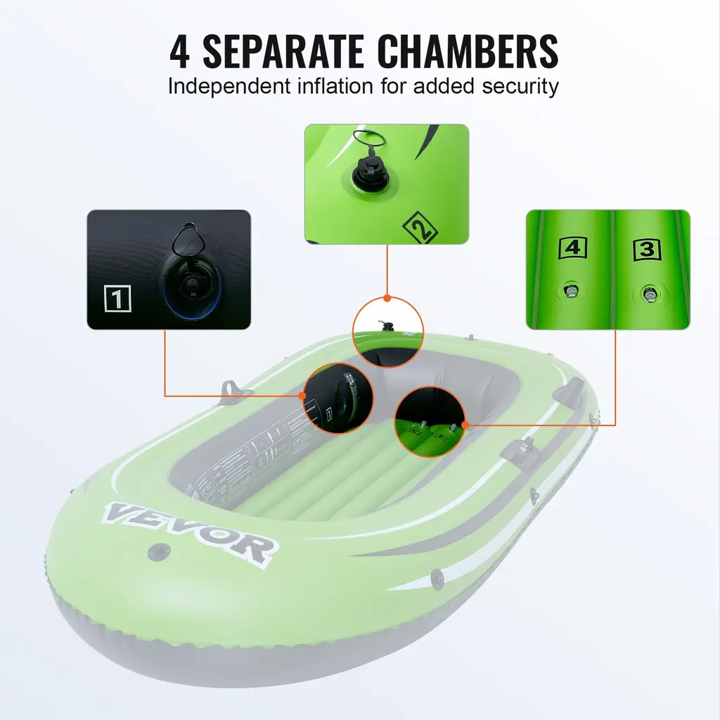 Four-Person Capacity: The inflatable boat can support up to 1100 lbs/499 kg、750 lbs/340 kg、500 lbs/226.8 kg、1100 lbs/499 kg, offering a spacious interior for comfortable seating and ample legroom. Easily foldable for storage, it fits in the trunk for convenient transport to your aquatic adventures, making it an ideal choice for water play and fishing. Enhanced PVC Durability: Constructed from thick, enhanced PVC, this inflatable raft boasts superior tensile strength and puncture resistance, ensuring reliable performance in marine conditions. Its large, thick base enhances stability and is designed to resist cuts and wear from sand when beached. Safety-Focused Design: Our inflatable fishing boat features 6 independent air chambers to enhance safety on the water. If one chamber is compromised, the others remain inflated, ensuring you can safely return to shore. Rust-Resistant Paddles Included: The inflatable dinghy boat comes with two extended, thick oars that resist deformation and breakage, allowing for efficient navigation with minimal effort. The aluminum alloy paddles with PP blades are built to withstand corrosion from saltwater. Ready to Use: This inflatable fishing raft includes an air pump, a 23-foot/7m rope, a gear pouch, 2 inflatable seats, a repair kit, and more, reducing the need for additional purchases. With an integrated fishing rod holder and a cord lock for easy docking and transport, it's equipped for immediate enjoyment right out of the box. Package Content 1 x Inflatable Boat 2 x Oar Sets 1 x Pump 1 x Gear Pouch 2 x Air Nozzles 2 x Fishing Rod Holders 1 x Repair Kit 1 x 23 ft/7 m Grab Rope 1 x Vent Line 2 x Inflatable Seats