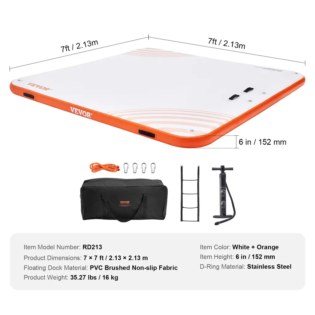 Enjoy Pleasant Water Fun: Immerse yourself in water activities with VEVOR inflatable floating dock! Engineered from high-density 2700g/㎡ PVC brushed fabric, it offers a non-slip and durable surface for stability and safety. The included dual-action hand pump with pressure gauge ensures quick and effortless inflation and deflation, making setup a breeze for all. Lightweight & Portable: Measuring 10*10 ft / 8*6 ft / 7*7 ft /6*5 ft /10*8 ft / 15*6 ft / 8*5 ft, our spacious floating dock platform offers ample space for relaxation.Lightweight and foldable, it can be effortlessly transported in the included carrying bag. With HR inflation valves, 6-inch thickened design and reinforced bonding, revel in secure playtime without breakage or leakage. Secure Anchoring, Happy Playtime: Stay anchored in peace with our reliable system. Featuring 6 stainless steel D-rings, 4 galvanized iron hooks, and a 10-foot nylon rope, our water floating dock mat remains steadfast in the water. Corrosion-resistant hooks enhance durability, letting you enjoy endless water adventures. Convenient Soft Ladder Included: With a detachable four-step soft ladder, getting on and off the floating platform is a breeze. Perfect for kids and adults alike, it is especially suitable for those with weaker swimming abilities, making your water adventures more enjoyable and secure. Multi-Purpose Water Playground: From swimming, diving, and sunbathing to yoga and fishing, our floating island raft air mat offers endless possibilities for summer enjoyment. Ideal for family gatherings or solo relaxation, it's an ideal water playground to spend fantastic water playing time with friends and family. Package Content 1 x Nylon Rope4 x Hook Anchors 1 x Dual-Action Hand Pump with Pressure Gauge 1 x Carry Bag 1 x Soft Ladder 1 x Woven Cable Tie