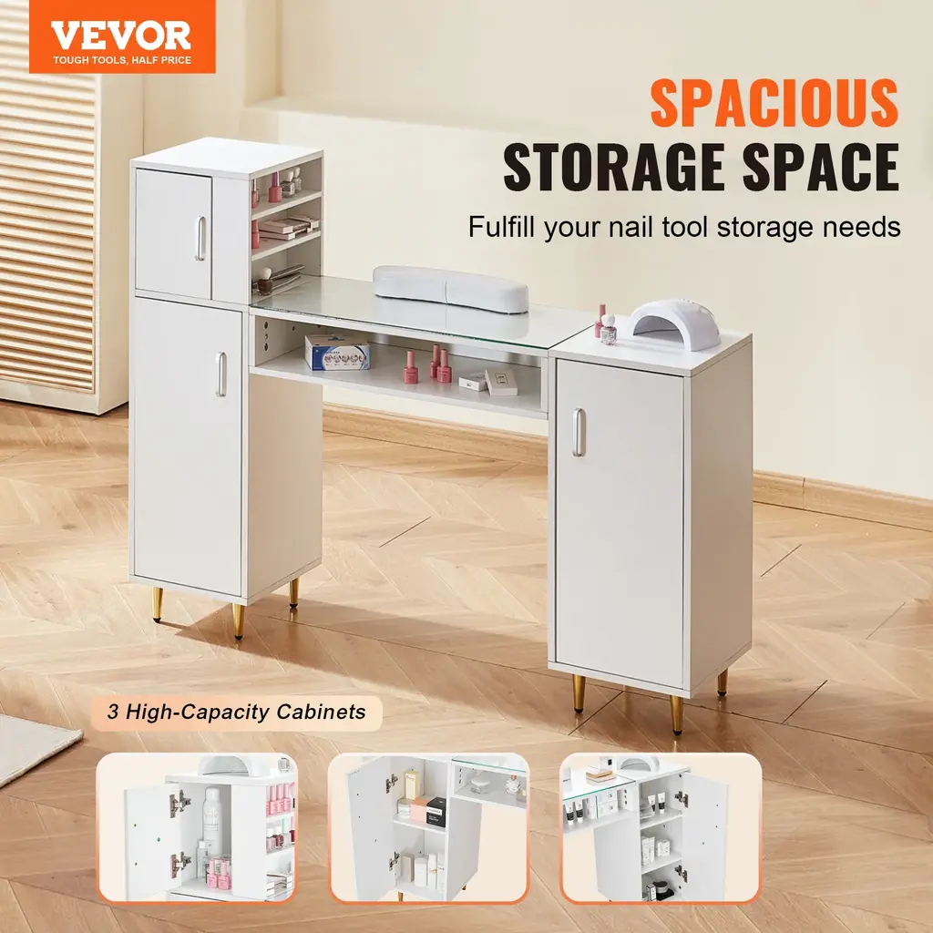 Strong Suction Dust Collector (with Electric Dust Collector option): No worries about flying nail scraps and dust! VEVOR manicure table is built with a powerful electric dust collector, with one click to quickly collect crumbs and debris during manicure sessions. With 3 reusable dust bags included, maintaining a clean workspace has never been easier. High-Quality and Easy to Maintain: Crafted from premium medium-density fiberboard (MDF), our sturdy nail desk workstation is resistant to water and bending. It's the perfect blend of practicality and durability for long-lasting manicure service. Move with Ease (with Electric Dust Collector option): 8 smooth rolling wheels (8 lockable) offer great mobility, allowing you to move this beauty salon nail station to the desired location. 8 lockable wheels feature reliable brakes for quick-stop-function, enabling you to lock the nail desk freely and keep it stable in place. Ample Storage Space (with Electric Dust Collector option): Keep your manicure essentials organized! With 3-tier open shelves and 1 spacious cabinet, our manicure nail tech desk provides ample storage for various manicure tools. No more cluttered workspace—everything has its place, making your nail art easier and efficient. Super Large Storage Capacity (no Electric Dust Collector option): VEVOR manicure table comes with 3 high-capacity cabinets(6 independent storage spaces), 3-tier side-open shelves and an open drawer, perfectly catering to your manicure tool storage needs. Whether it's nail polish, brushes, or other essential supplies, they can be easily and orderly stored within. Versatile & Fashionable: Beyond a manicure table, our moveable manicure nail art station serves multiple purposes—it doubles as a makeup table in salons and bedrooms or as a computer desk in the living room. Whether for commercial or home use, it's the perfect choice for versatility and functionality. with Electric Dust Collector Package Content3 x Dust Bags 1 x Hand Pillow 1 x Cross Screwdriver 1 x Fuse 1 x Pack of Screws 2 x Door Hinges 8 x Wheels no Electric Dust Collector Package Content 1 x Wrist Rest 1 x Pack of Screws 1 x Screwdriver