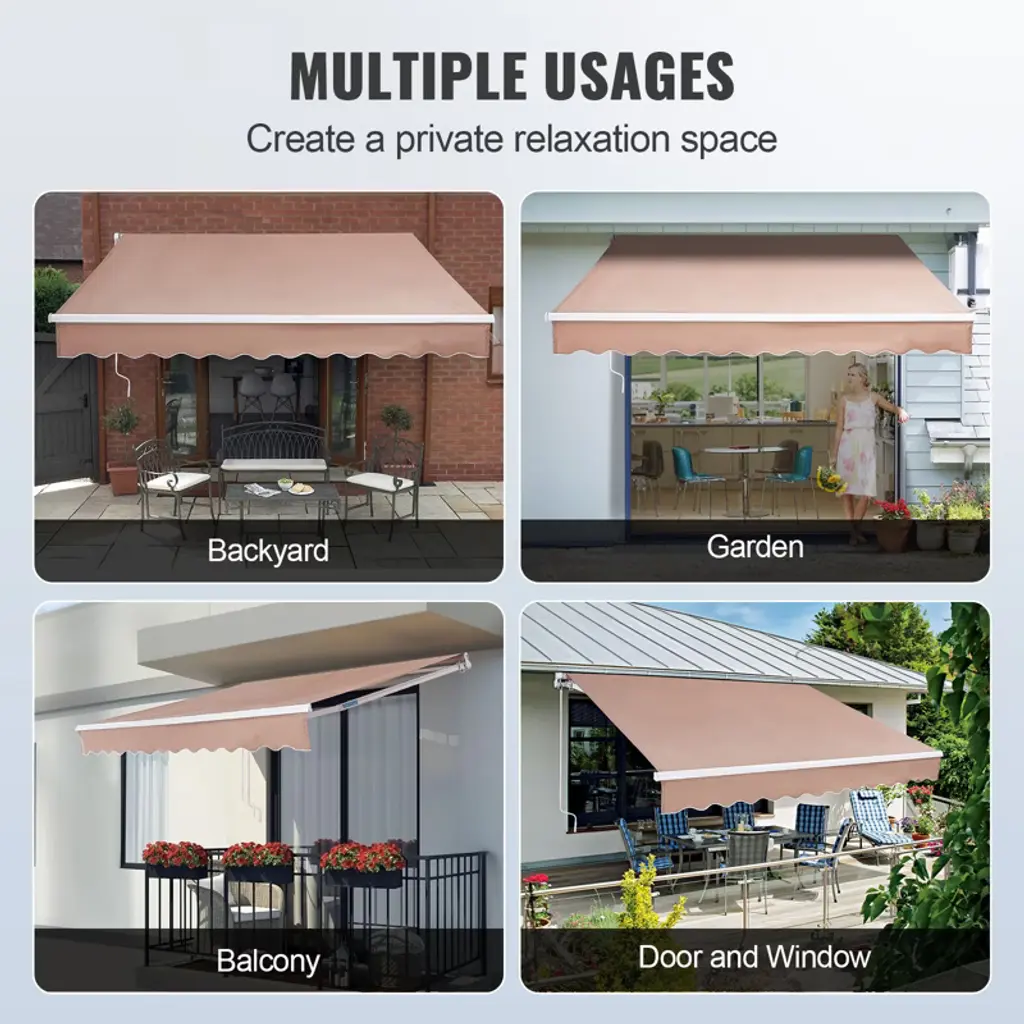 Feature: Sunshade for Rain or Shine: Tired of scorching summers? Our 8x7 ft patio awning retractable has you covered. With a 280g polyester canopy and a waterproof PU coating, featuring a UV80+ rating, it shields you from UV rays and keeps you dry. It boasts colorfastness, durability, and is perfect for relaxing in your yard. Built to Last: This manual retractable awning features robust steel tube supports with enhanced durability and wear resistance. The connections are secured with screws for added stability and wind resistance (up to 4th level). The thickened aluminum top tube ensures the awning remains taut and prevents fabric sagging. We recommend retracting it during storms to prolong its lifespan. Easy Angle Adjustment: Simply turn the crank handle to adjust the awning sunshade shelter's angle from 40° to 90° for versatile shade in any weather. The operation is effortless and convenient. Installation Instructions: Assembly requires three people. Recommended installation height: 8'-12'. A manual and installation hardware are included. Recommend to install on the concrete wall or large brick wall. Professional advice may be needed depending on your wall type. Tools required (not included): drill with drill bit, tape measure, and wrench. Note: During installation, please make sure the top contact surface is flat and level, without any tilt. Versatile Use: Commercial grade retractable awning is ideal for businesses like restaurants, cafes, markets, and warehouses, offering shade and rain protection. It's also perfect for residential spaces like yards, gardens, balconies, and windows, providing comfortable and cool relaxation. Package Content: 1 x Manual Retractable Awning 1 x Crank Handle