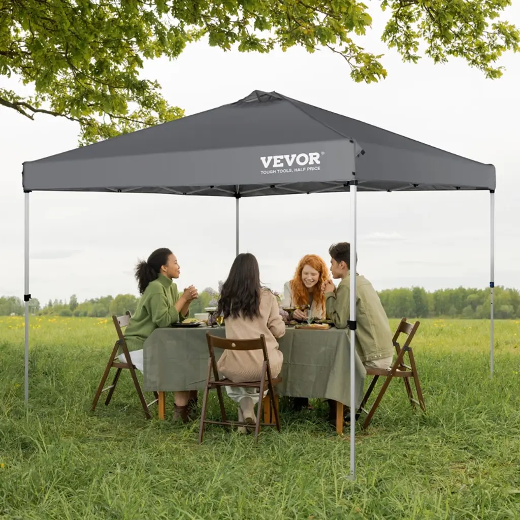 Pop Up Canopy Tent, 10 x 10 ft, 250 D PU Silver Coated Tarp, with Portable Roller Bag and 4 Sandbags, Waterproof and Sun Shelter Gazebo for Outdoor Party, Camping, Commercial Events, Dark Gray Description: Large & Comfortable Pop-up Canopy: Have you been dreaming of a temporary party space? Well, get ready to enjoy 100 square feet for a party in just 1 minute! Our pop-up canopy tent measures 10 x 10 ft and has three adjustable heights, with a maximum internal height of 9ft. It has a spacious design that can comfortably accommodate 6-8 people, making it the perfect place to provide enough shade and keep a crowd impressed. Quality Meets Performance: Our pop-up tent has you covered with top-of-the-line features for a safe and comfortable experience. It's made from a 250D PU silver coated fabric that provides UPF 50+ UV protection and CPAI-84 flame-retardant protection. The added top cover edging and waterproof stickers on all sides ensure that rainwater slides off instantly without accumulating or leaking. So, even on rainy days, you can have an enjoyable party without worrying about the weather. Reinforced Frame for Peace of Mind: Our canopy tent is built to last, with features that ensure durability and stability. It's made of powder-coated steel pipes, which prevent cracking, rusting, and corrosion. The upgraded aluminum beam joint further enhances stability. Additionally, the glide truss washers and air vent on the top help mitigate wind damage to the support. We provide 4 sandbags as a bonus, providing you with further support on windy days! Stand up to all weather conditions! Move on the Go: Portable Design: Our pop-up canopy comes with a wheeled storage bag and a specialized accessory bag for 8 medium-sized ground nails and 4 ropes. It has a compact folded size of 47.2 x 8.3 x 8.3 inches (120 x 21 x 21 cm), making it easy to carry and store in most vehicle trunks. Hassle-free Assemble: Setting up our 10'x10' canopy is a breeze. Just take out the preassembled frame from the bag, open it up, place the canopy over the frame, and extend the legs. Sandbags and stakes are included to ensure maximum stability. This canopy is perfect for outdoor entertainment, including camping, picnics, and commercial events. Package Content: 1x Frame 1 x Tarp 1 x Wheeled Bag 8 x Stakes 4 x Ropes 4 x Sand Bags 1 x User Manual