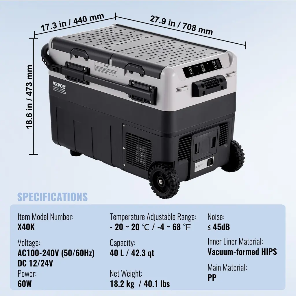 Large Capacity: The portable refrigerator freezer has a dual compartment capacity of 40 L/42.3 qt / 50 L/52.8 qt / 58 L/61.5 qt. This robust RV fridge can hold 49 cans of 330ml cola or 26 bottles of 550ml water or 10 bottles of 750ml red wine( 40 L/42.3 qt option) / 64 cans of 330ml cola or 36 bottles of 550ml water or 12 bottles of 750ml red wine( 50 L/52.8 qt option) / 94 cans of 330ml cola or 34 bottles of 550ml water or 22 bottles of 750ml red wine ( 58 L/61.5 qt option), accommodating seafood, snacks, meats, and beverages, meeting the needs of long trips such as travel, boating, and camping. 2H Rapid Cooling: This 12V car fridge uses compressor cooling technology, reaching -20°C / -4°F shutdown point in approximately 2H at 77°F ambient temperature. It cools quickly and operates normally even when tilted up to 45 degrees, making it your companion for outdoor camping or work, keeping your food fresh. No need for ice cubes, preventing food spoilage and saving money and space.LED Screen: The LED control panel allows you to directly view the operation status of the car fridge and adjust the temperature range at any time. You can set any temperature between -20°C to 20°C / -4°F to 68°F on the panel. Quiet & Energy Efficient: The fridge operates with noise ≤ 45dB, ensuring you sleep well after long drives. You can also choose between ECO and Max modes via the LCD touchscreen. In ECO energy-saving mode, the operating power of this portable fridge is less than 41W( 40 L/42.3 qt option) / 45W( 50 L/52.8 qt option) / 54W( 58 L/61.5 qt option). Even when running in MAX mode (62W for 40 L/42.3 qt option / 61W for 50 L/52.8 qt option/ 71W for 58 L/61.5 qt option) , its intelligent circulation consumes less than 1 kWh/day. Dual Use for Home/Car: Designed with sturdy wheels and a telescopic handle for effortless and stable transportation. Additionally, the car fridge is equipped with 110/240V AC and 12/24V DC adapters, making it suitable for use at home, on yachts, RVs, cars, trucks, and vans. Package Content 1 x Portable Car Refrigerator 1 x Adapter 1 x Cigarette Lighter Cord 2 x Wheels 1 x User Manual