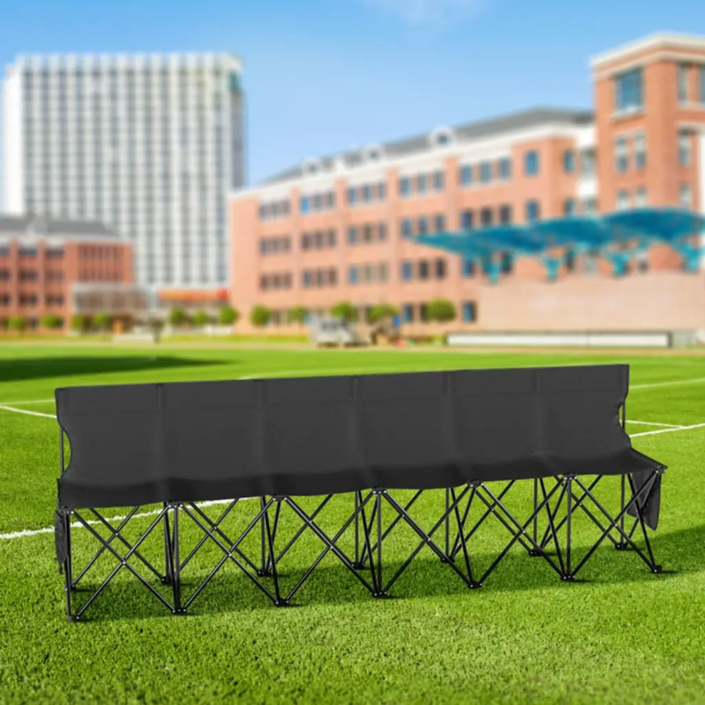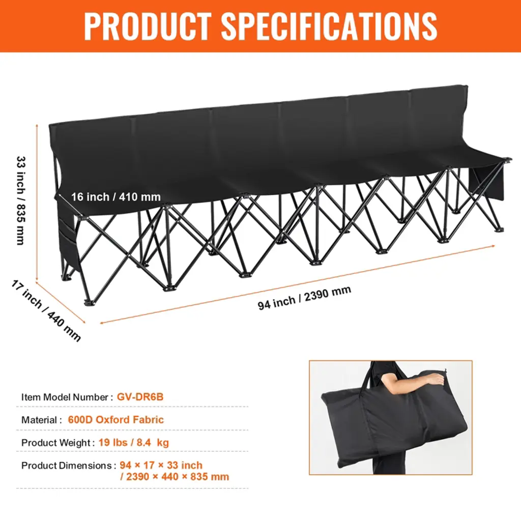 Feature: Comfortable Seating: This 94x17x33 inch/2390x440x835 mm portable 6-person folding bench is highly portable and lightweight. The foldable sideline bench comes with a backrest for comfortable seating. No assembly required, just open the package and use. Humanized Design: The portable camping folding bench chair has side pockets on both sides, perfect for placing coach boards, first aid kits, phones, keys, and other items. The humanized design offers more convenience. Safe and Stable: Made from high-quality 600D Oxford fabric, the folding team sports sideline bench is strong and reliable, providing you with comfort. The foldable bench seats feature a solid frame, and has a stable structure. Easy to Fold and Move: This team bench is easy to transport, and its efficient storage design maximizes space utilization, allowing you to make the most of your available space. Whether outdoors or indoors, on the court, at party gatherings, or in commercial venues, it takes just a few seconds to set up. Wide Application: The portable folding chair has a wide range of uses and is suitable for people of all ages. Athletes and team members can rest on the folding chair during soccer, basketball, and other sports events. It can also be used for outdoor activities, travel, and camping. Package Content: 1 x Portable Folding Bench Set 1 x Carry Bag 1 x Instruction