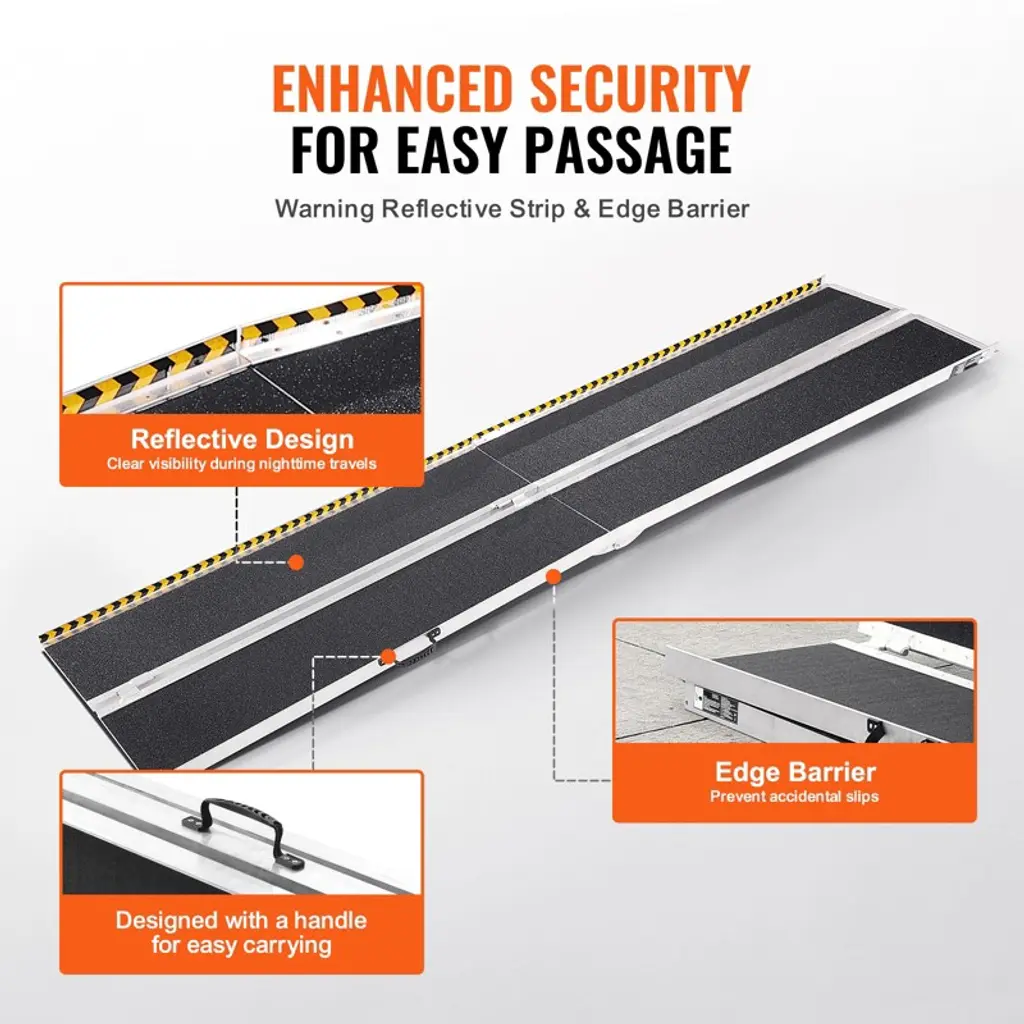Feature: Foldable Design: Our folding wheelchair ramp is your ultimate mobility solution! Easily foldable and with a convenient carry handle, it's designed for on-the-go freedom. Unfolded, it measures 120.08 x 28.9 x 3.15 in/305 x 73.4 x 8 cm, and when folded, it's compact, fitting snugly in a corner at home or your car trunk. 800 lbs High Load Capacity: With an impressive weight capacity of up to 800 lbs/363 kg, our portable handicap ramp provides unmatched stability. Its non-slip surface ensures traction even on rainy days or slippery surfaces, providing you peace of mind and security wherever you go. Security First: Equipped with the reflective strip and edge barrier, our portable wheelchair ramp prioritizes security. These features enhance visibility in low-light conditions and prevent accidental slips or collisions, ensuring a smooth and secure journey every time. Quick Setup: Say goodbye to complicated installations! Our portable ramp unfolds effortlessly for quick and hassle-free use. Plus, we include a pair of gloves to keep your hands clean and protected while setting up – it's all about making your experience as smooth as possible. Versatile Convenience: Whether it's for home use or in commercial settings, our wheelchair ramp is your go-to solution. Perfect for walkers, scooters, wheelchairs, canes, or strollers, it provides seamless accessibility wherever you need it. Don't let mobility challenges hold you back – choose our ramp and make every trip a breeze! Package Content: 1 x Wheelchair Ramp 1 x Pair of Gloves