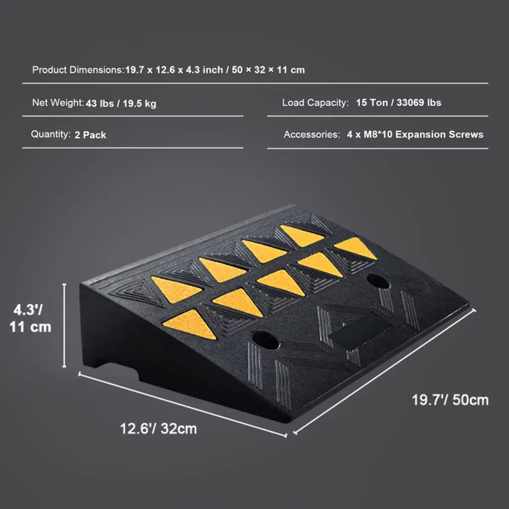 Feature: 33069 lbs Bearing Capacity: VEVOR rubber curb ramp provides you with a smooth and stable slope transition, with a super strong bearing capacity of up to 15 tons. The bottom adopts a grid design to strengthen the compression and shock absorption capabilities. You can use it for uphill climbing of cars, carts, strollers, wheelchairs, etc. Premium Material: The car ramp is made of natural rubber material, which ensures the advantages of high-temperature resistance, wear resistance, and not being easy to deform. It has no irritating smell and only a slight rubber smell, making you feel more at ease when using it. Non-slip and Hydrophobic: The non-slip textured design on the surface enhances friction and traction and is not easy to slip in rainy and snowy weather; the bottom drainage groove design does not leave the water, does not produce a peculiar smell, and is more hygienic. High Visibility: The ramp's surface is designed with eye-catching reflective strips so that you don't have to look for the location of the ramp in the dark. It can be clearly identified at night, and the vehicle can be transported quickly and safely. Not Easy to Shift: The driveway ramp has screw grooves. You can use the expansion screws in the accessories to drill and fix, providing you with a permanent ramp fixing solution placed in garages, doorways, roadsides, supermarkets, etc. Package Content: 1 x Rubber Threshold Ramp 4 x M8*10 Expansion Screws