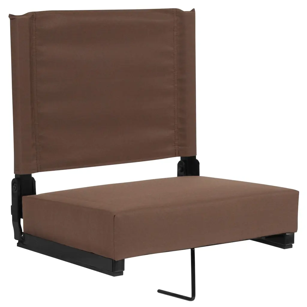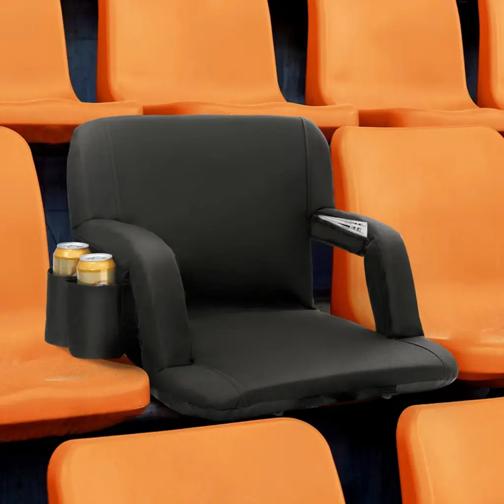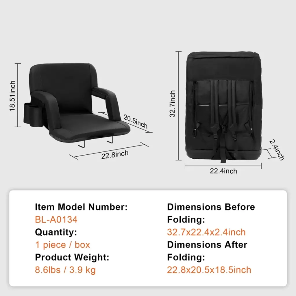 Feature: High-Quality Material: This bleacher seat back is made with a lightweight solid frame, thickened high-density sponge, and 600D waterproof Oxford fabric cover, making it durable and wear-resistant. It provides enhanced comfort for long durations of sitting. The weather-resistant surface treatment makes it easy to clean and maintain, keeping it dry in light rain or snow. The seat is widened to 22 inches, accommodating most people. Multiple Storage Features: This outdoor stadium seat is equipped with multiple side pockets, each designed for different uses such as a cellphone pocket and a back pocket. It's perfect for storing water bottles, snacks, tissues, etc., making your spectator experience more convenient. Portable Seat: The portable reclining stadium seat chair features an easy-to-move foldable design that can be flattened in one step and easily packed into a backpack to take away. It's an ideal choice for watching professional sports and also great for parties, concerts, picnics, etc. It occupies minimal space and can be easily stored in the trunk of a car. 6-Position Adjustable Backrest: The folding stadium seat offers 6 adjustable reclining angles, including 90°, 105°, 130°, 145°, 160°, and 180°. Adjust the seat by pushing it past the foremost position, and then push it back to get a flat position. This adjustment provides ample support, maintaining a comfortable posture even during hours-long events. Safe and Stable: The bottom features two iron frames that can quickly and easily secure your seat to most stands and benches. No worries about your seat falling off the stands, allowing you to fully enjoy watching the game. Package Content 1 x Stadium Seat 1 x Set of Accessories
