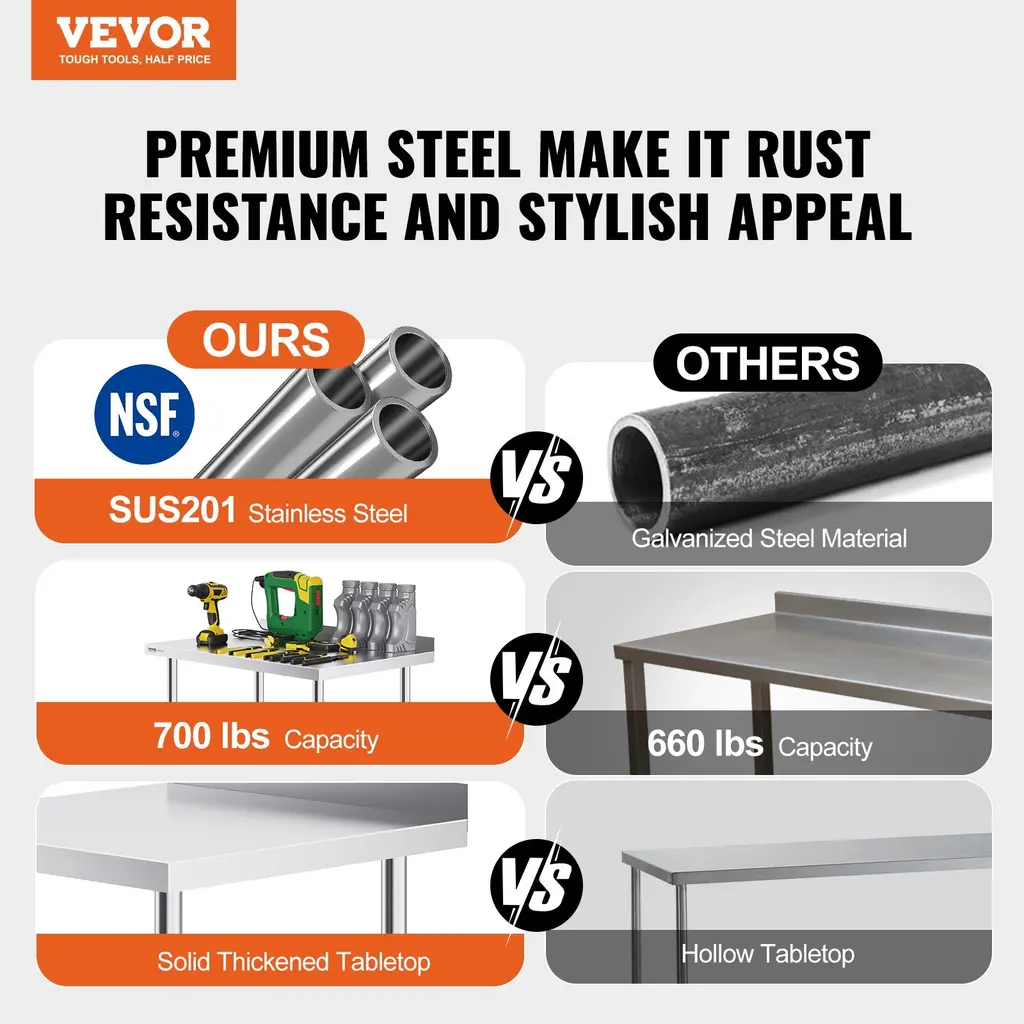ATTENTION: For your security, gloves are required during assembly. High-Quality Stainless Steel: This work table, measuring 24 x 60 x 40 inch / 24 x 48 x 40 inch / 24 x 36 x 40 inch / 24 x 30 x 40 inch / 24 x 24 x 40 inch / 24 x 15 x 40 inch, is made from SUS201 stainless steel for the tabletop, shelves, and legs. It offers superior rust resistance, a sleek appearance, and a smooth surface that is easy to clean with a simple wipe. NSF certified, it meets strict public health standards, ensuring long-lasting protection for your health. Stable and Durable: With an upgraded thickness of 0.8mm, this table is sturdy and durable, providing ample storage for your supplies and allowing you to stack your favorite ingredients easily. User-Friendly Design: Featuring 3-level adjustable shelves, this work table offers the most user-friendly and practical functionality. Simply adjust the shelf height with screws to accommodate items of different sizes. Equipped with 4 swivel casters, including 2 with brakes, the table remains stable and can be easily moved to any location. The high rear backsplash prevents items from falling off and guards against water splashes. Versatile Applications: Beyond storage, our table can be used for chopping vegetables, kneading dough, cutting meat, and other kitchen-related tasks. It is perfect for use in bars, restaurants, hotels, buffets, catering events, school activities, or office break rooms.Practical Sizes: Available in various sizes to perfectly fit your kitchen needs. Whether for commercial kitchens, home renovations, or your garage setup, our professional-grade stainless steel work table series is designed for lasting performance and reliability. We recommend measuring your space before purchasing. Package Content 1 x Table 8 x M6 Hexagon Socket Screws 1 x Hexagon Socket Wrench 4 x Adapter Sleeve4 x Caster 3inch 1 x Instruction Manual