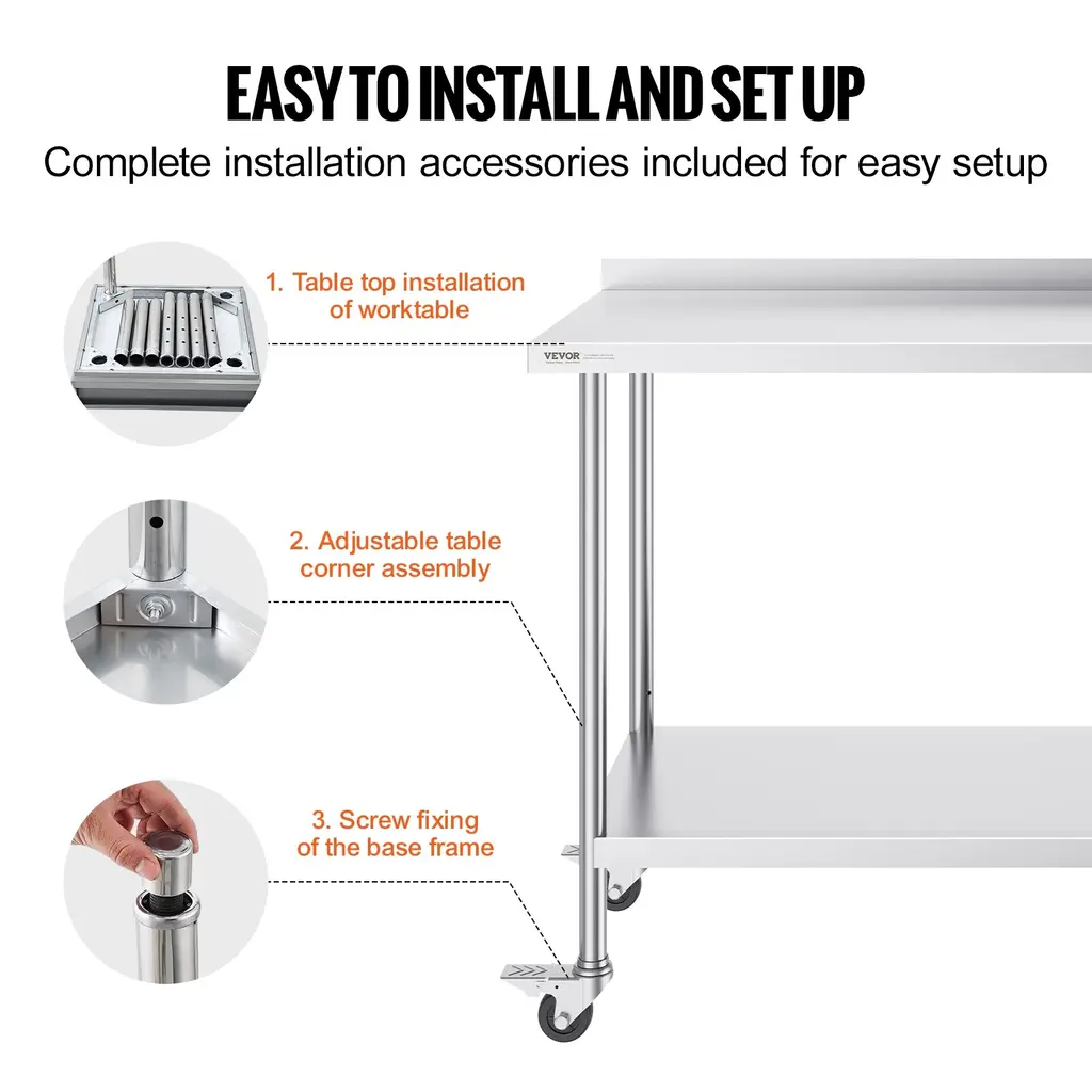 ATTENTION: For your security, gloves are required during assembly. High-Quality Stainless Steel: This work table, measuring 24 x 60 x 40 inch / 24 x 48 x 40 inch / 24 x 36 x 40 inch / 24 x 30 x 40 inch / 24 x 24 x 40 inch / 24 x 15 x 40 inch, is made from SUS201 stainless steel for the tabletop, shelves, and legs. It offers superior rust resistance, a sleek appearance, and a smooth surface that is easy to clean with a simple wipe. NSF certified, it meets strict public health standards, ensuring long-lasting protection for your health. Stable and Durable: With an upgraded thickness of 0.8mm, this table is sturdy and durable, providing ample storage for your supplies and allowing you to stack your favorite ingredients easily. User-Friendly Design: Featuring 3-level adjustable shelves, this work table offers the most user-friendly and practical functionality. Simply adjust the shelf height with screws to accommodate items of different sizes. Equipped with 4 swivel casters, including 2 with brakes, the table remains stable and can be easily moved to any location. The high rear backsplash prevents items from falling off and guards against water splashes. Versatile Applications: Beyond storage, our table can be used for chopping vegetables, kneading dough, cutting meat, and other kitchen-related tasks. It is perfect for use in bars, restaurants, hotels, buffets, catering events, school activities, or office break rooms.Practical Sizes: Available in various sizes to perfectly fit your kitchen needs. Whether for commercial kitchens, home renovations, or your garage setup, our professional-grade stainless steel work table series is designed for lasting performance and reliability. We recommend measuring your space before purchasing. Package Content 1 x Table 8 x M6 Hexagon Socket Screws 1 x Hexagon Socket Wrench 4 x Adapter Sleeve4 x Caster 3inch 1 x Instruction Manual