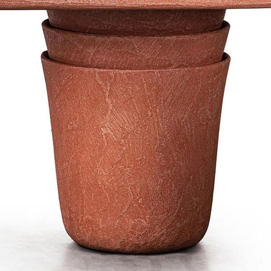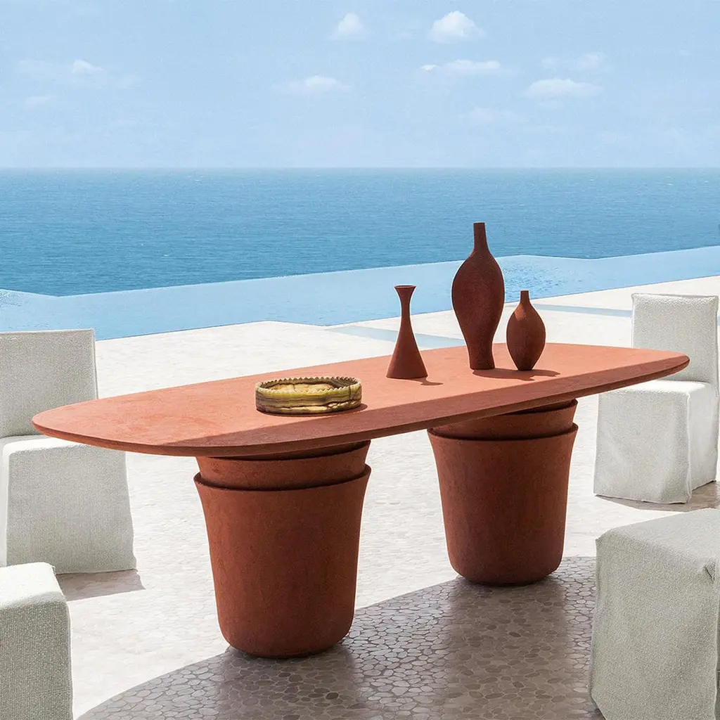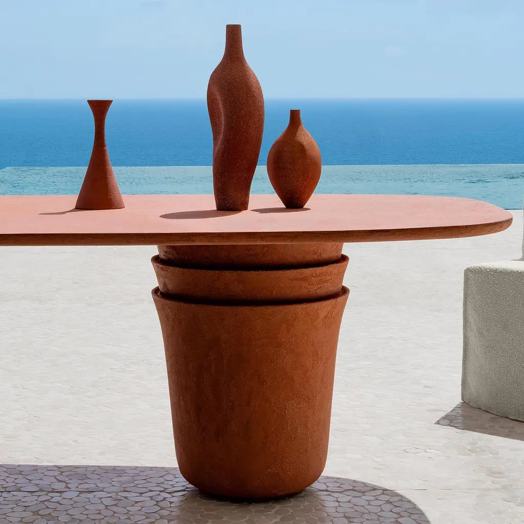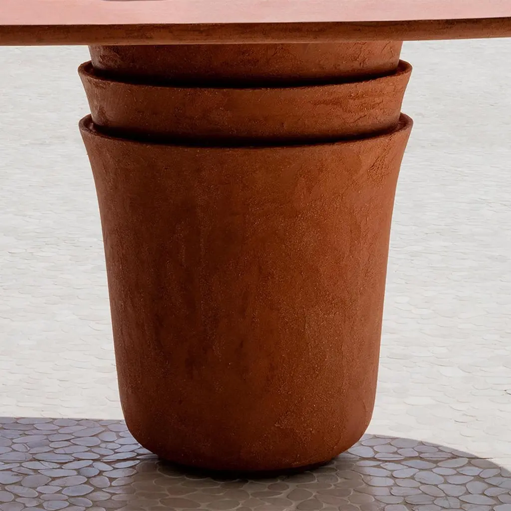 Table vick coral large outdoor with wooden top in coral finish and with 2 bases in resin polymer in coral finish.Also available in cement finish, on request.