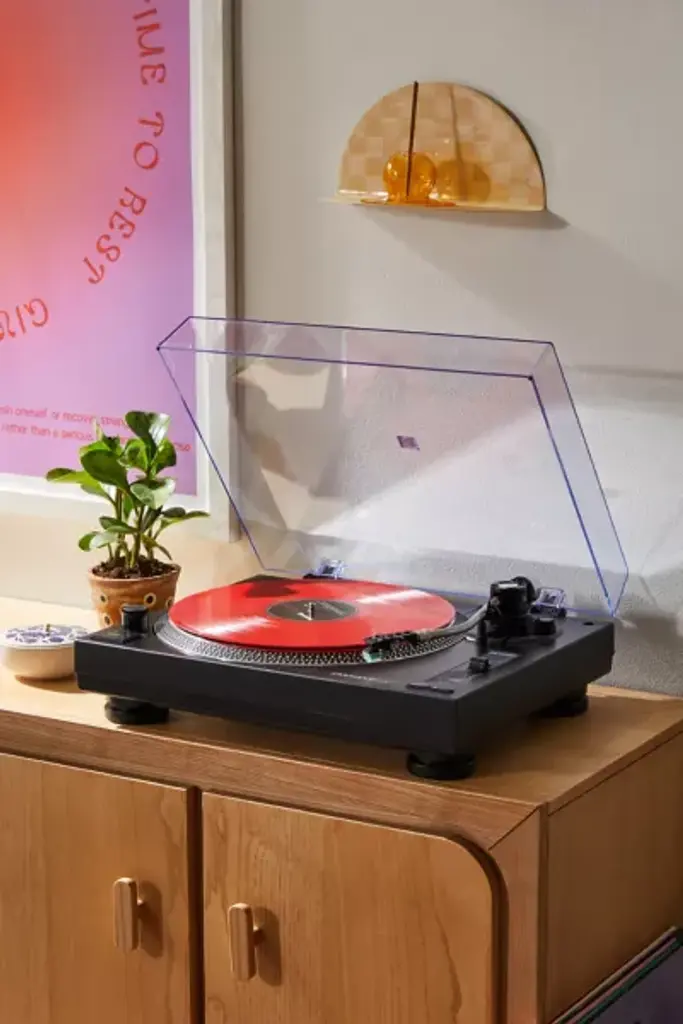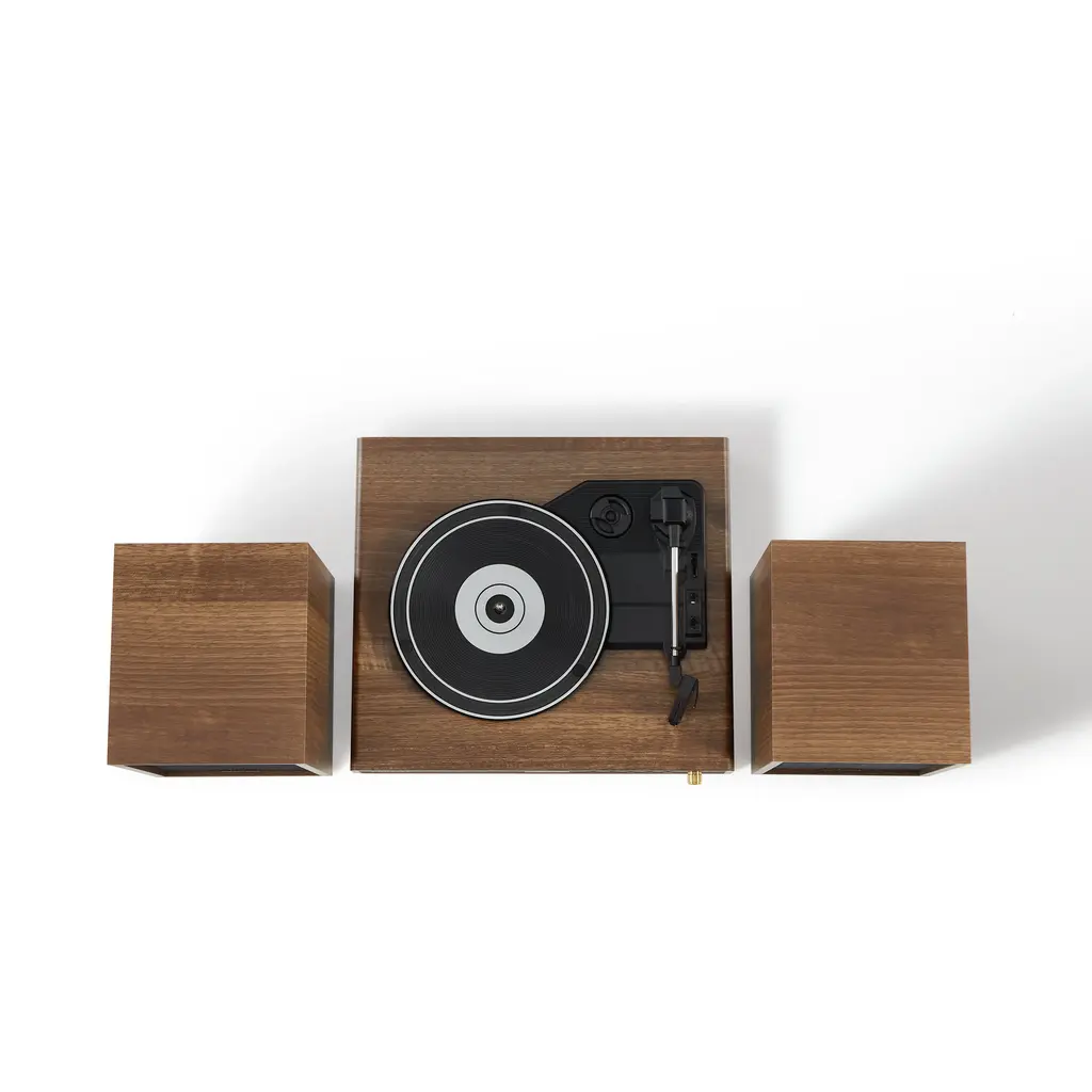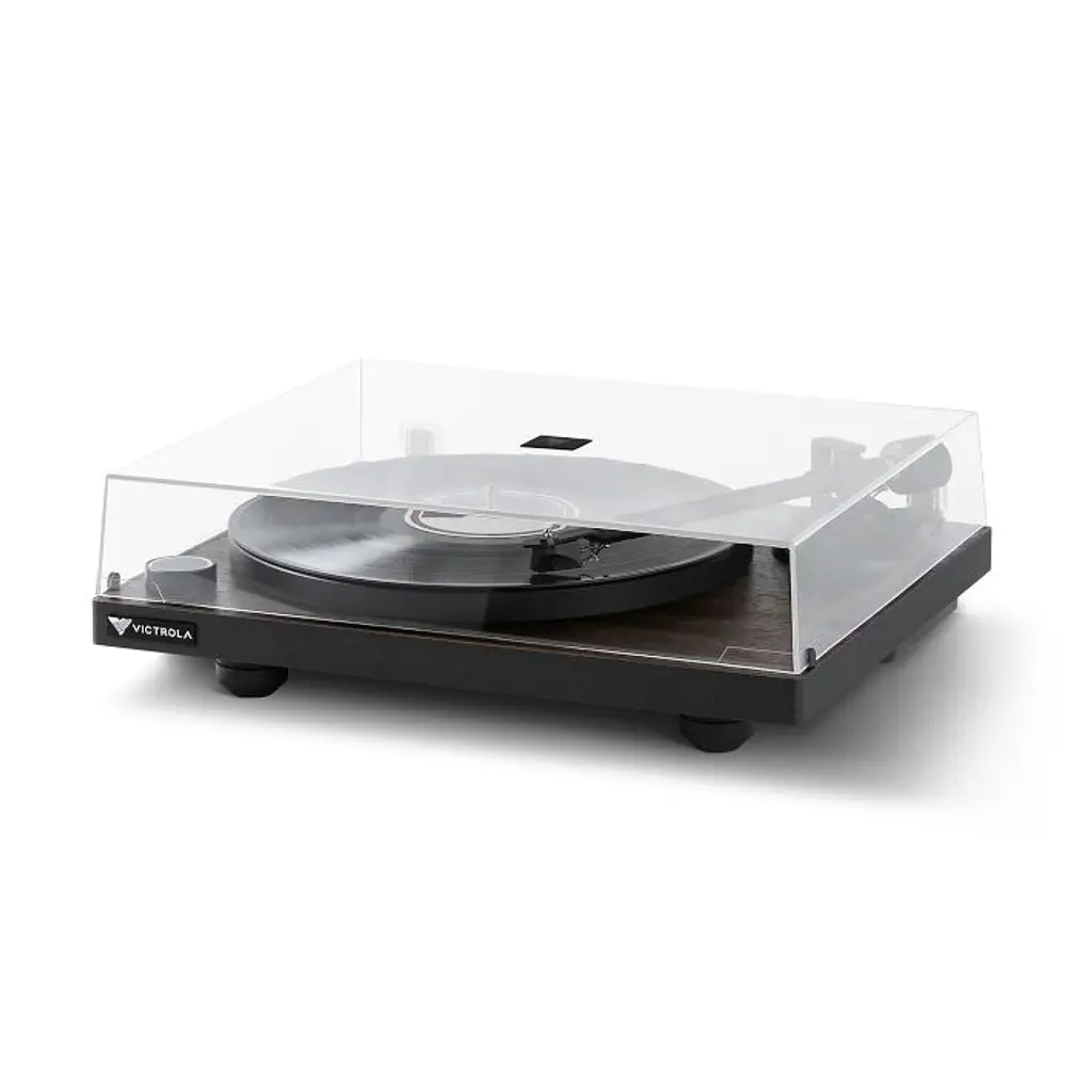 17.3"w x 19.7"d x 19.9"h. 25 lbs. MDF wooden box in an Espresso finish. Plastic accents. 2-speed belt-driven wooden turntable with aluminum platter. Victrola premiere VPC-190 moving magnetic cartridge. RCA line level, vinyl stream and subwoofer outputs. Bluetooth, aux and RCA inputs. Sold individually. Made in China.