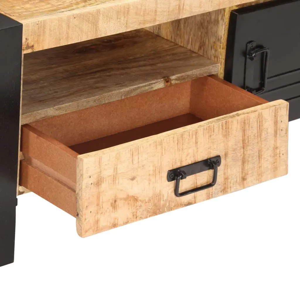 This coffee table nails both functionality and style, making it perfect for modern living areas. Its rectangular top is made from solid rough mango wood, with a warm brown finish that brings an earthy vibe to your space, while the black powder-coated iron legs add a sturdy touch and enhance its industrial look. Ample Storage: The coffee table has a handy drawer for magazines or remotes, keeping your room tidy. Heavy Weight Capacity: Made for heavy items, this table looks good and is built to last, so you can confidently place heavy decor. Sturdy Construction: With solid wood and metal, it's a durable piece that stands up to everyday use. Stylish Design: The industrial look gives it a raw, modern vibe, making it a standout in your living room. Easy Maintenance: The natural finish not only showcases the lovely wood grain but also makes it easy to clean—just dust it regularly with a soft cloth to keep it looking sharp.
